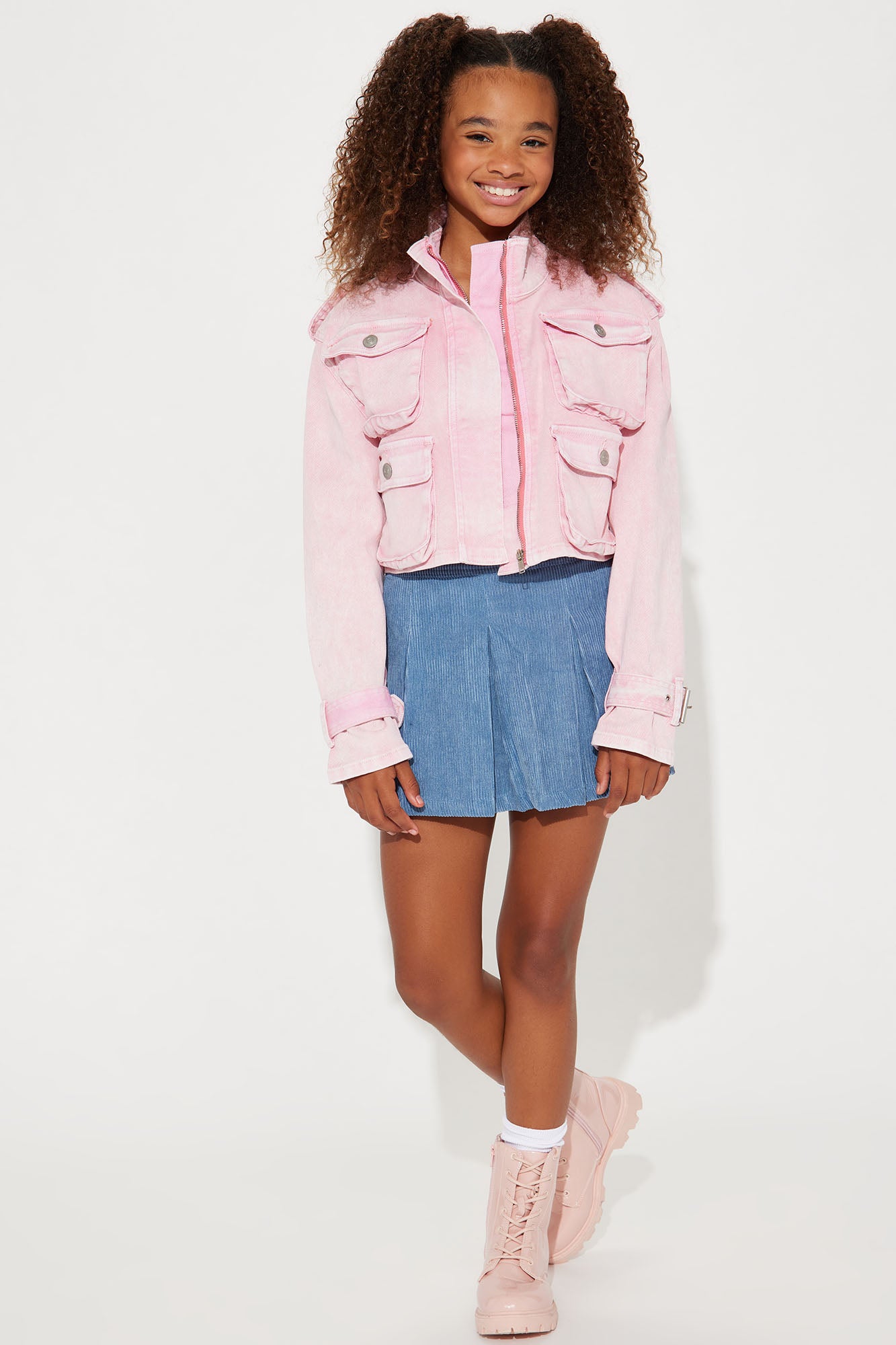 Available In Pink. Denim Jacket Collar Zip Front Cargo Pockets Sleeve Buckle Detail Stretch Mommy & Me Takedown Of "Billie Cropped Cargo Jacket" Disclaimer: Due To The Specialized Wash Process, Each Garment Is Unique. 99% Cotton 1% Spandex Imported |