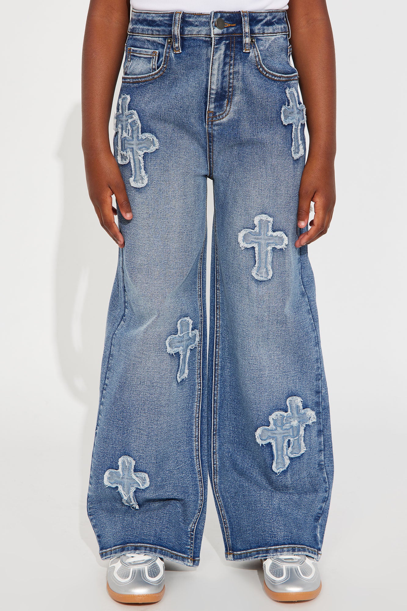 Available In Indigo. Jean Wide Leg Washed Cross Applique Detail Stretch Denim Model Wears Size 10/12 Pair To "Mini Cross Your Mind Denim Jacket" Imported 55% Cotton 28% Polyester 15% Rayon 2% Spandex |