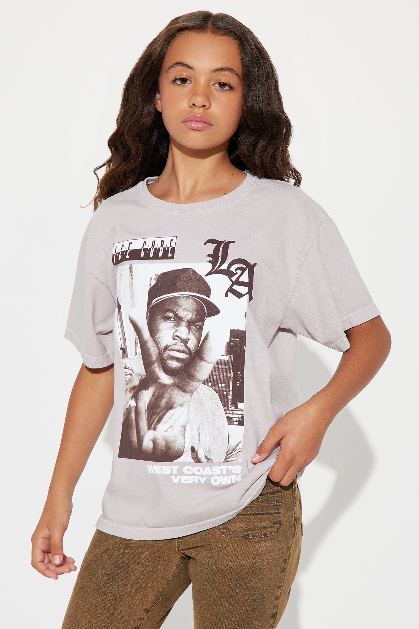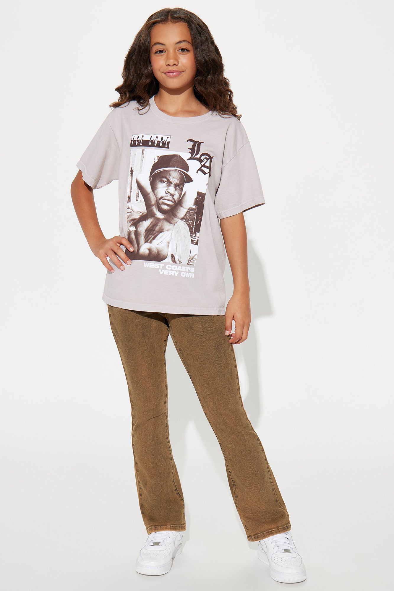 Available In Mocha. T-Shirt Short Sleeve Crew Neck Front Screen Washed Ice Cube Graphic Model Wears Size 10/12 Mommy & Me Takedown Of "Ice Cube West Coast Washed Tee" 100% Cotton Imported |