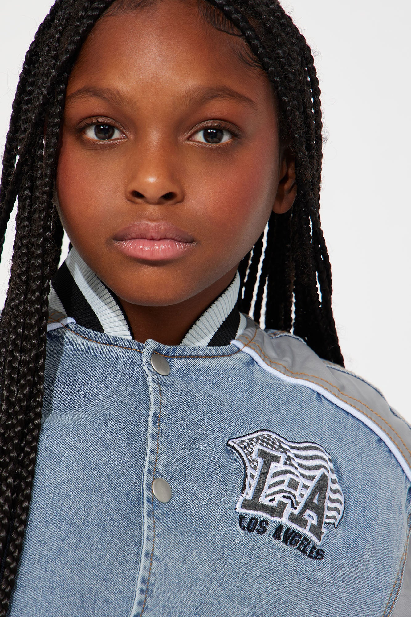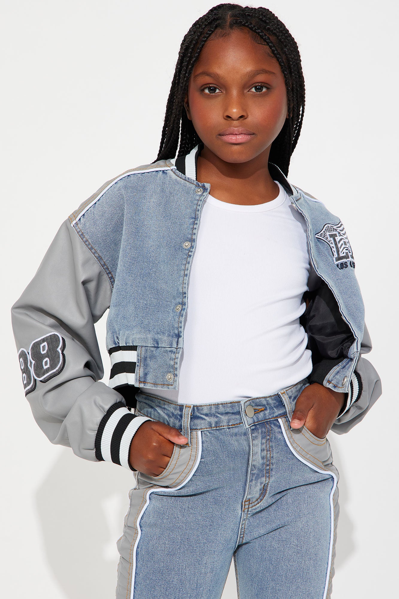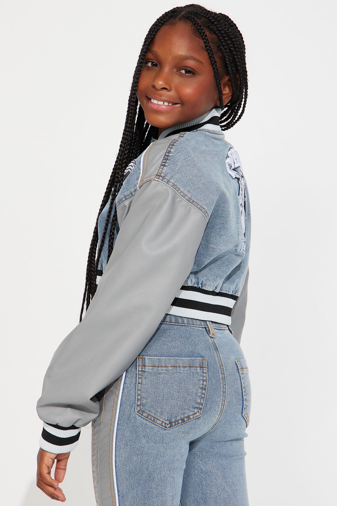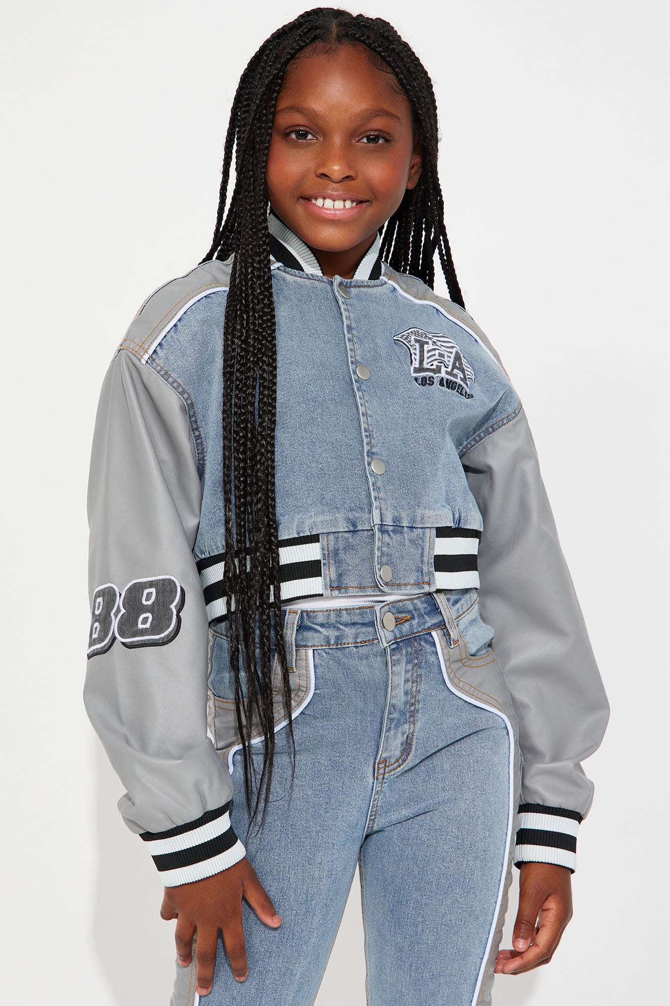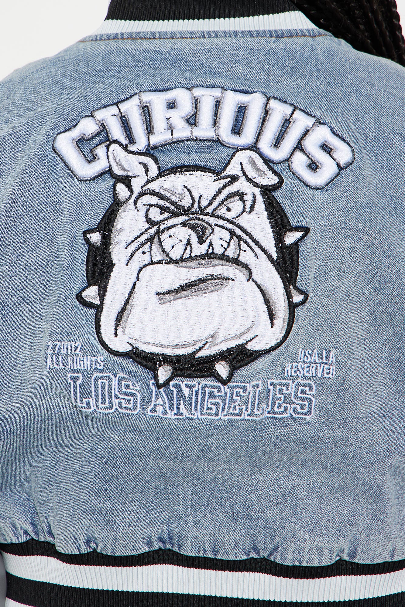 Available In Grey/combo. 2 Piece Set LA and Bulldog Graphic "Curious" Verbiage Front and Back Screen Varsity Jacket Snap Button Closure Pants with Zipper and Button Front Closure Front And Back Pant Pockets Shell: 41% Cotton 34% Polyester 24% Rayon 1% Spandex Base Fabric: 98% Polyester 2% Other Fiber Lining: 100% Polyester Coating: 100% Polyurethane Model Wears Size 10 Imported |