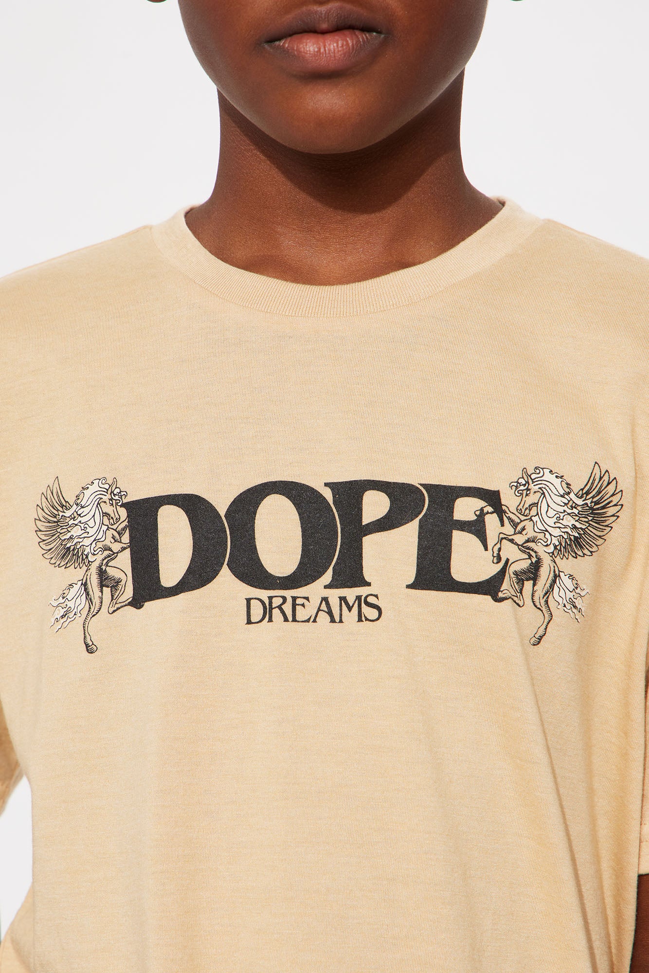 Available In Sand. Short Sleeve Crew Neck Screen Print "Dope Dreams" Verbiage 60% Cotton, 40% Polyester Model Wears Size 8/10 Daddy & Me Takedown Of " Dope Sky Has No Limit Short Sleeve Tee" Imported |