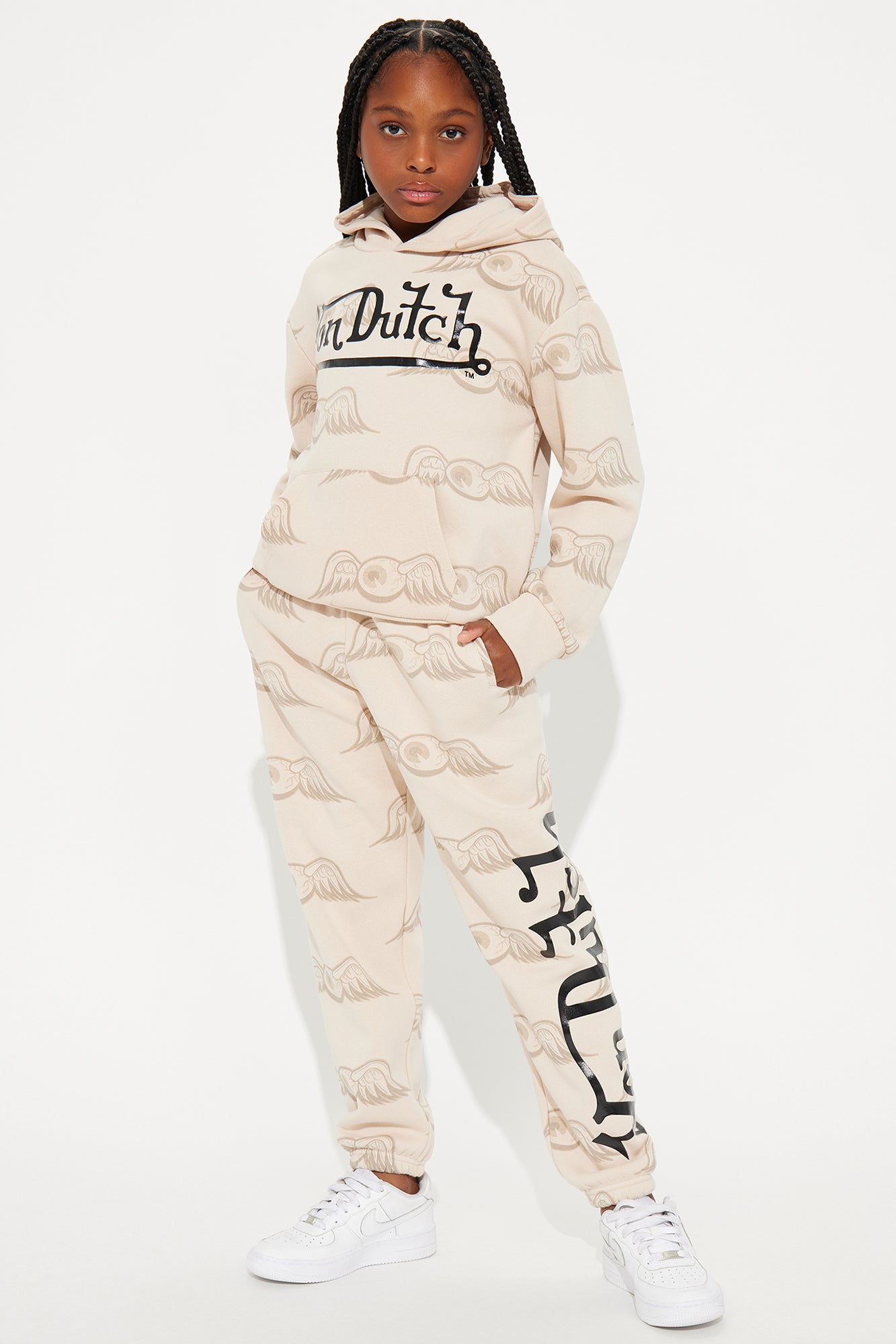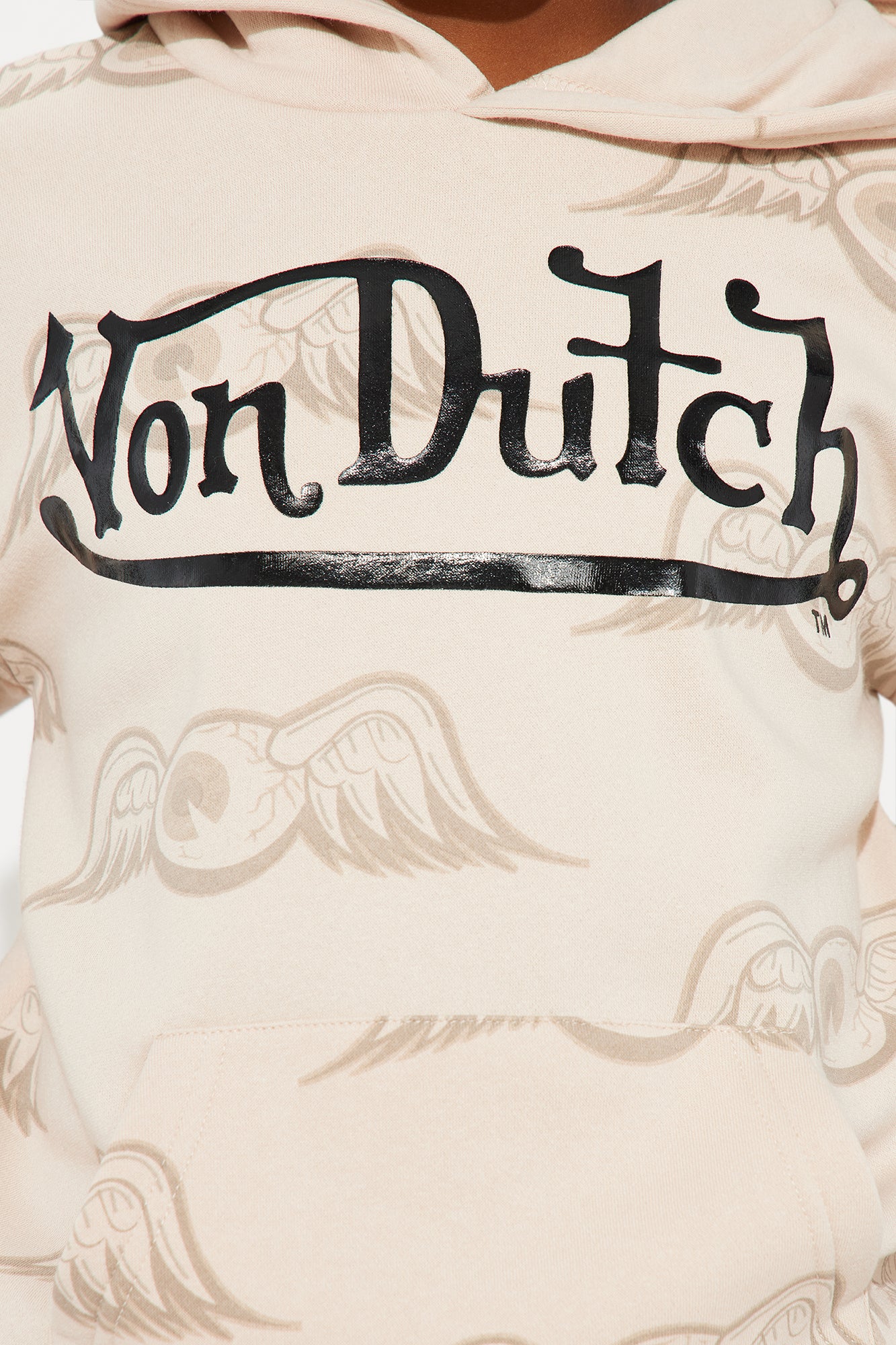 Available In Sand. Hoodie Long Sleeve Front Pouch Pockets Von Dutch Graphic Logo Novelty Print Black Foil 60% Cotton 40% Polyester Model Wears Size 10/12 Pair To "Mini Von Dutch Fly High Jogger" Mommy & Me Takedown Of "Von Dutch Fly High Hoodie" Imported |