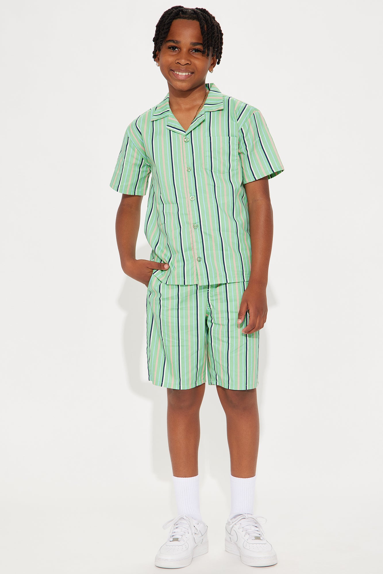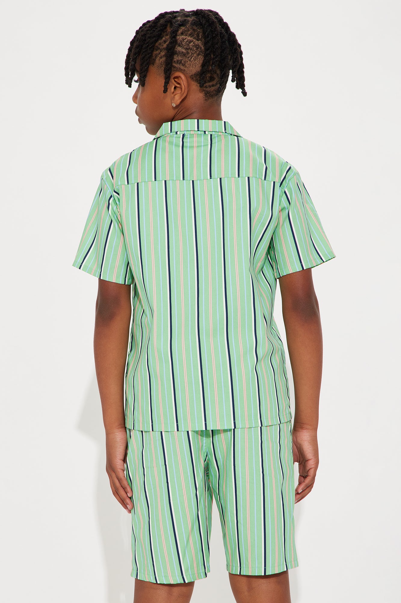 | Available In Green. 2 Piece Set Button Down Shirt Short Sleeve Collar With Front Left Pocket Shorts Foe Drawstring With Elastic Waistband Side Pockets Stripes Top And Bottom: 100% Cotton Model Wears Size 10 Imported |