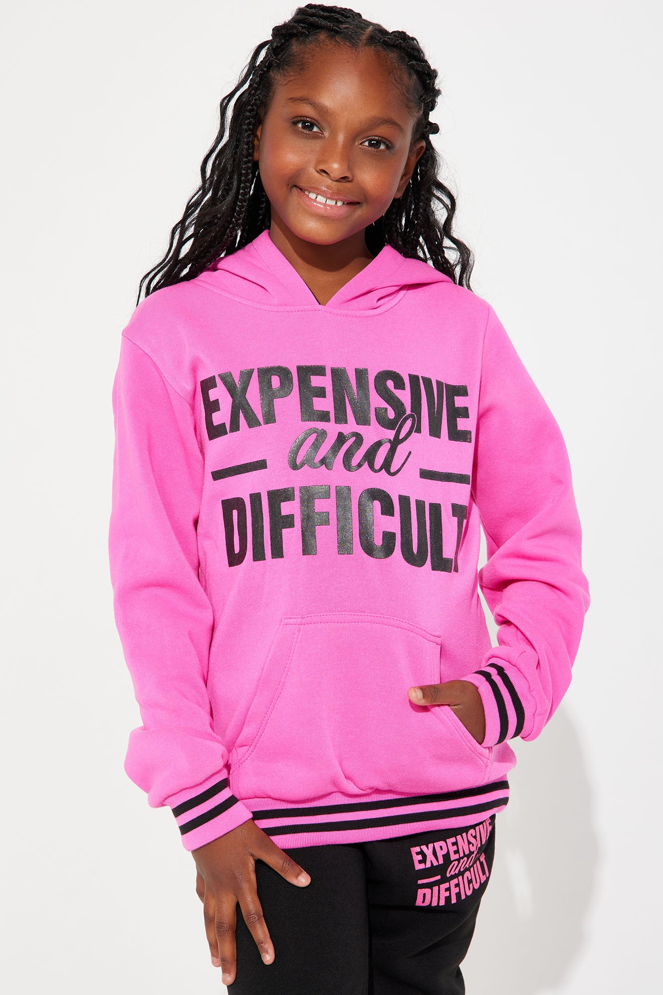 Available In Black/Pink. Long Sleeve Pullover Fleece Set Hooded "Expensive And Difficult" Verbiage Elastic Waistband Full Stretch 100% Polyester Model Wears Size 10/12 Imported |