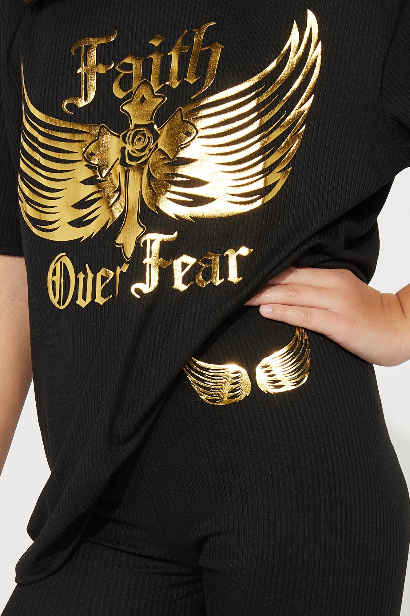 Available In Black. Matching Set Short Sleeve Crew Neck Foil "Faith Over Fear" Rib Knit Biker Short Angel Wings Screen Model Wears Size 10/12 Disclaimer: Due To The Printing Process A Difference In Saturation May Occur. Each Garment Is Unique. 96% Polyester 4% Spandex Made In USA |