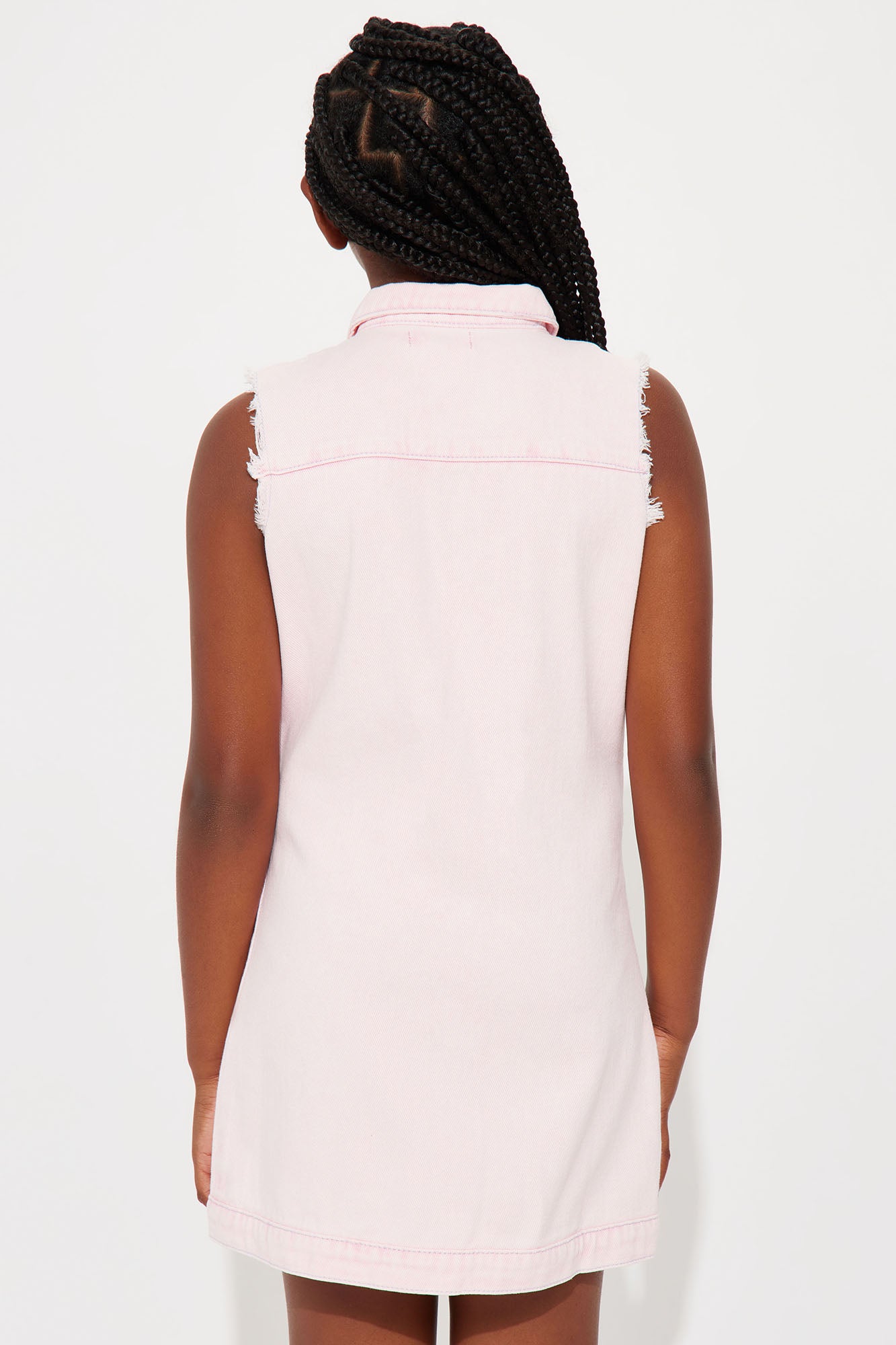 Available In Pink. Denim Dress Frayed Washed Collar Buttons Detail On Front Two Front Pockets 100% Cotton Model Wears Size 10/12 Imported |