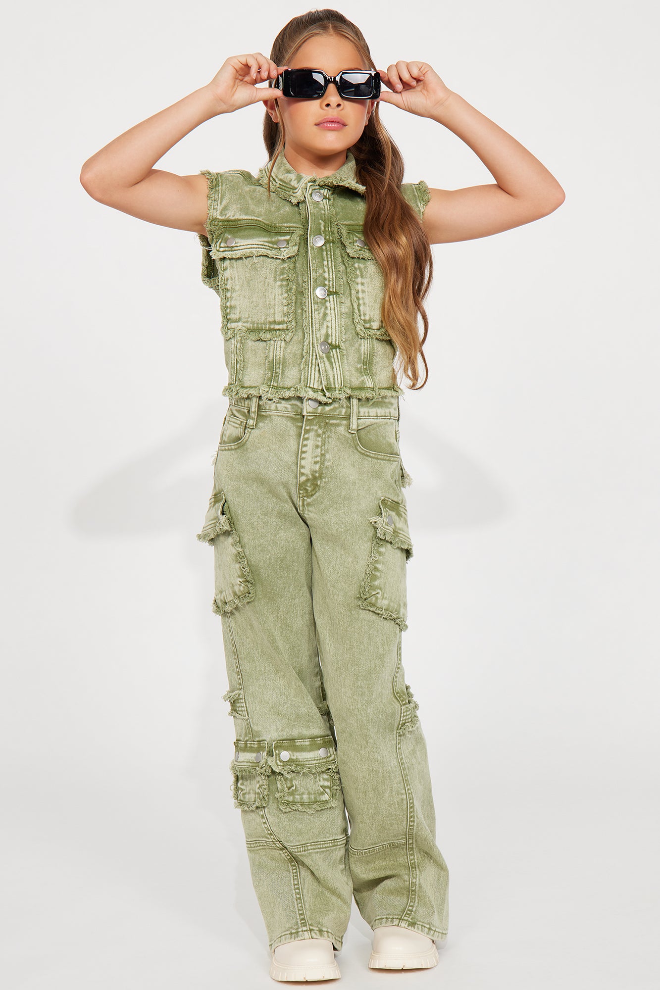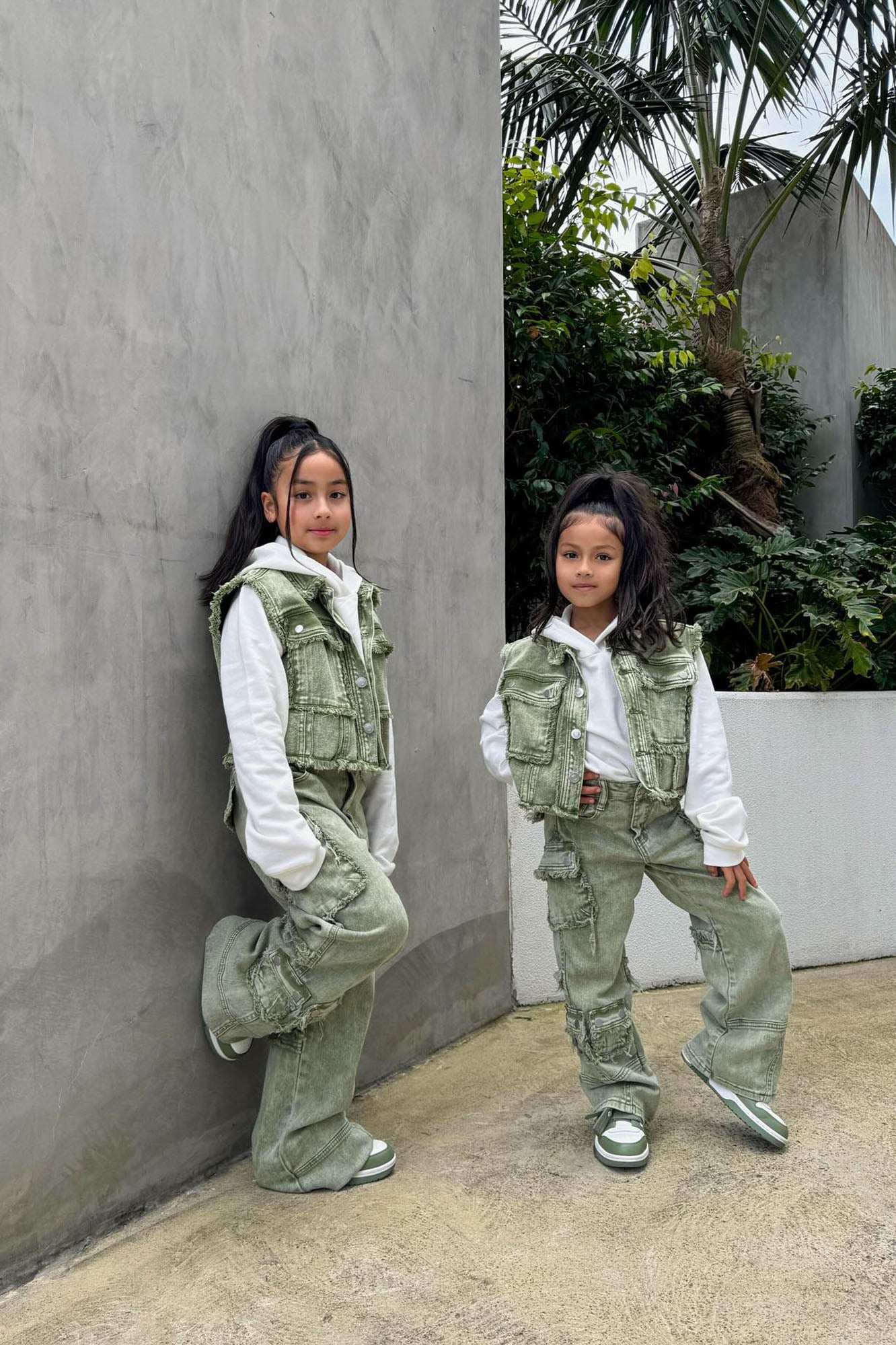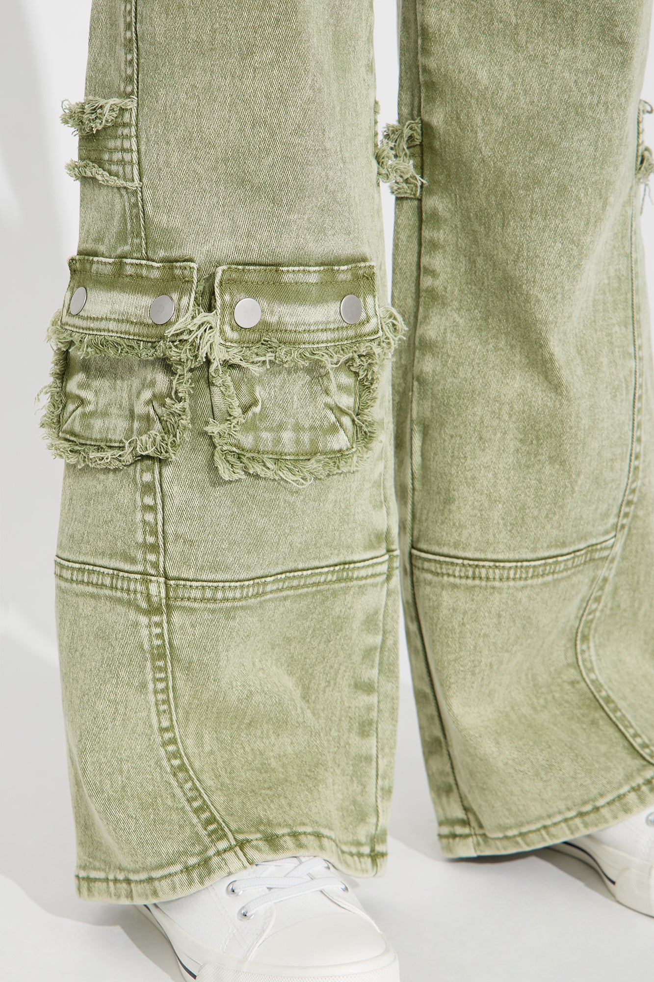 Available In Green. Cargo Jeans Mid Rise Solid Wide Leg Button Closure Denim Stretch Cargo Pockets Pair With "Mini Gillie Cargo Fray Pocket Vest" 98% Cotton 2% Spandex Model Wears Size 10 Imported |