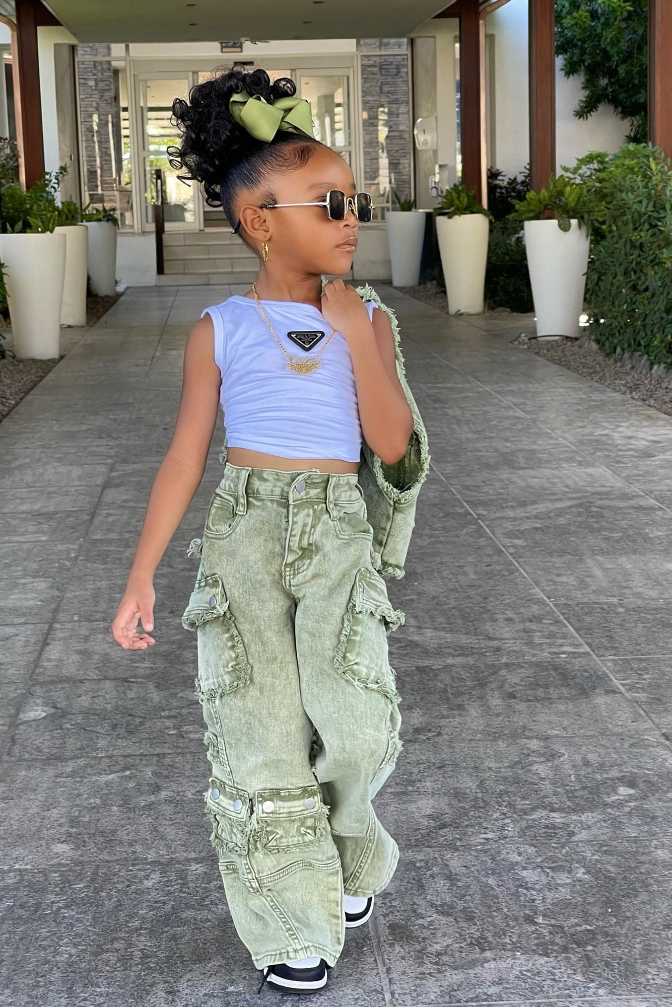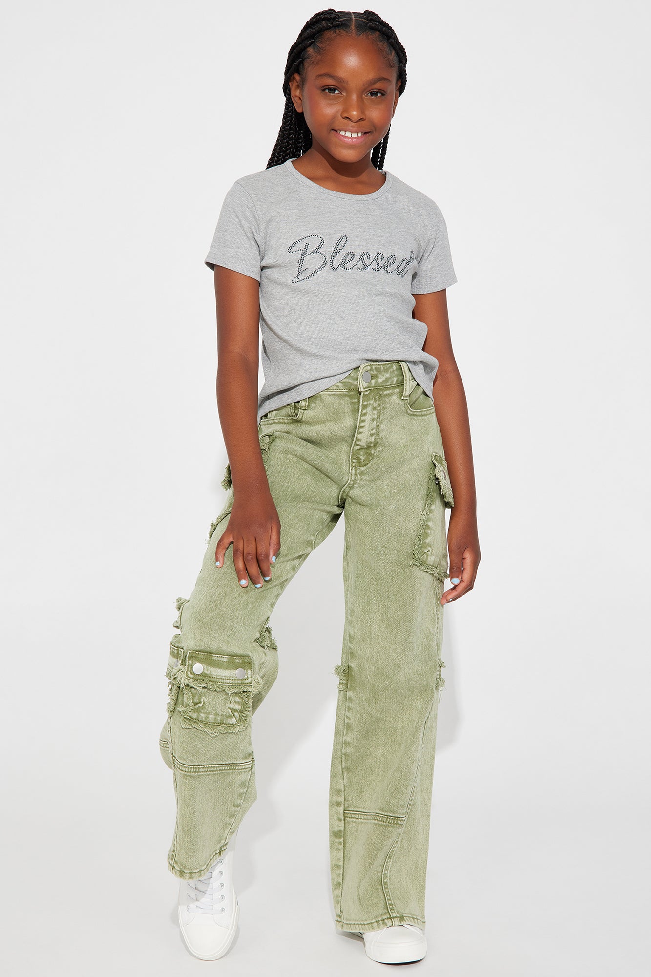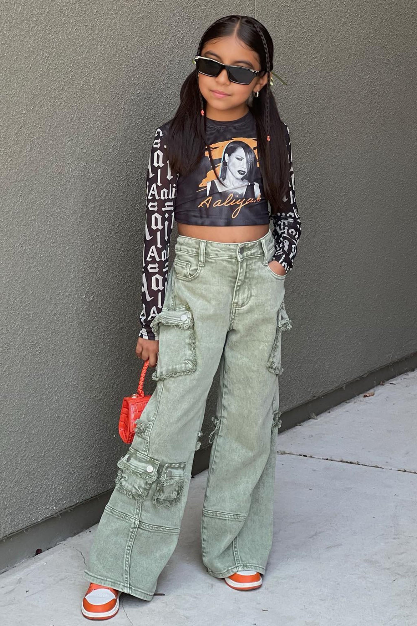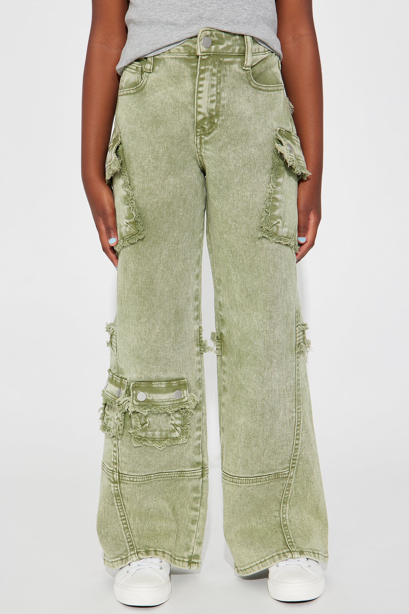 Available In Green. Cargo Jeans Mid Rise Solid Wide Leg Button Closure Denim Stretch Cargo Pockets Pair With "Mini Gillie Cargo Fray Pocket Vest" 98% Cotton 2% Spandex Model Wears Size 10 Imported |
