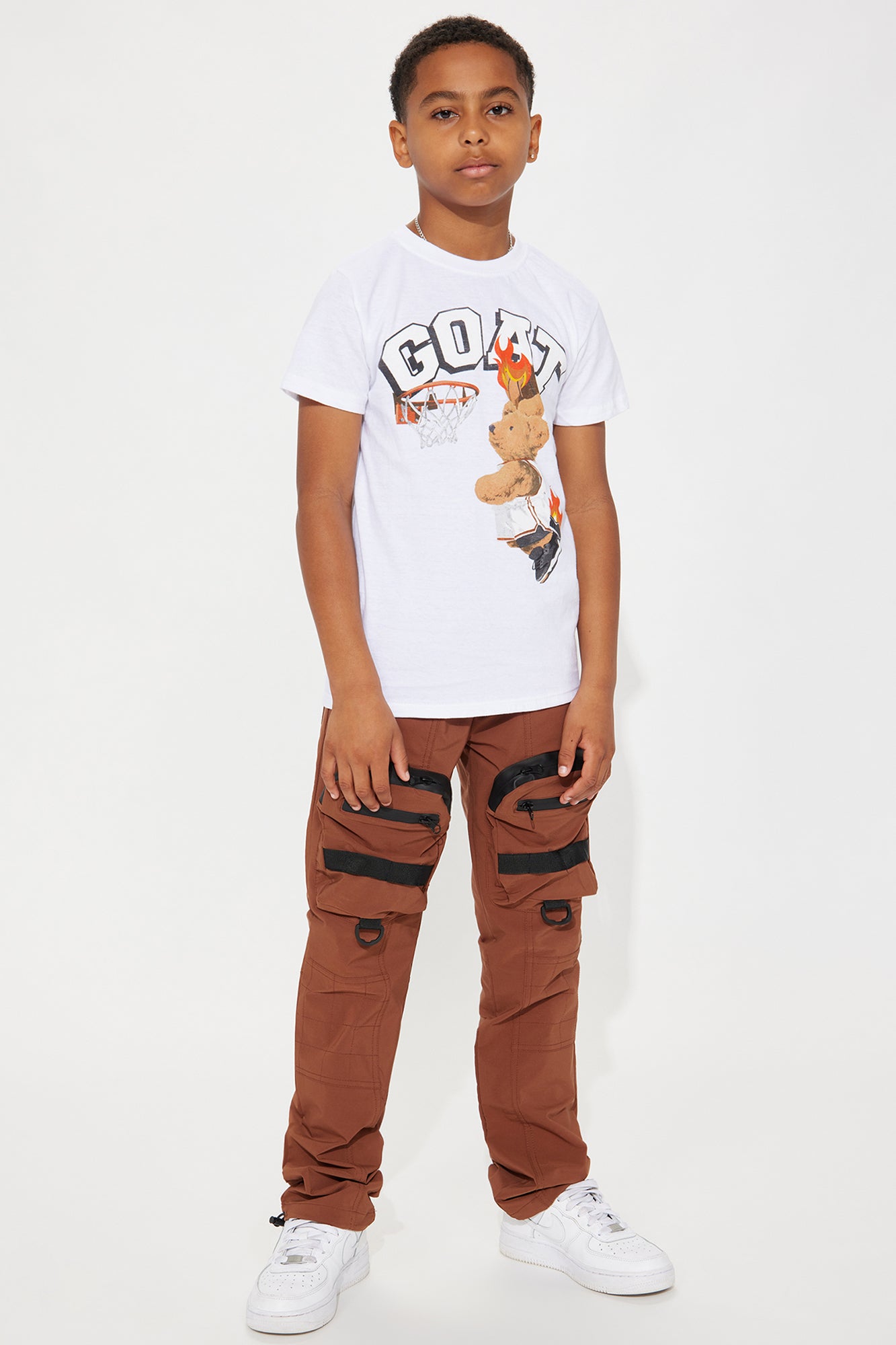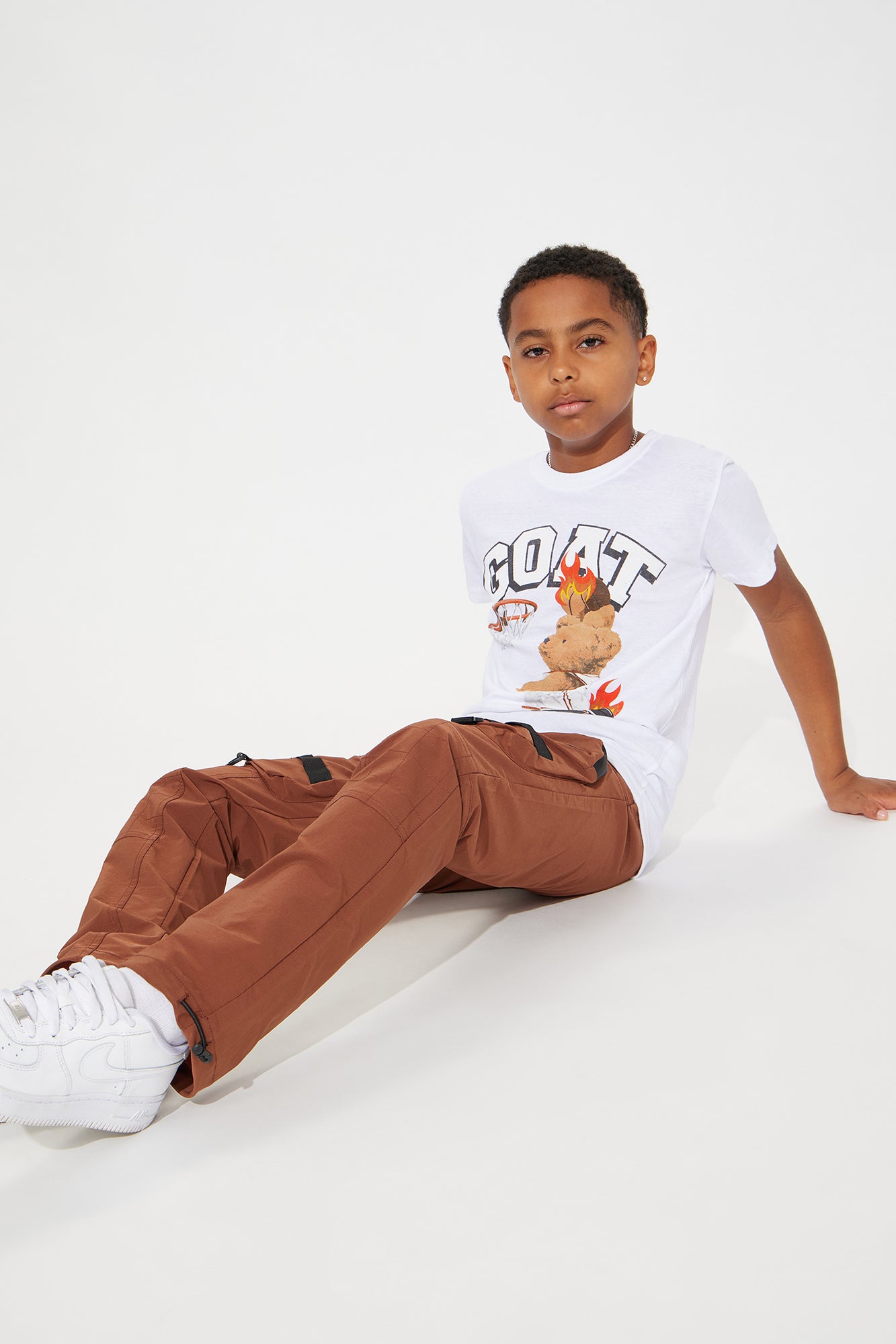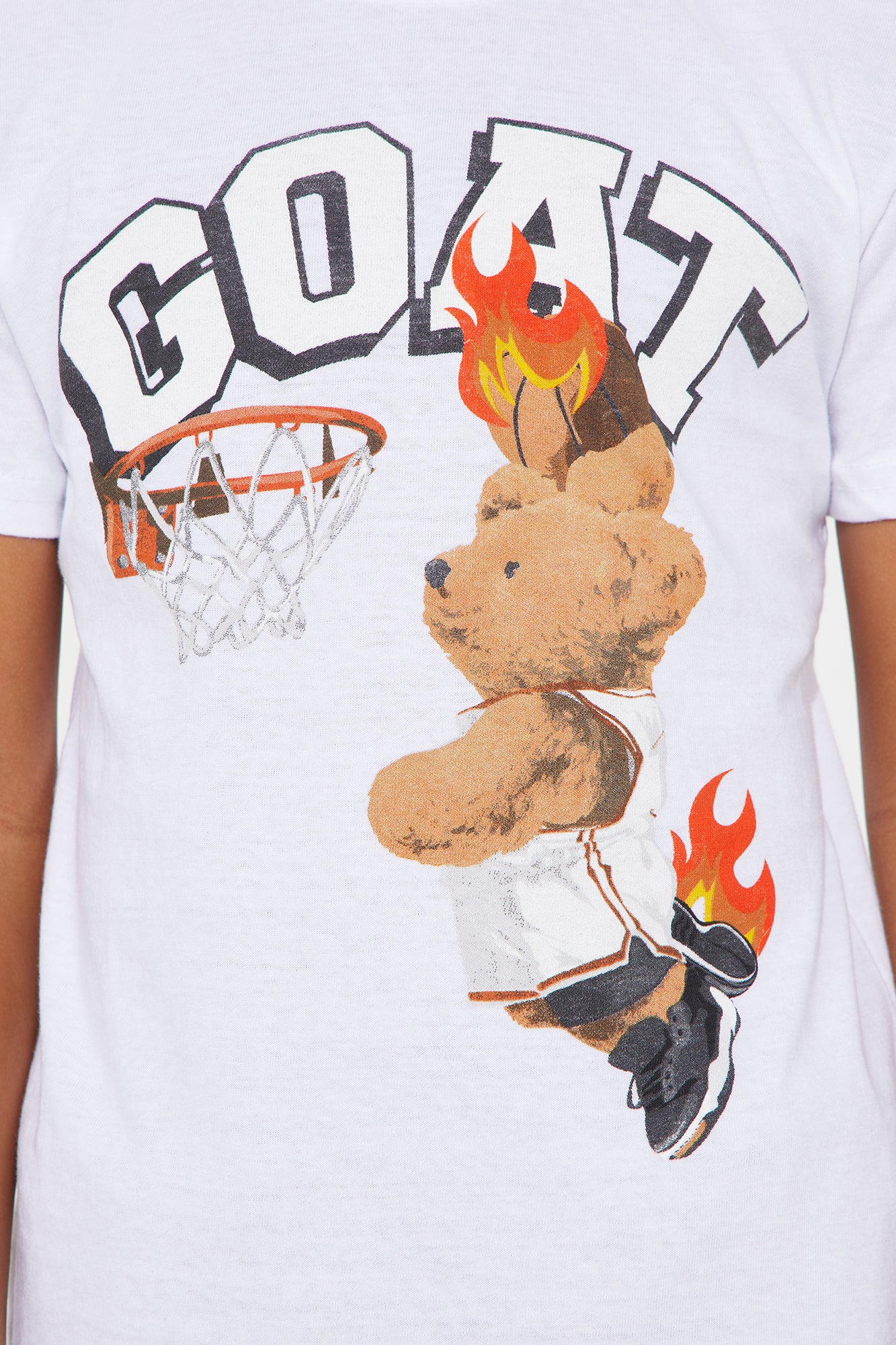 Available In White. Short Sleeve Crew Neck Screen Print "GOAT" Verbiage Model Wears Size M S= (6/7) M= (8/10) L = (12/14) XL= (16/18) Disclaimer: Due To The Printing Process A Difference In Saturation May Occur. Each Garment Is Unique. 100% Cotton Imported |