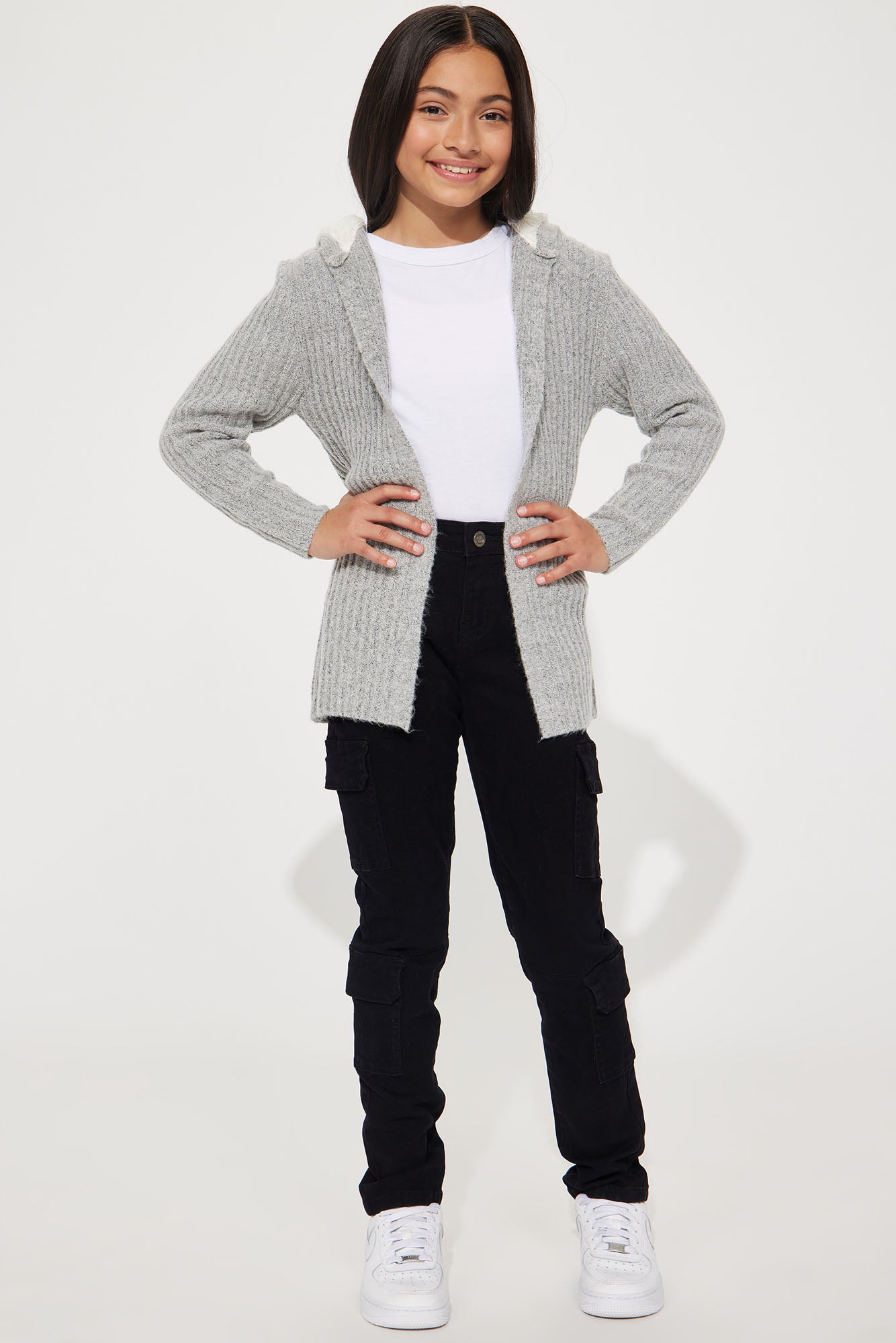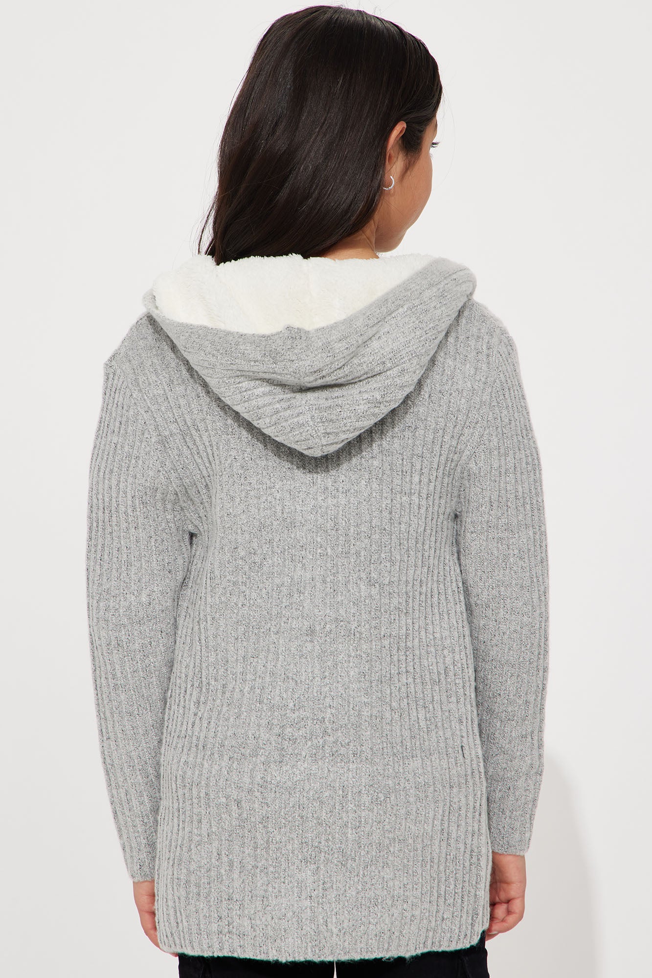 Available In Grey. Cardigan Solid Open Front Fur Lined Hood Detail Mommy & Me Takedown Of "Far Gone Hooded Cardigan" Body: 78% Acrylic 19% Polyester 3% Spandex Hood Lining: 100% Polyester Imported |