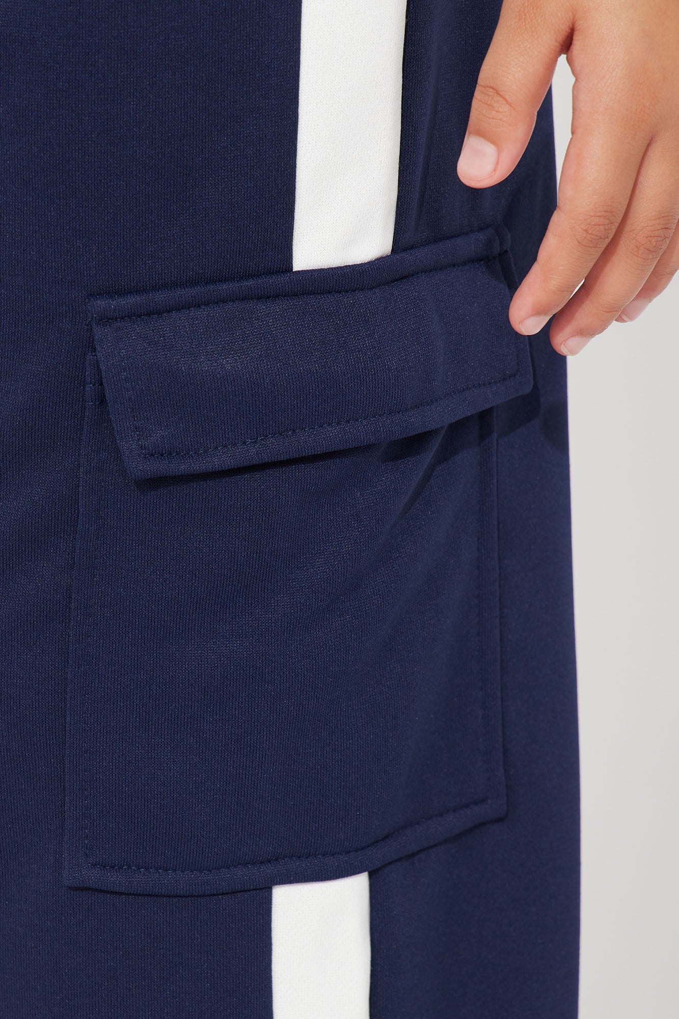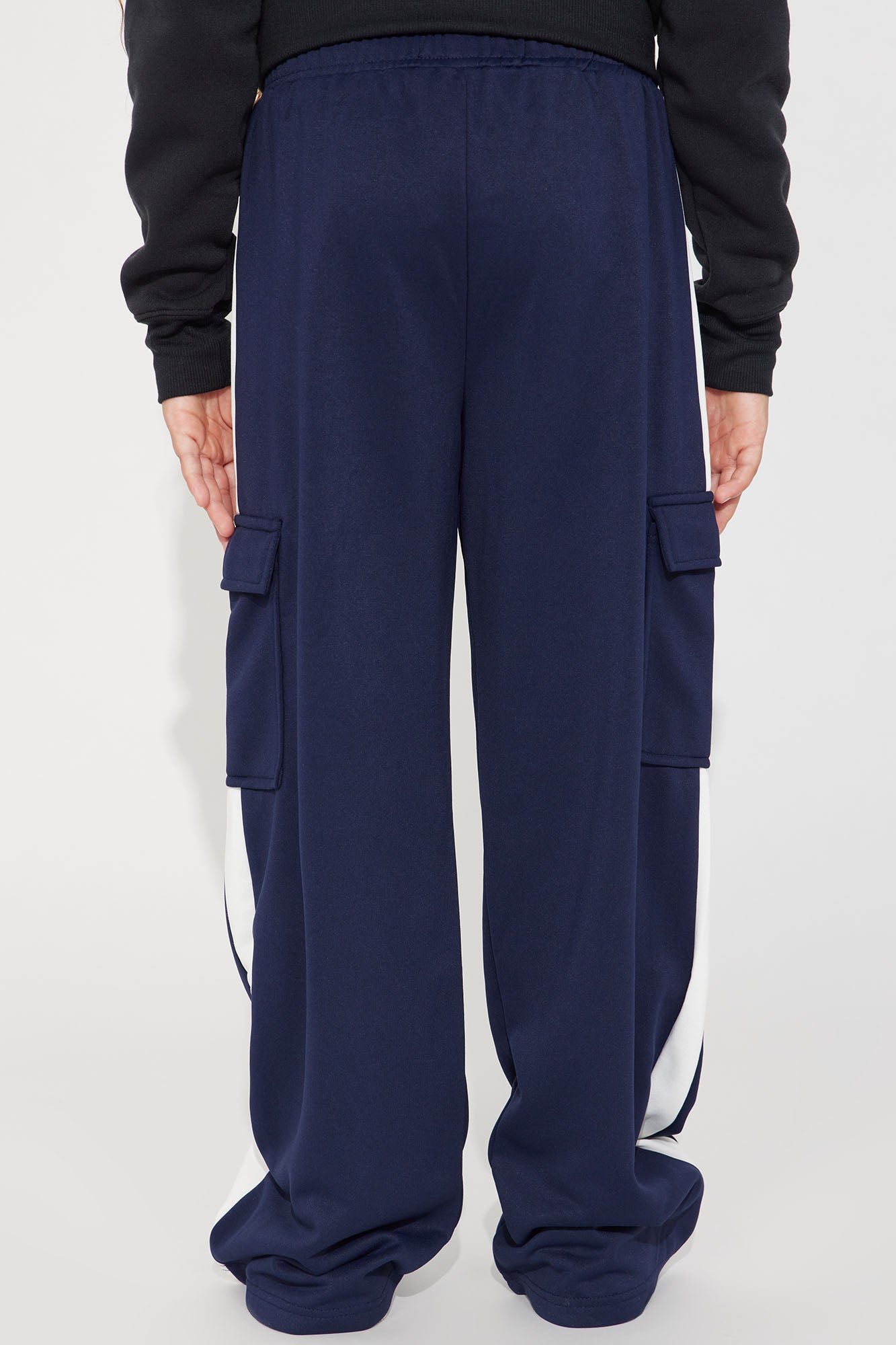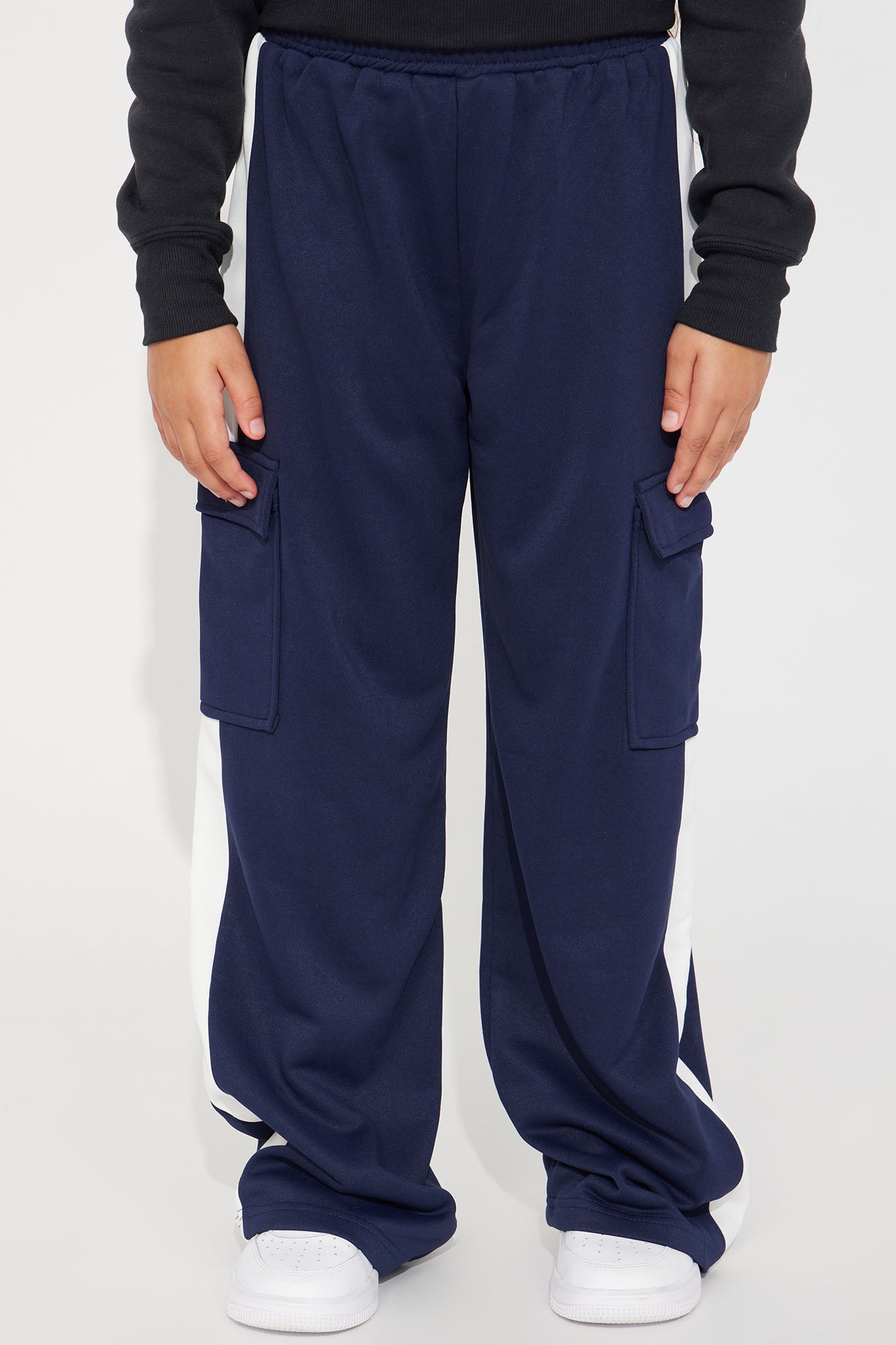 Available In Navy. Lounge Pant Side Stripe Detail Cargo Pockets Wide Leg Model Wears Size 10/12 Mommy & Me Takedown Of "Grace Cargo Lounge Pant" 100% Polyester Imported |