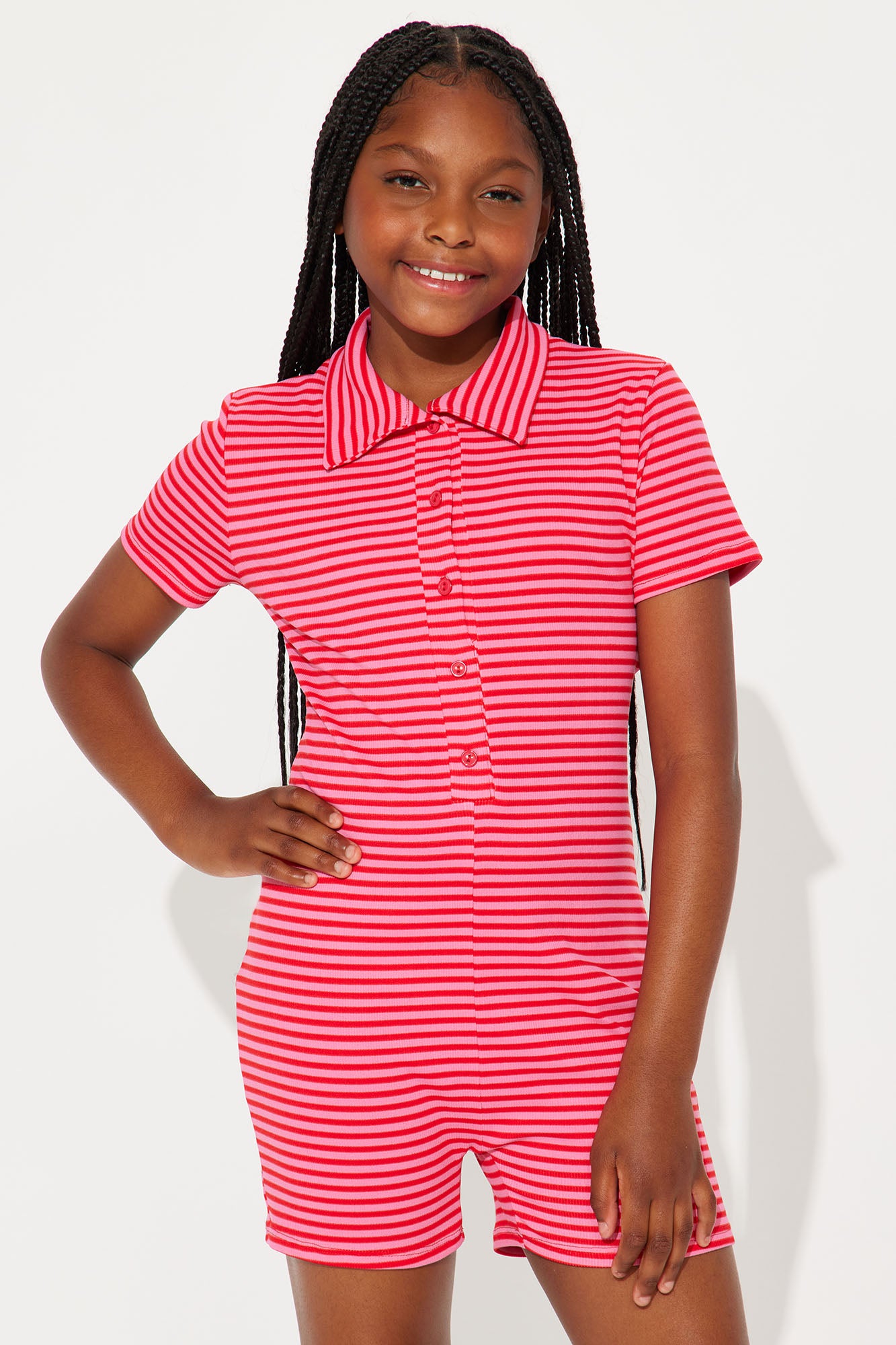 Available In Red/combo. Romper Short Sleeve Collar Button Front Closure Stripes Model Wears Size 10/12 95% Polyester 5% Spandex Mommy & Me Takedown Of "Just In Time Striped Romper" Imported |