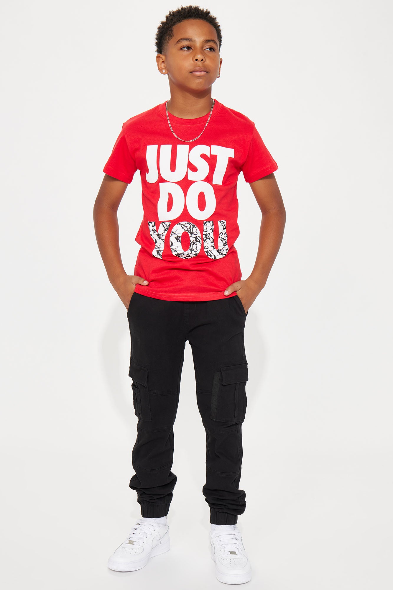 Available In Red. T-Shirt Short Sleeve Front Screen Crew Neck "Just Do You" Verbiage Model Wears Size 8/10 100% Cotton Imported |