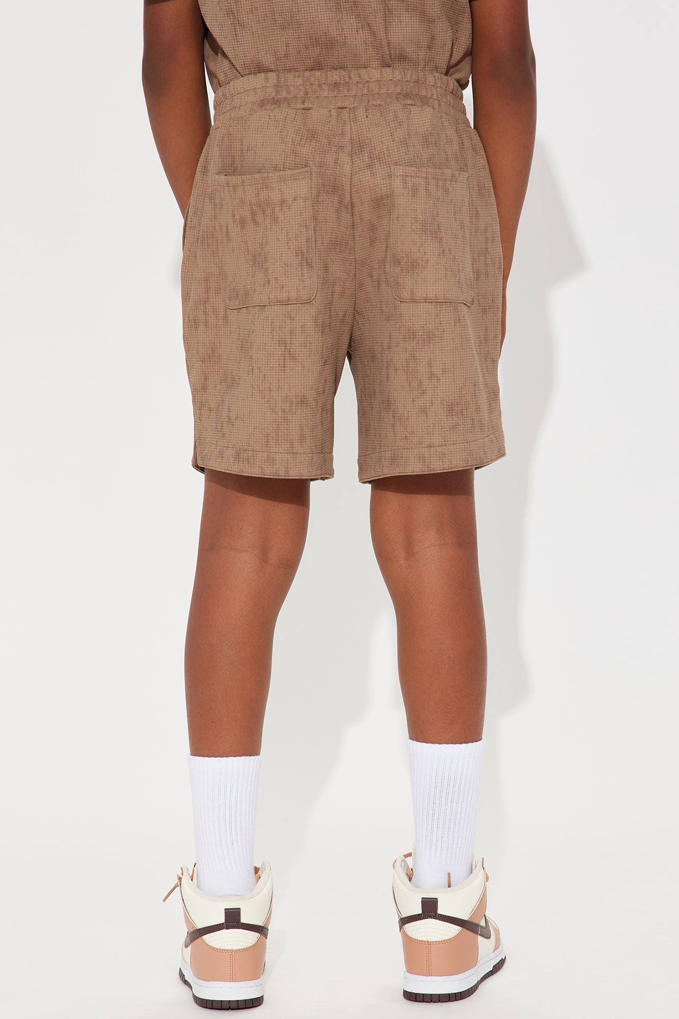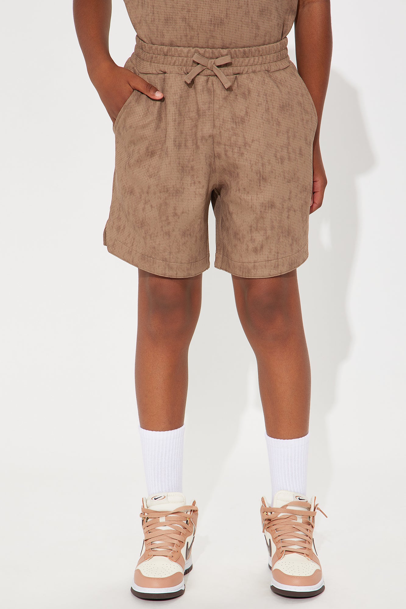 Available In Brown. Shorts Waffle Texture Side Pockets Elastic Waistband With Foe Drawstring Shell: 99% Polyester 1% SpandexLining: 100% Polyester Model Wears Size 8/10 Daddy & Me Takedown Of "Kerwin Waffle Texture Warm Up Shorts" Pair With "Mini Kerwin Waffle Texture Short Sleeve Tee" Imported |