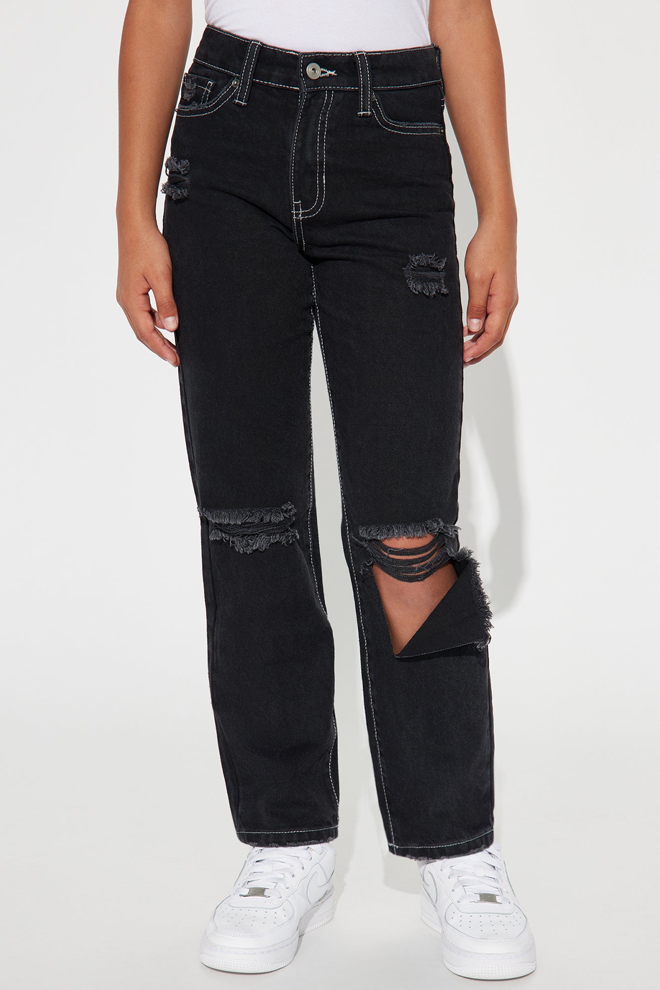 Available In Black. Straight Leg Jean Non Stretch Denim Distressed 5 Pocket Model Wears Size 10 Mommy & Me Takedown of " Leave It To Me Straight Leg Jeans" 100% Cotton Imported |