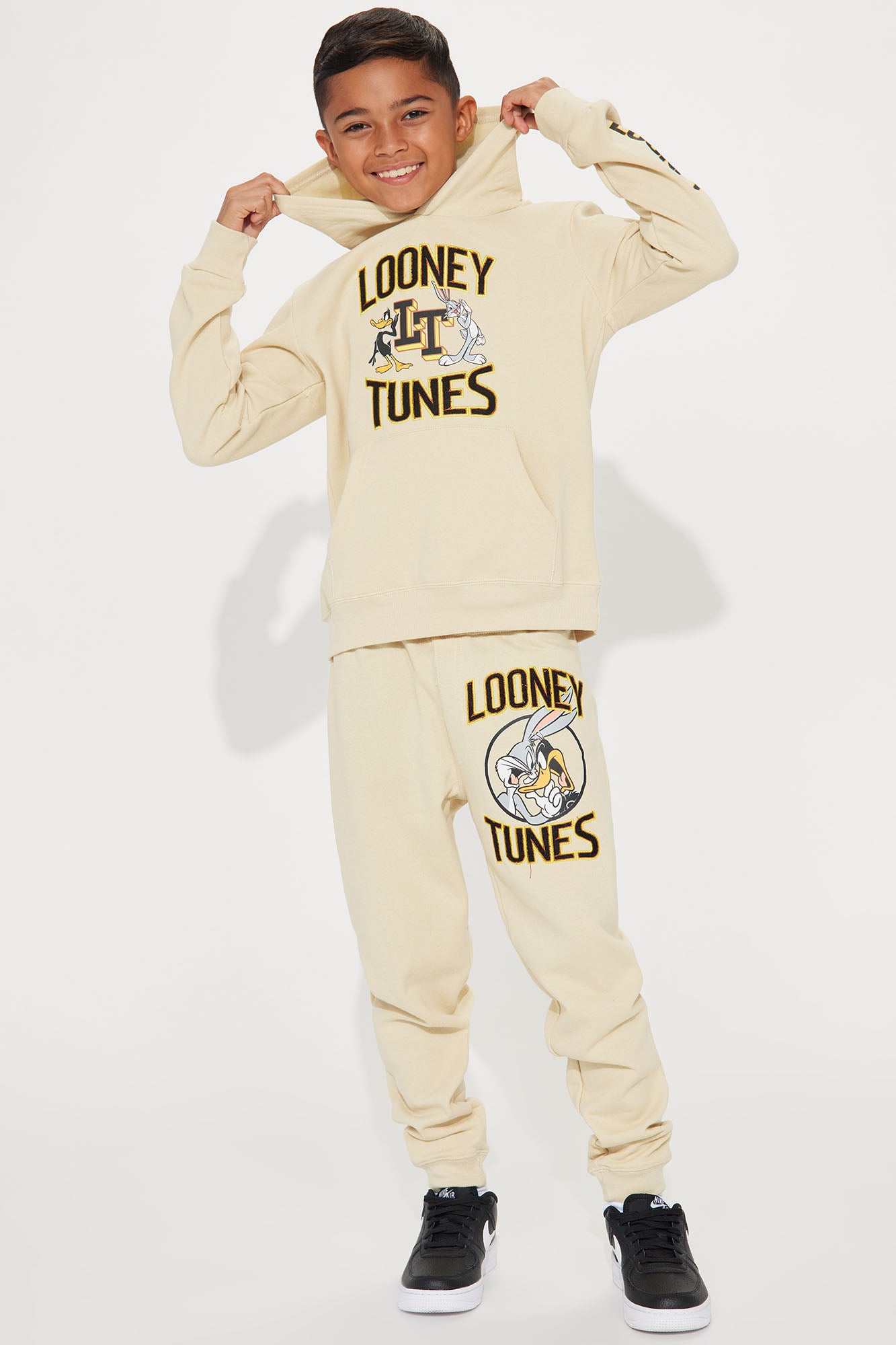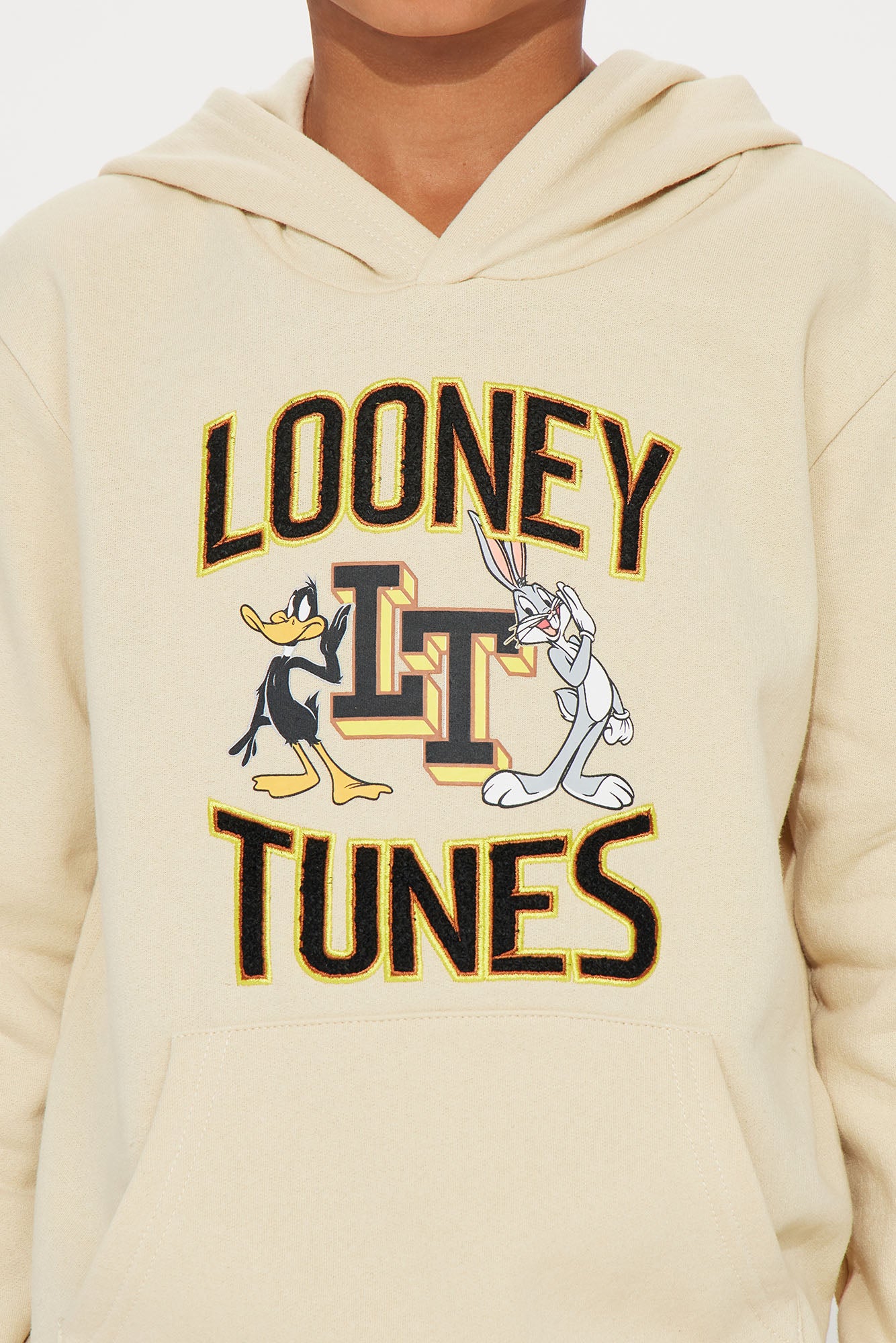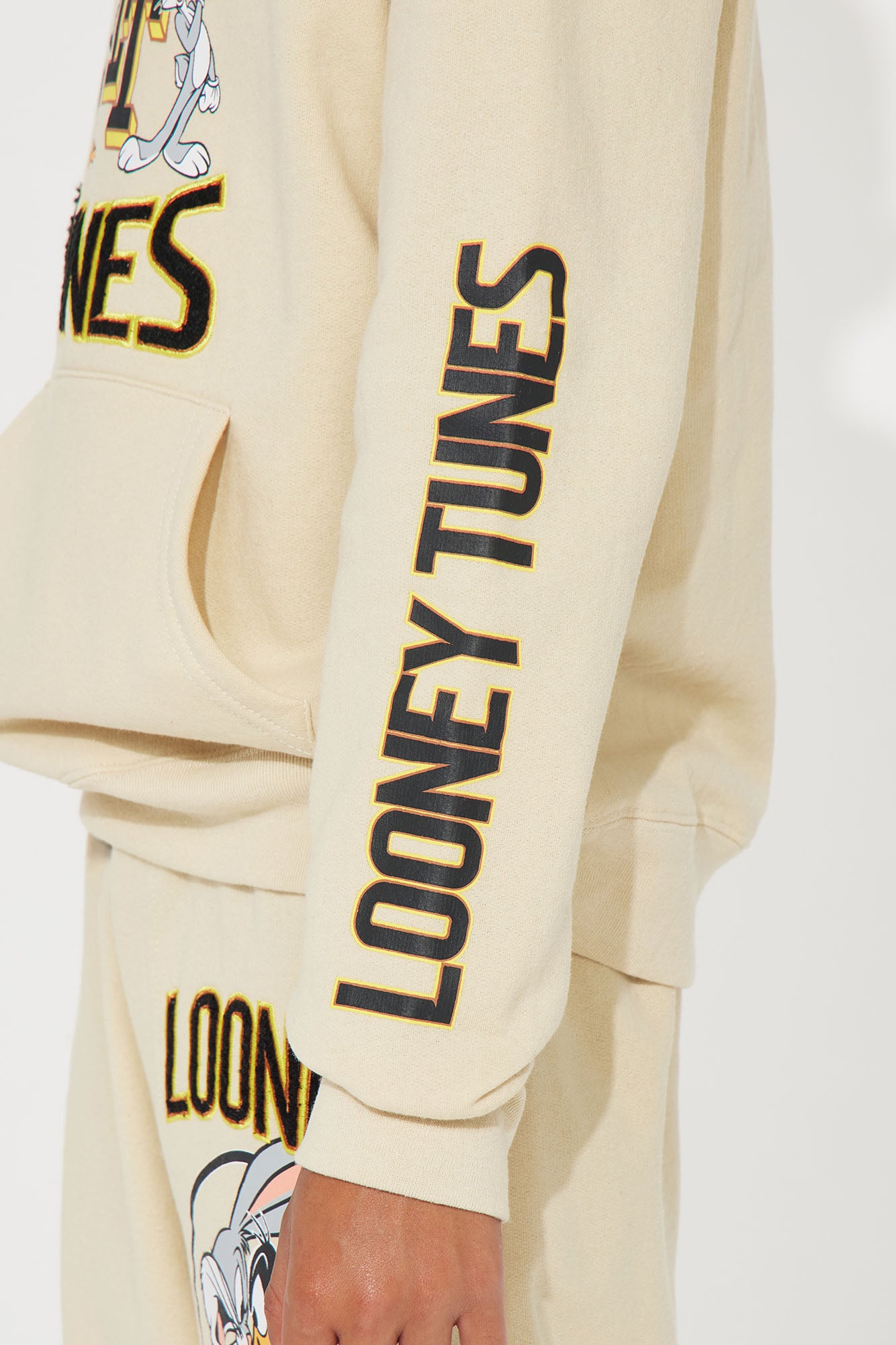 Available In Sand. Screen Top Fleece Hoodie Looney Tunes Graphic Chenille Daddy & Me Takedown Of "Looney Tunes Chenille Hoodie" Disclaimer: Due To The Printing Process A Difference In Saturation May Occur. Each Garment Is Unique.? 60% Cotton 40% Polyester Imported |