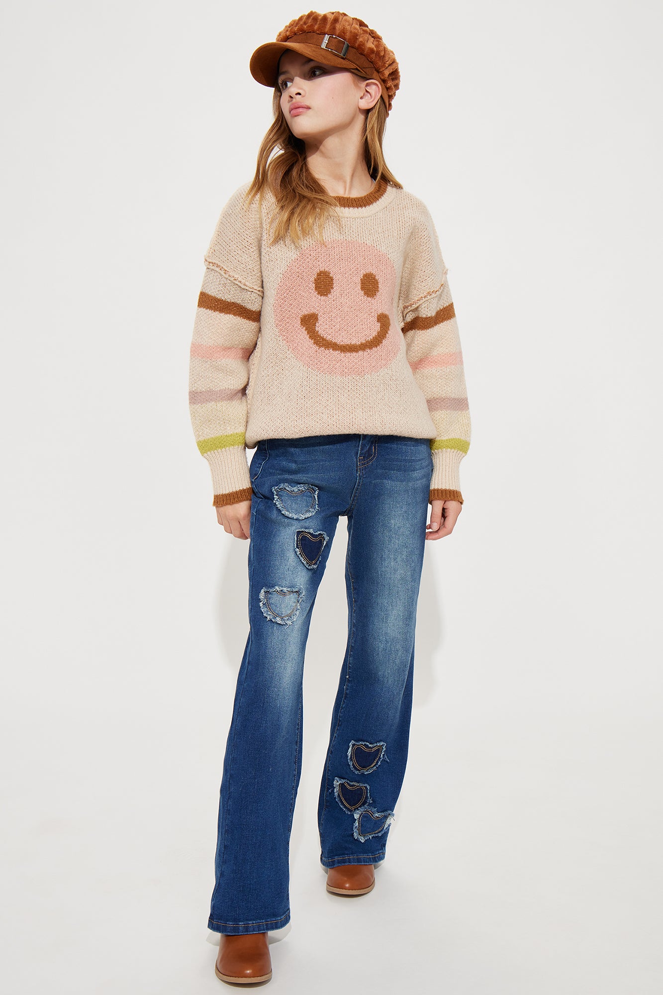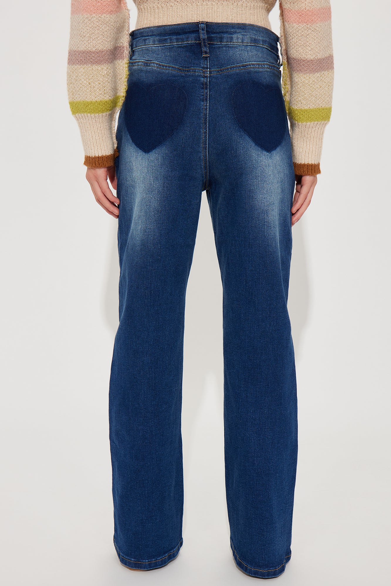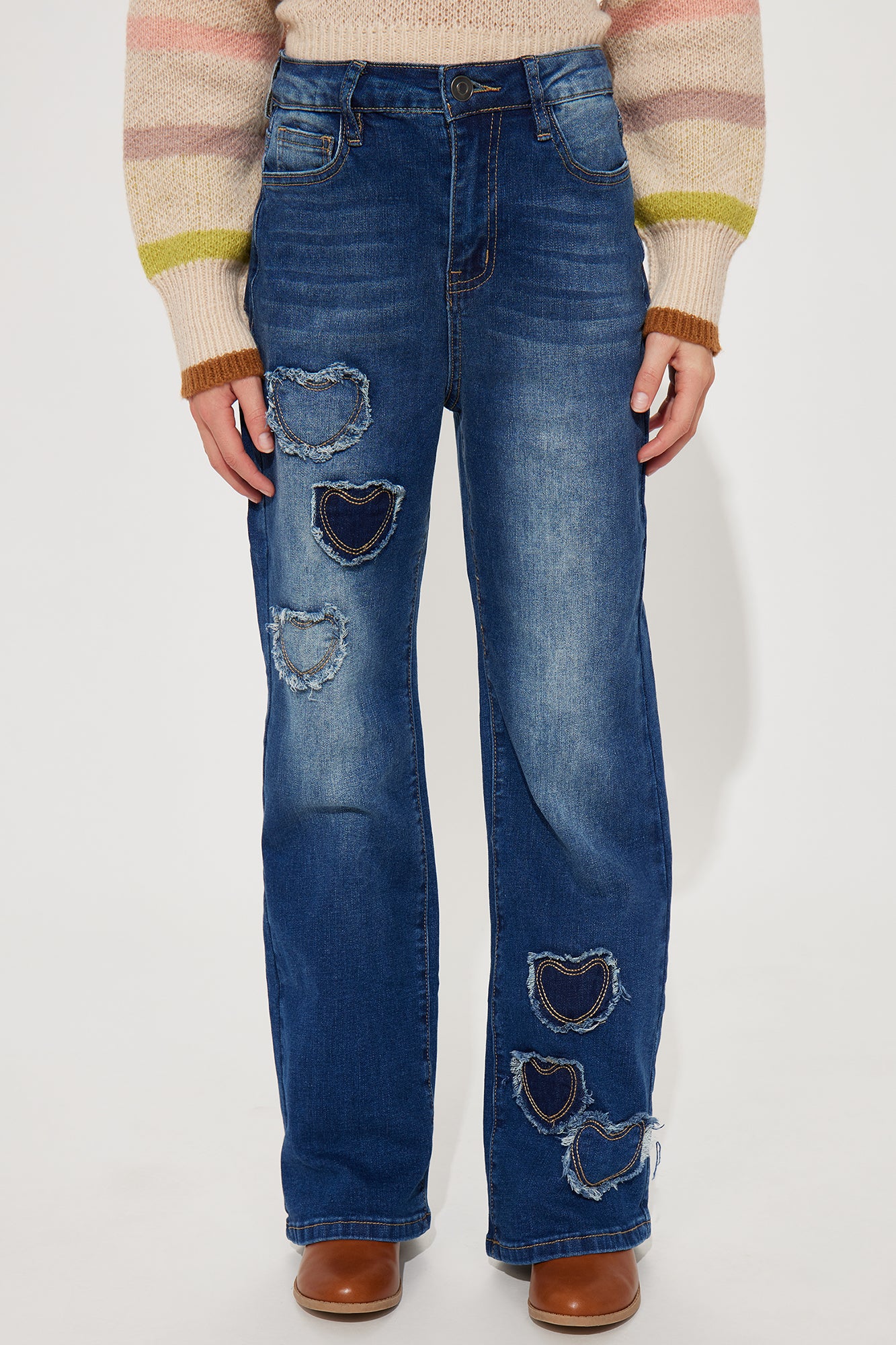 Available In Medium Wash. Flare Jeans Frayed Heart Detail Button and Zip Closure 70% Cotton, 28% Polyester, 2% Spandex Model Wears Size 10 Imported |