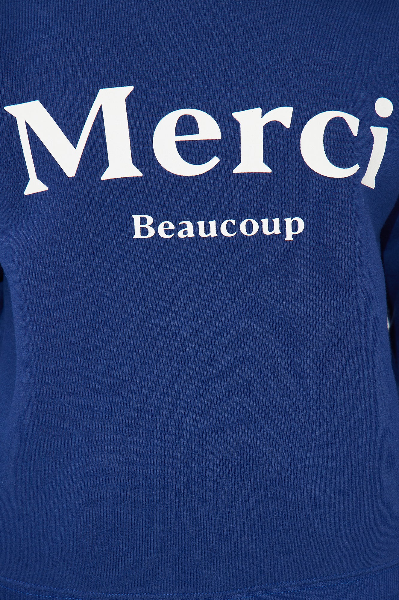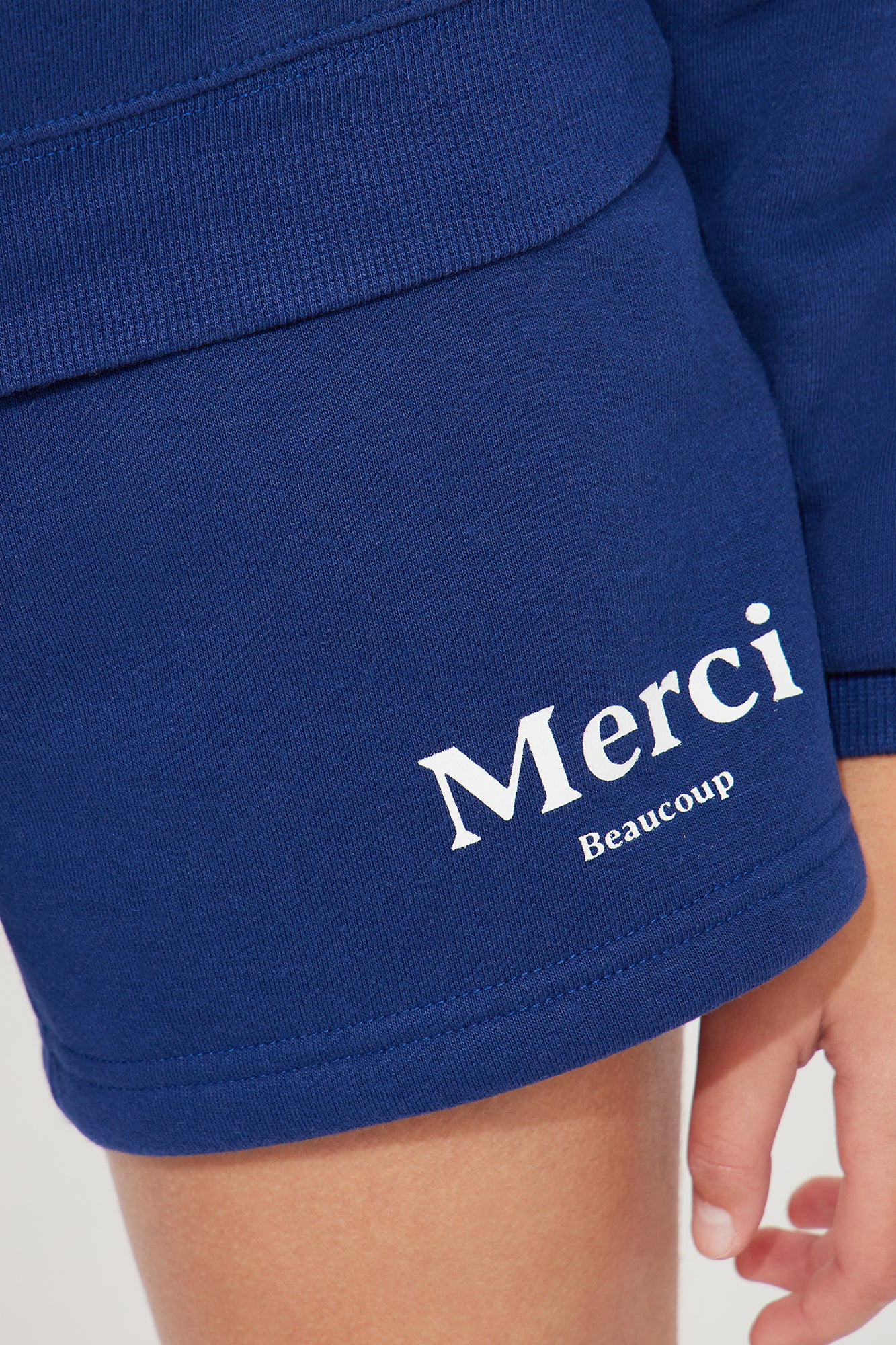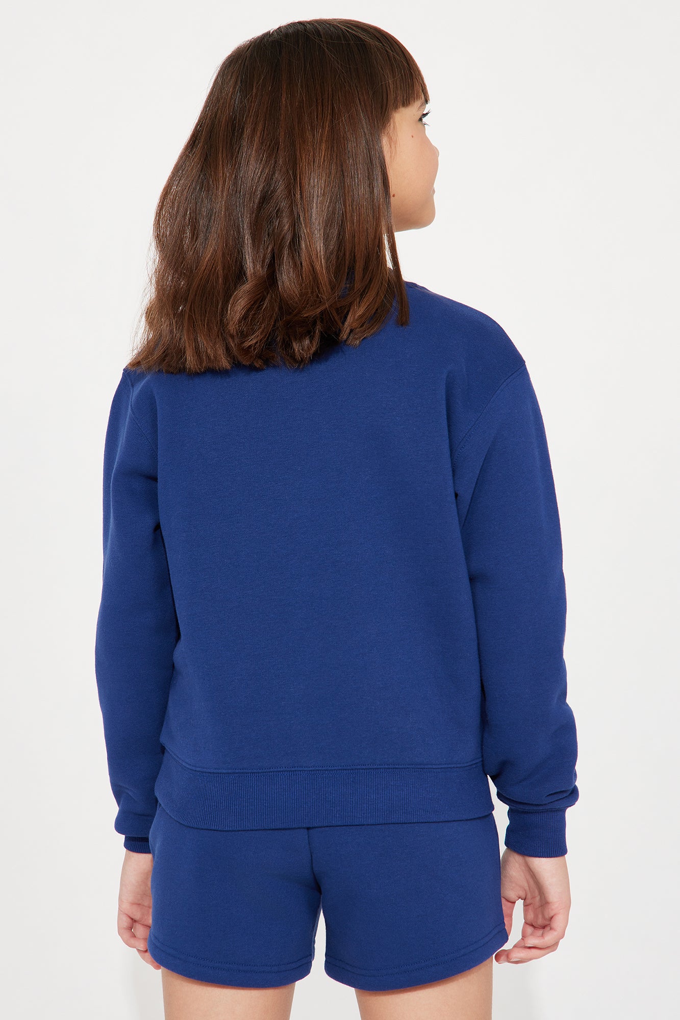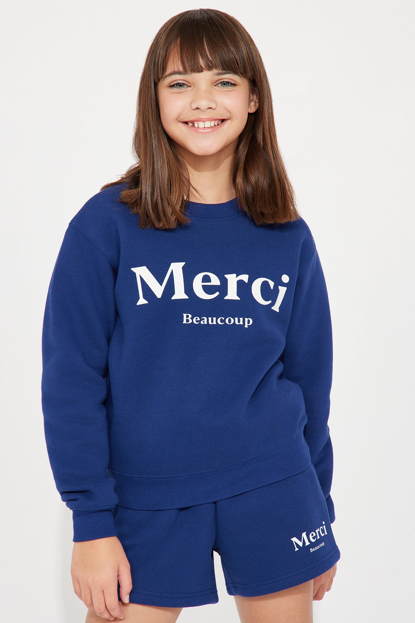 Available In Navy. Matching Fleece Short Set Long Sleeve Crew Neck Sweatshirt "Merci Beaucoup" Verbiage Elastic Waistband Stretch 52% Cotton, 48% Polyester Model Wears Size 10/12 Mommy & Me Takedown Of "Merci Fleece Short Set" Imported |