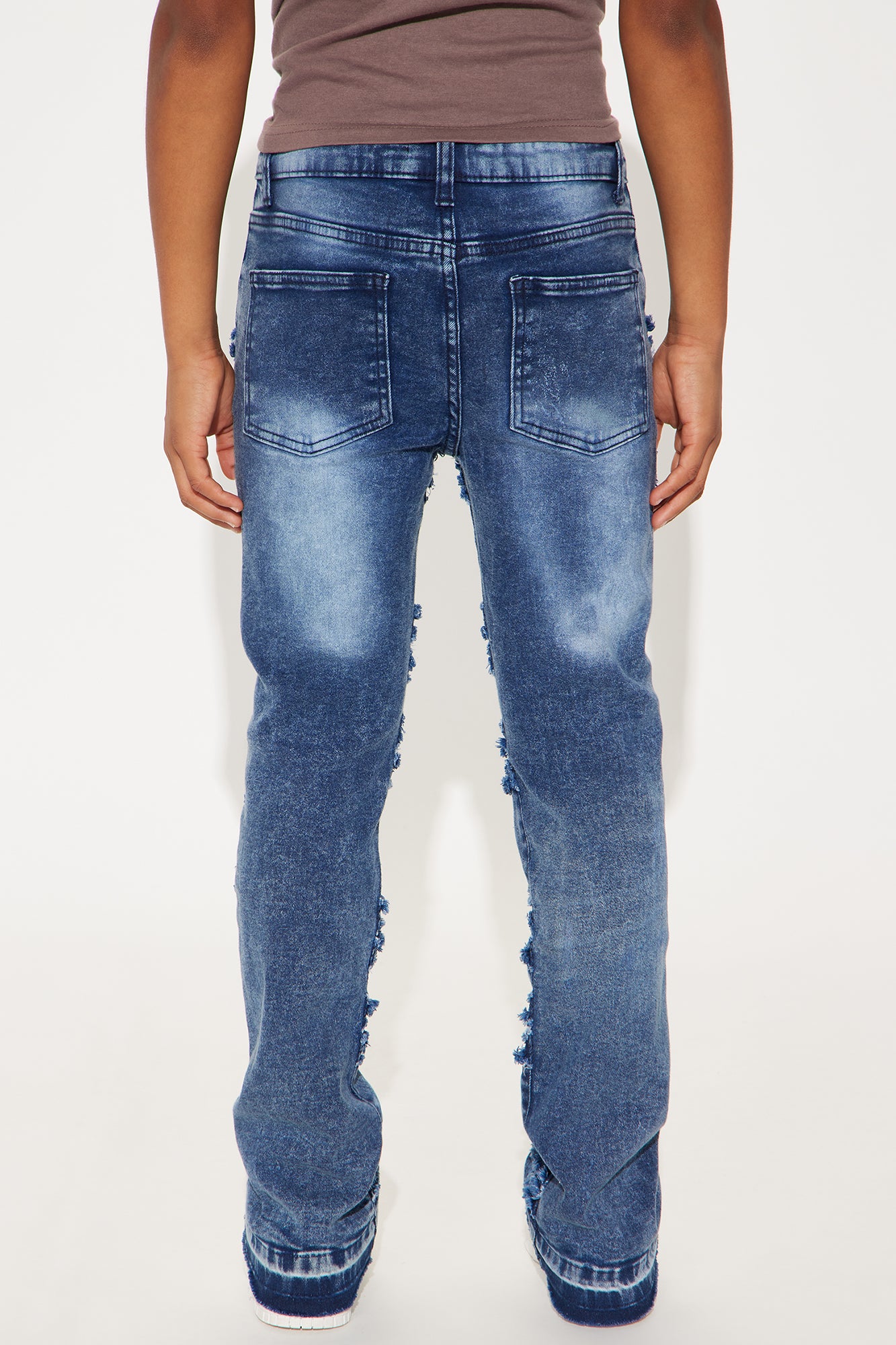 Available In Blue Wash. Denim Jean Stretch Stacked Flare Button With Zipper Closure Fray Detail 5 Pockets Detail 71% Cotton 27% Polyester 2% Spandex Model Wears Size 10 Imported |