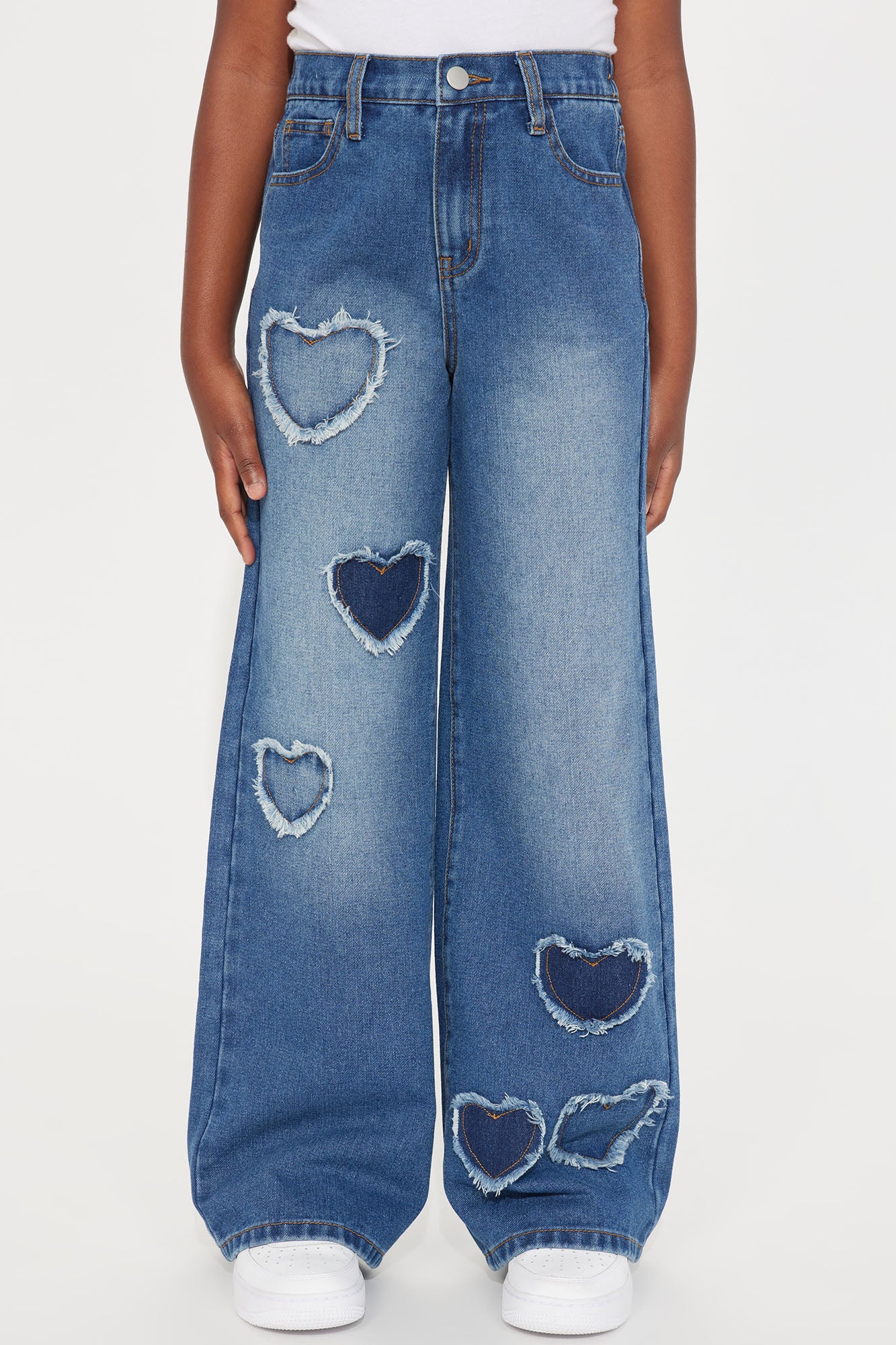 Available In Dark Blue Wash. Wide Leg Denim Jean 5 Pocket Heart Detailing Zipper and Button Front Closure 70% Cotton, 30% Polyester Model Wears Size 10 Imported |