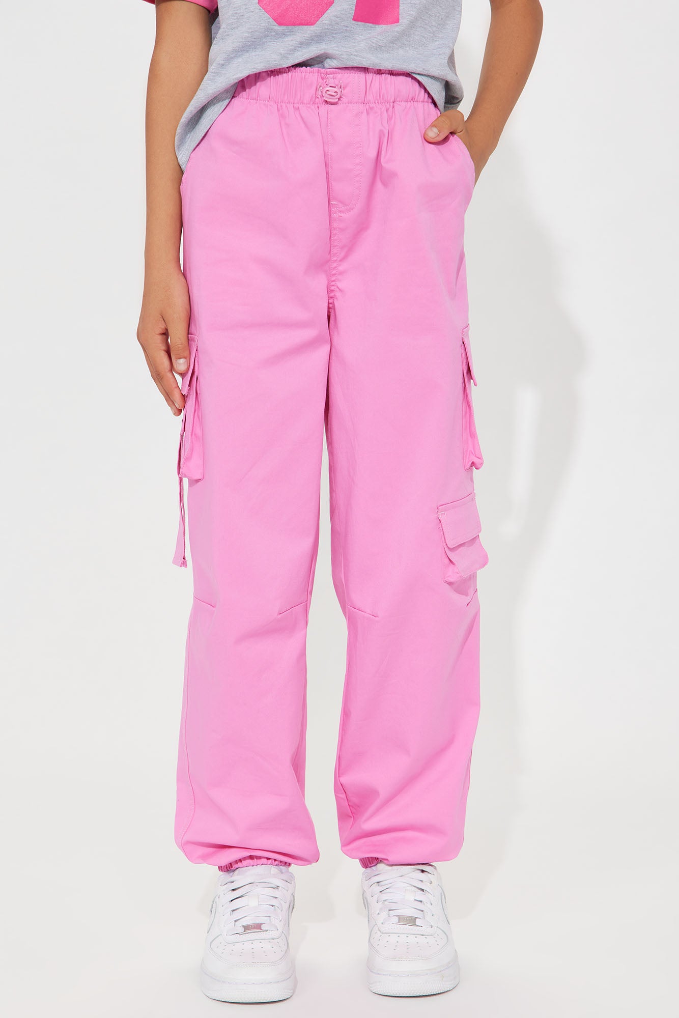 Available In Fuchsia And Beige. Parachute Pant Cargo Pockets Jogger Bottom Elastic Waist S =(7/8) M= (10/12) L= (14) XL =(16) Model Wears Size M 97% Cotton 3% Spandex Imported |