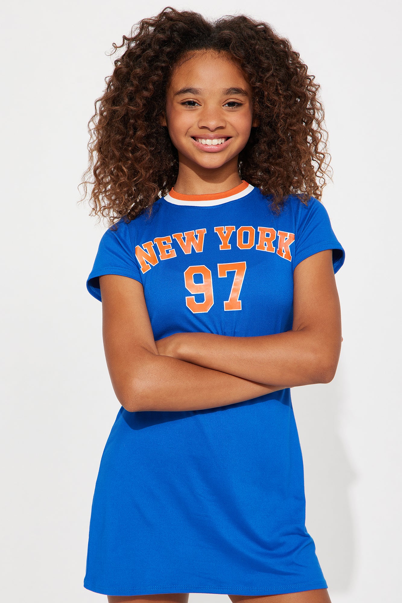 Available In Royal. Yummy Knit Basketball Dress Model Wears Size 10/12 New York 97 Screen Disclaimer: Due To The Printing Process A Difference In Saturation May Occur. Each Garment Is Unique.? 96% Polyester 4% Spandex Made In USA |