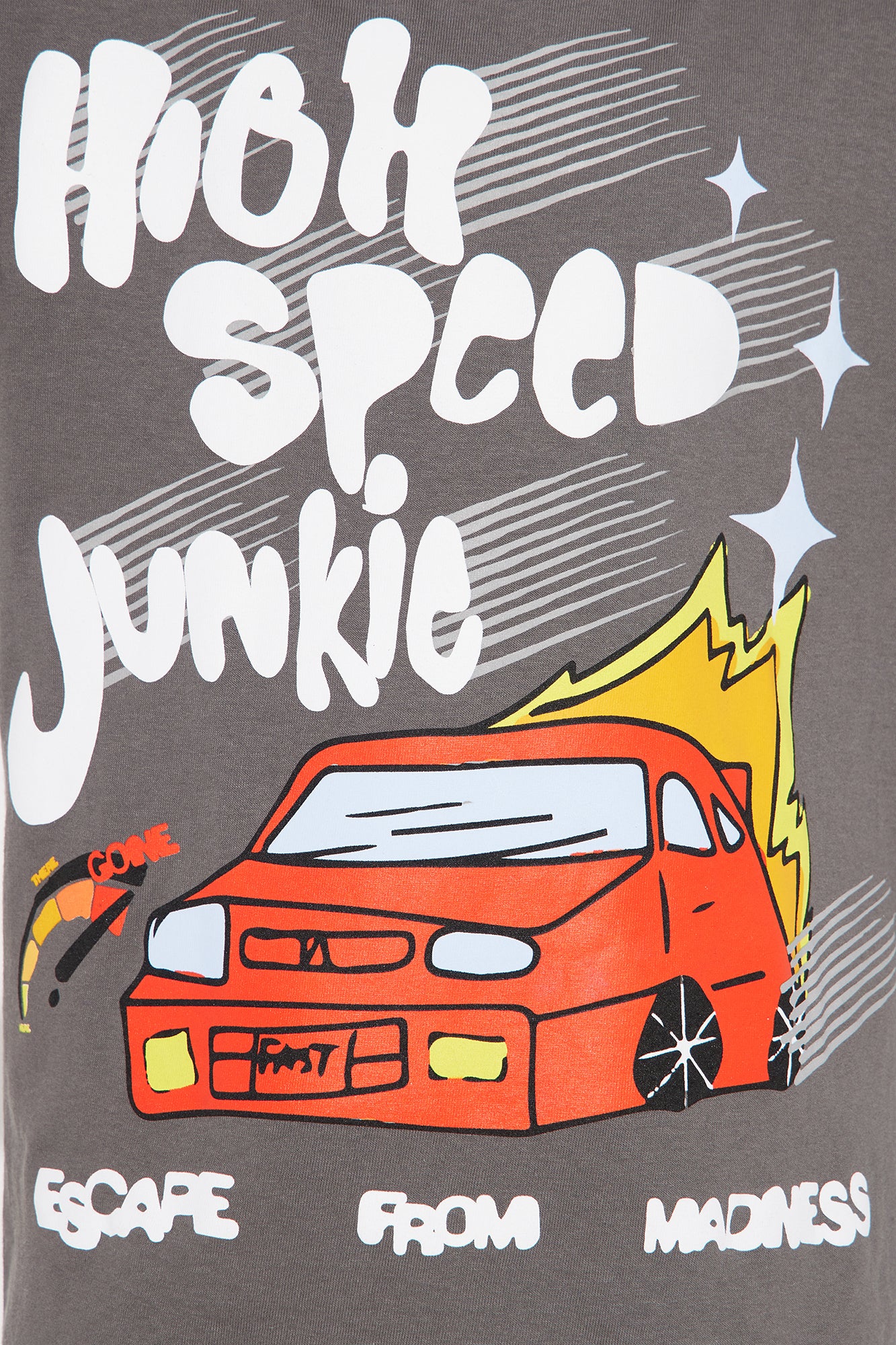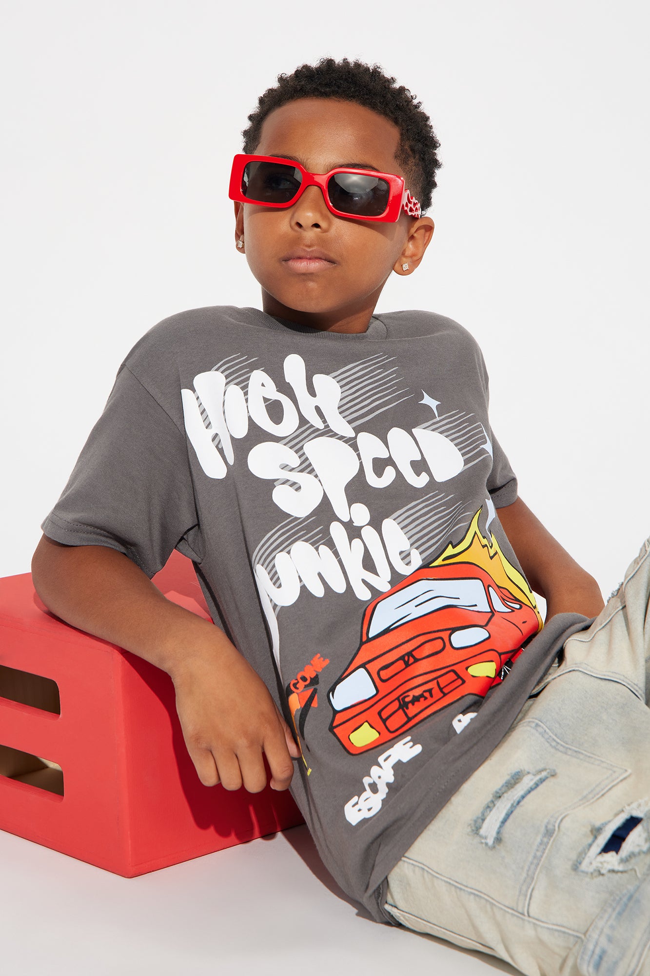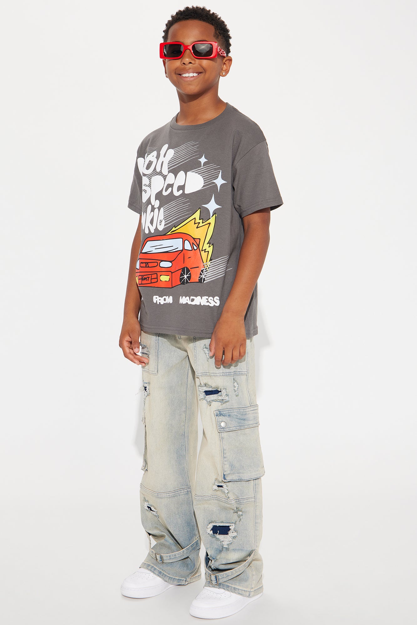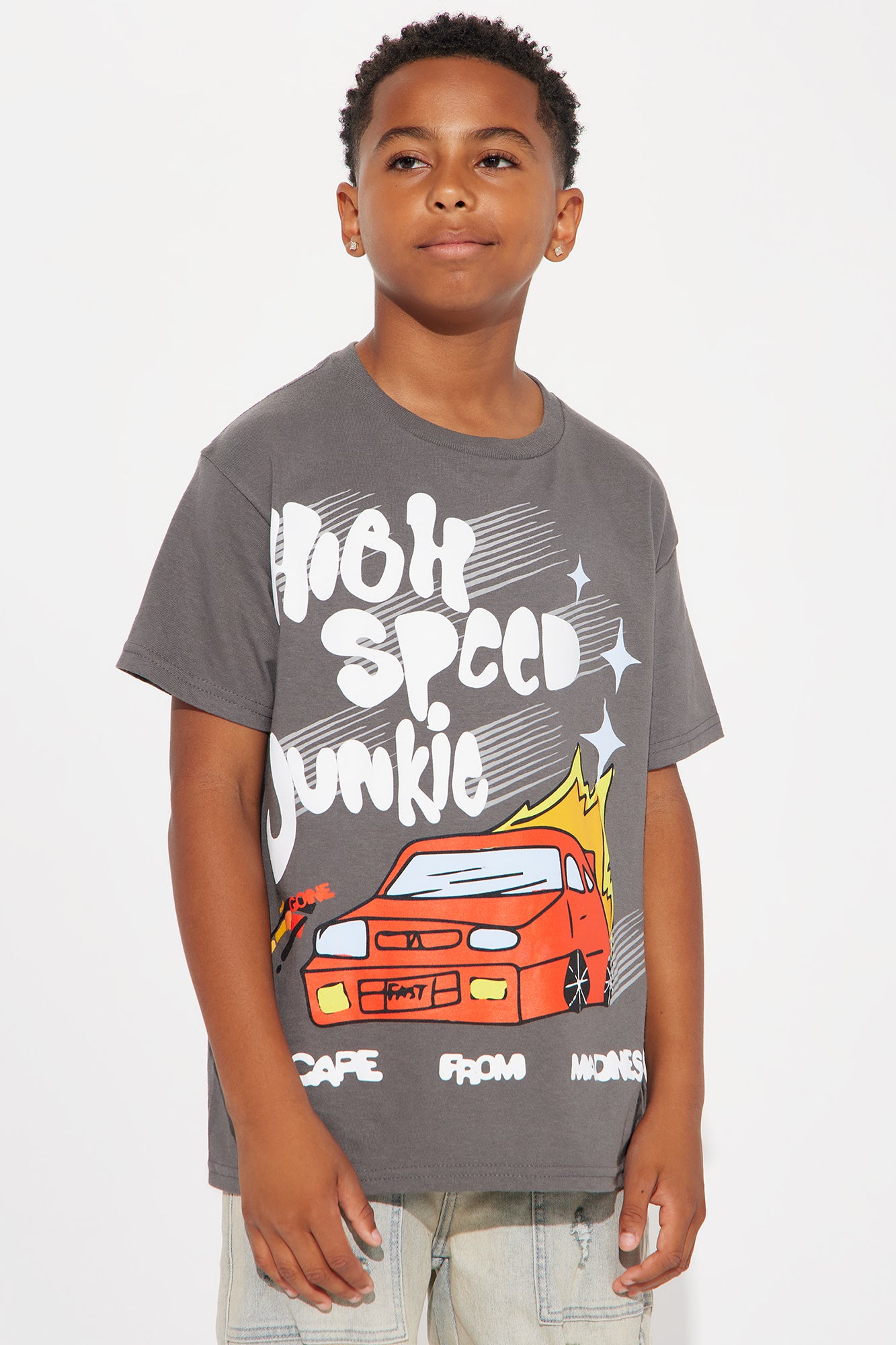 Available In Charcoal. Crew Neck Short Sleeve Screen Print 100% Cotton Model Wears Size M Daddy & Me Takedown of "Mad Speed Short Sleeve Tee" S=(7/8), M=(10/12), L=(14/16), XL=(18) Imported |
