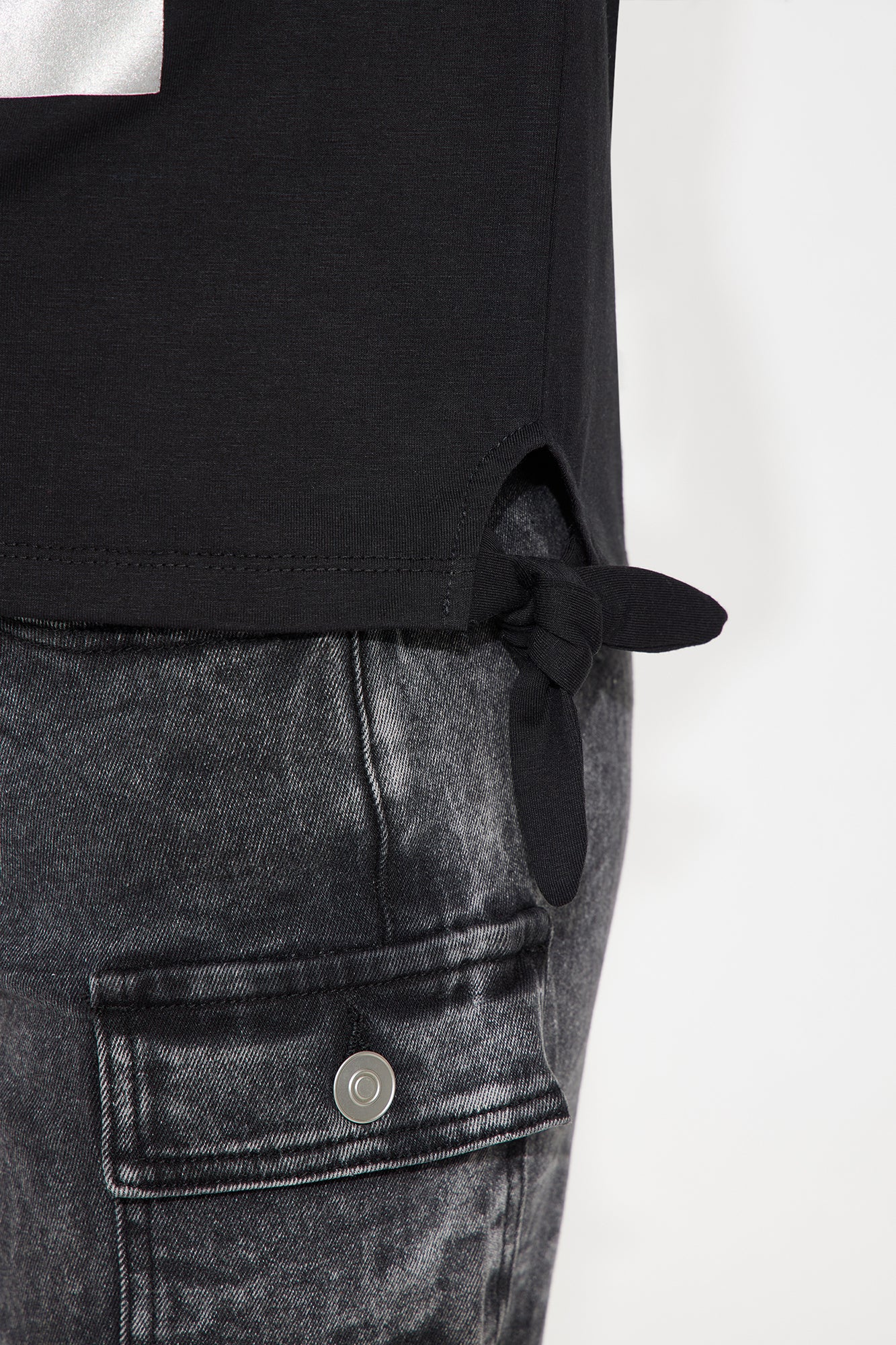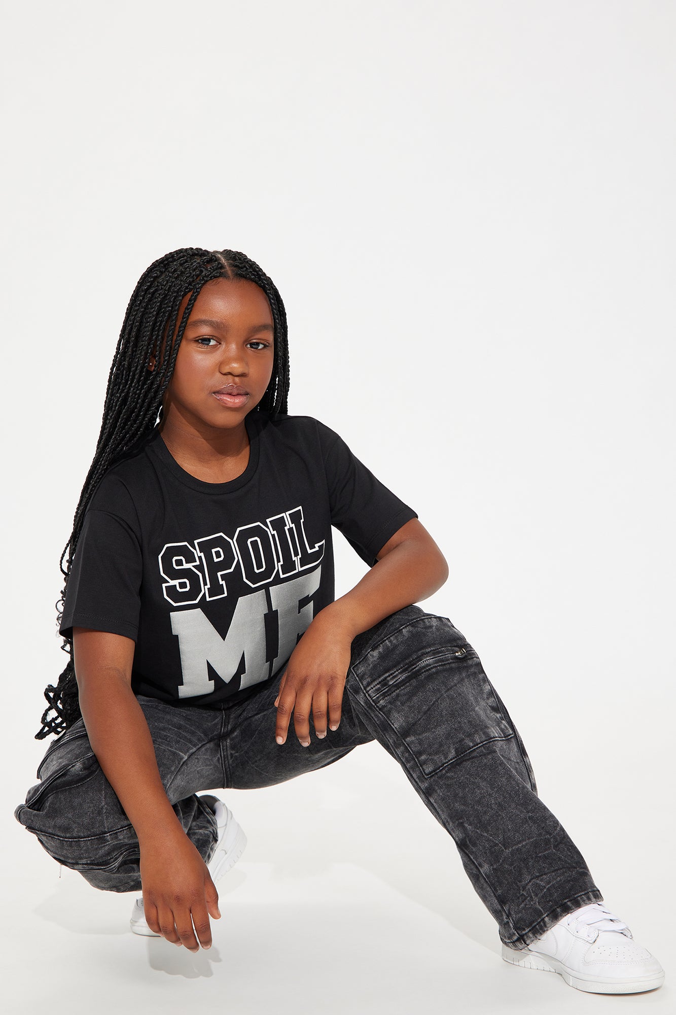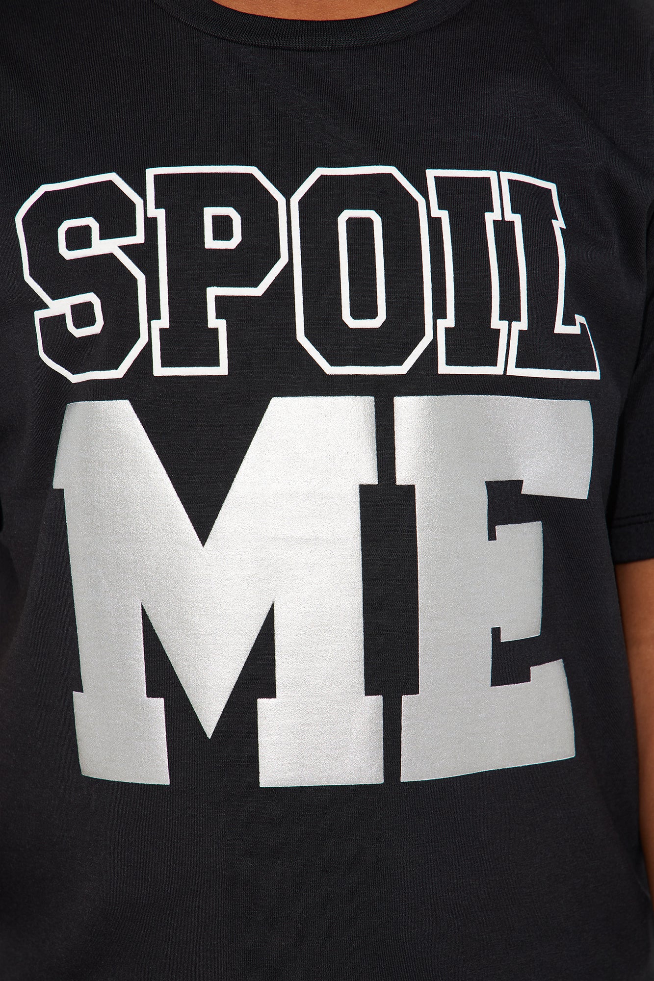 Available In Black. Short Sleeve Crew Neck Tie Side "Spoil Me" Screen Print Vebriage Model Wears Size 10/12 Disclaimer: Due To The Printing Process A Difference In Saturation May Occur. Each Garment Is Unique. 50% Cotton 45% Polyester 5% Spandex Imported |