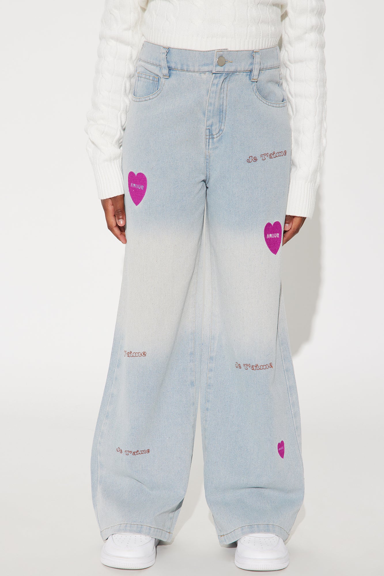 Available In Light Wash. Straight Leg Jeans 5 Pocket Heart Patch Design Zipper Front With Button Closure 60% Cotton 40% Polyester Model Wears Size 10 Imported |