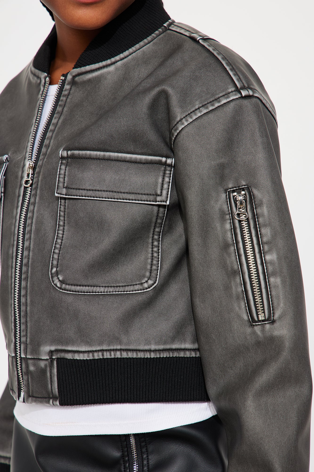 Available In Charcoal. Bomber Jacket Faux Leather Exposed Zipper Functional Pockets Shell: 51% PU/ 49% Polyester, Lining: 100% Polyester Mommy & Me Takedown of "Still Fly Washed Faux Leather Bomber Jacket" Model Wears Size 10 Imported |
