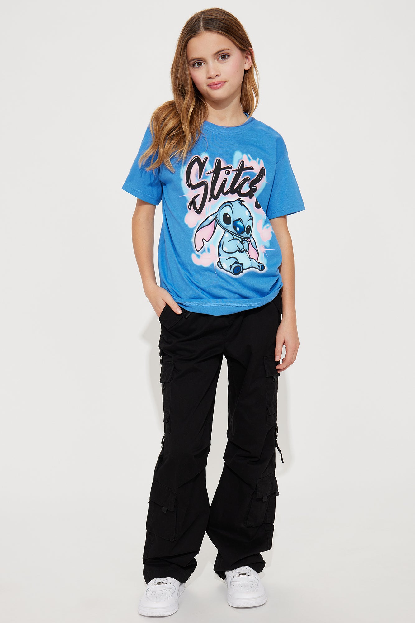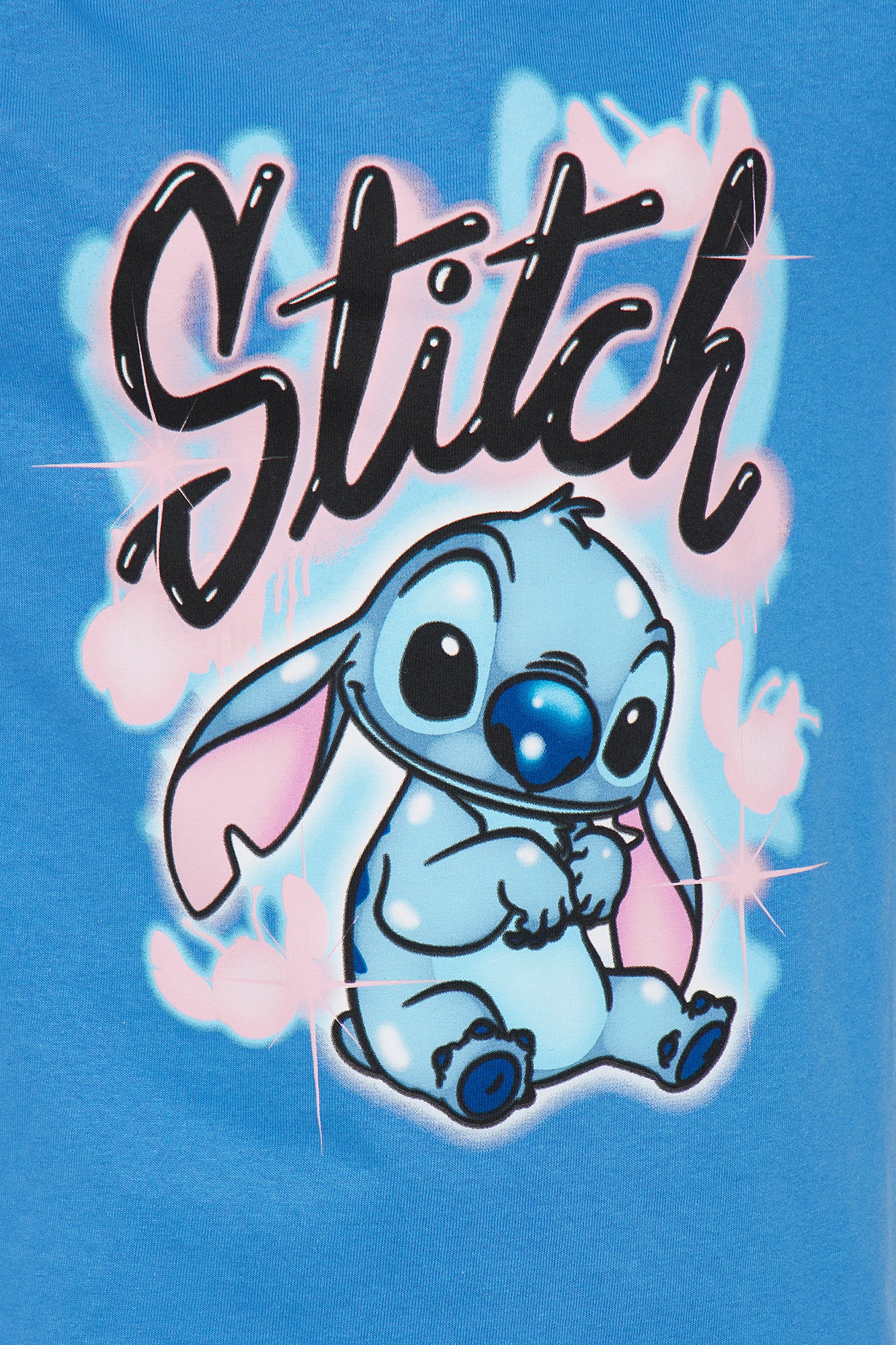 | Available In Light Blue. T-Shirt Short Sleeve Crew Neck Front Screen "Stitch" Verbiage Stitch Airbrush Graphic 100% Cotton Model Wears Size 10/12 Imported |