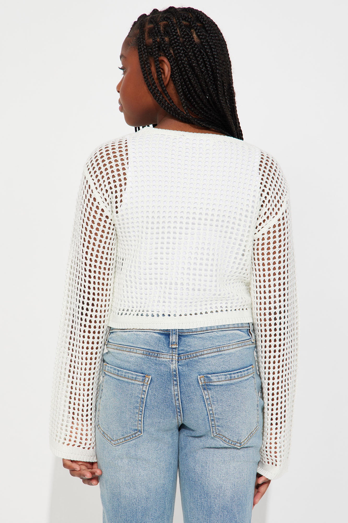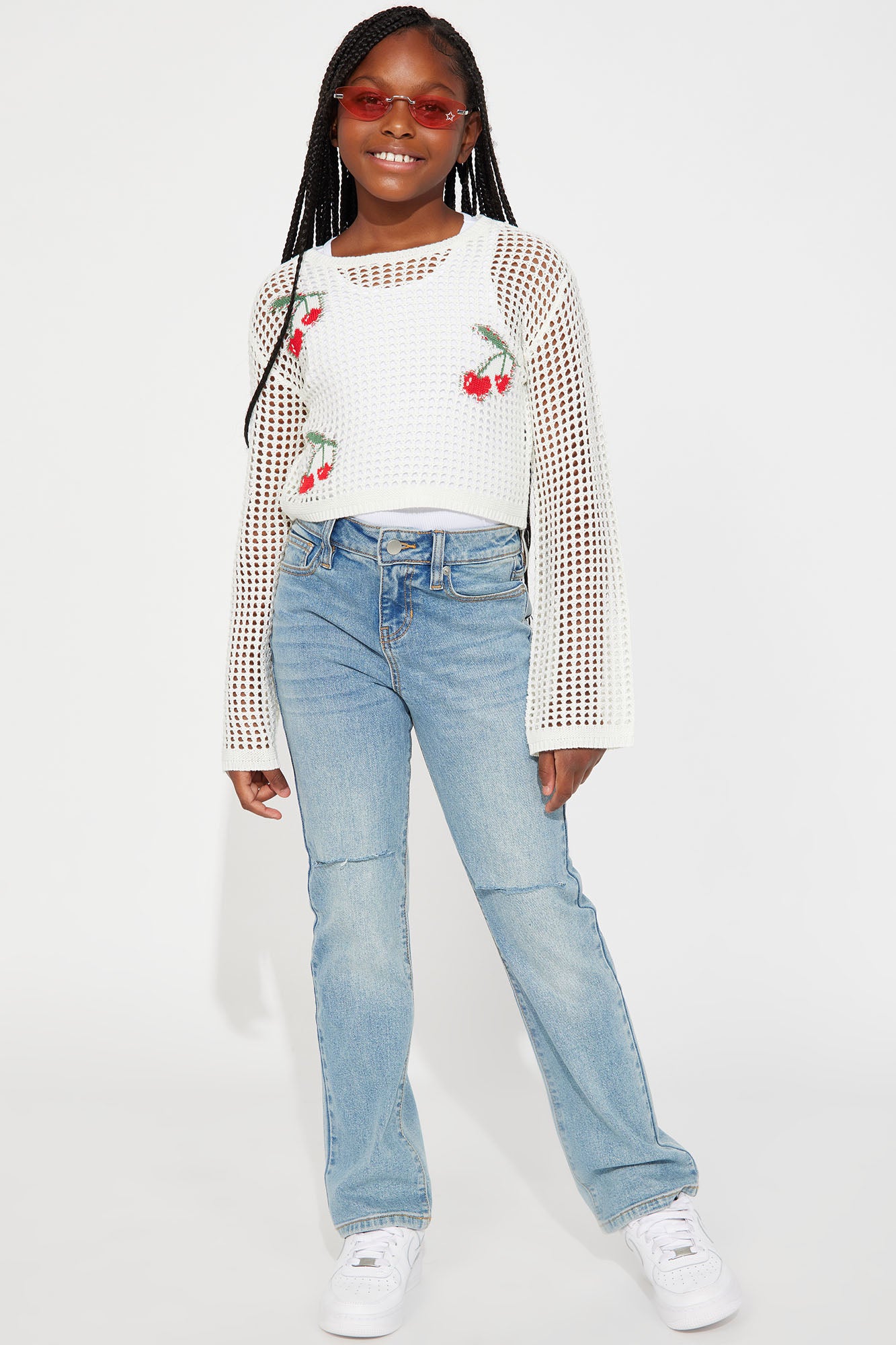 Available In Cream/combo. 2 Piece Set Mesh Long Sleeve Top Cherry Appliques Tank Top Model Wears Size 10/12 Imported Sweater:100% Acrylic, Tank:92% Polyester, 8% Spandex  |