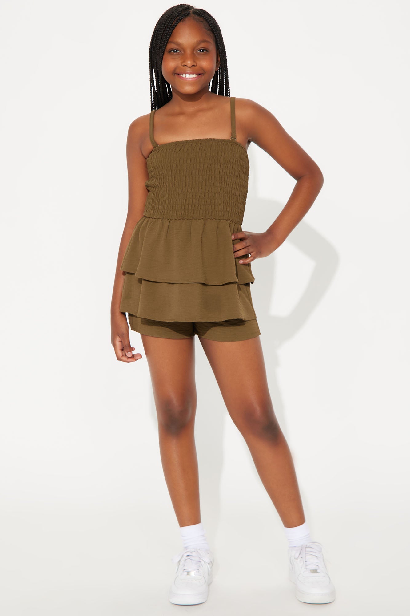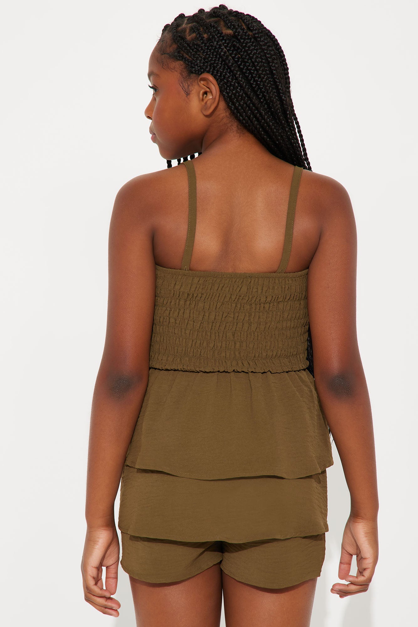 Available In Olive. 2 Piece Set Tube Top Detachable Straps Smocked Tiered Ruffles Shorts With Elastic Waist Side Pockets Top And Bottom: 100% Polyester Model Wears Size 10/12 Imported |