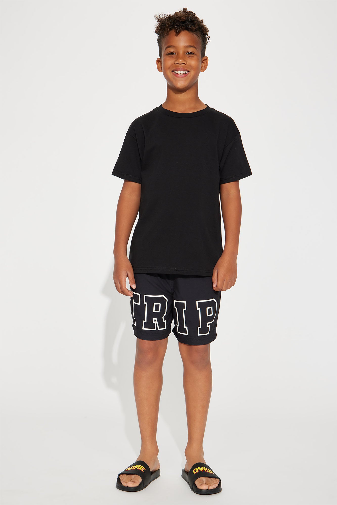 Available In Black. Swim Trunks "Trip" Verbiage Print Elastic Waistband Pockets Drawstring Match With Daddy "Trip Leg Print Swim Trunks" Final Sale Disclaimer: Due To The Printing Process A Difference In Saturation May Occur. Each Garment Is Unique.? 100% Polyester Imported |