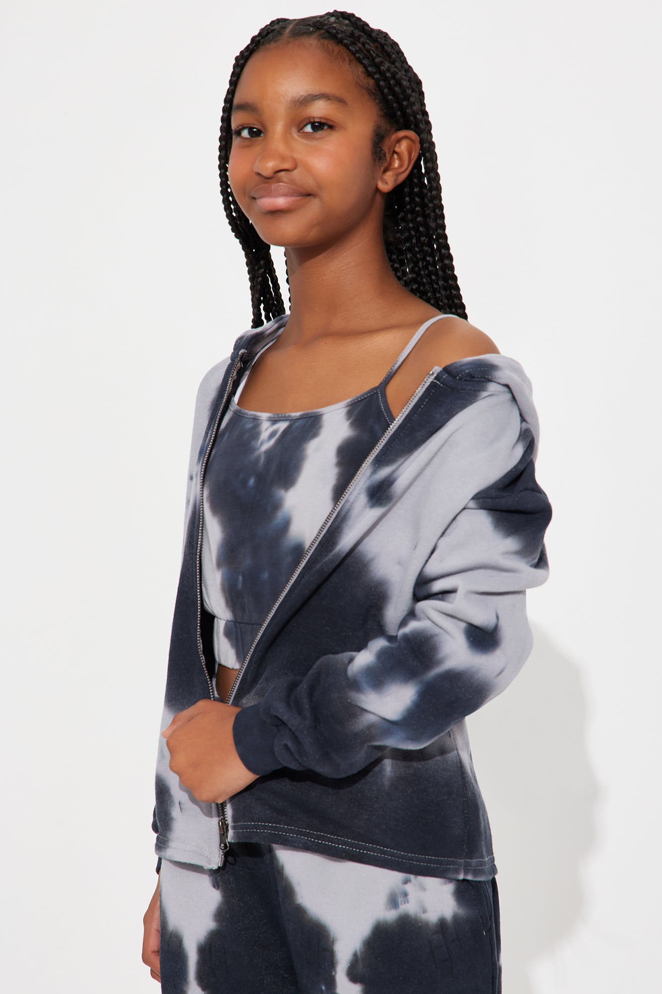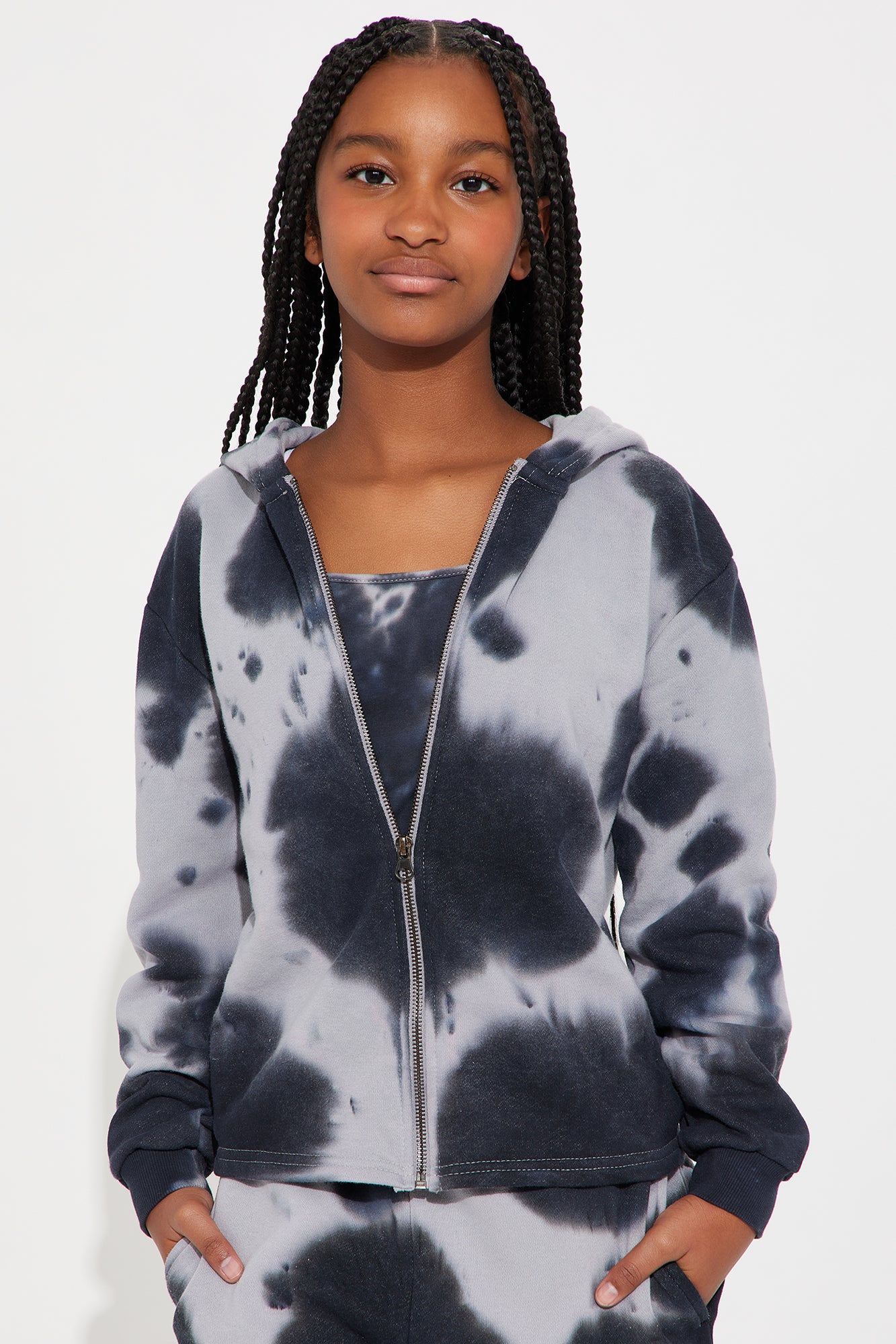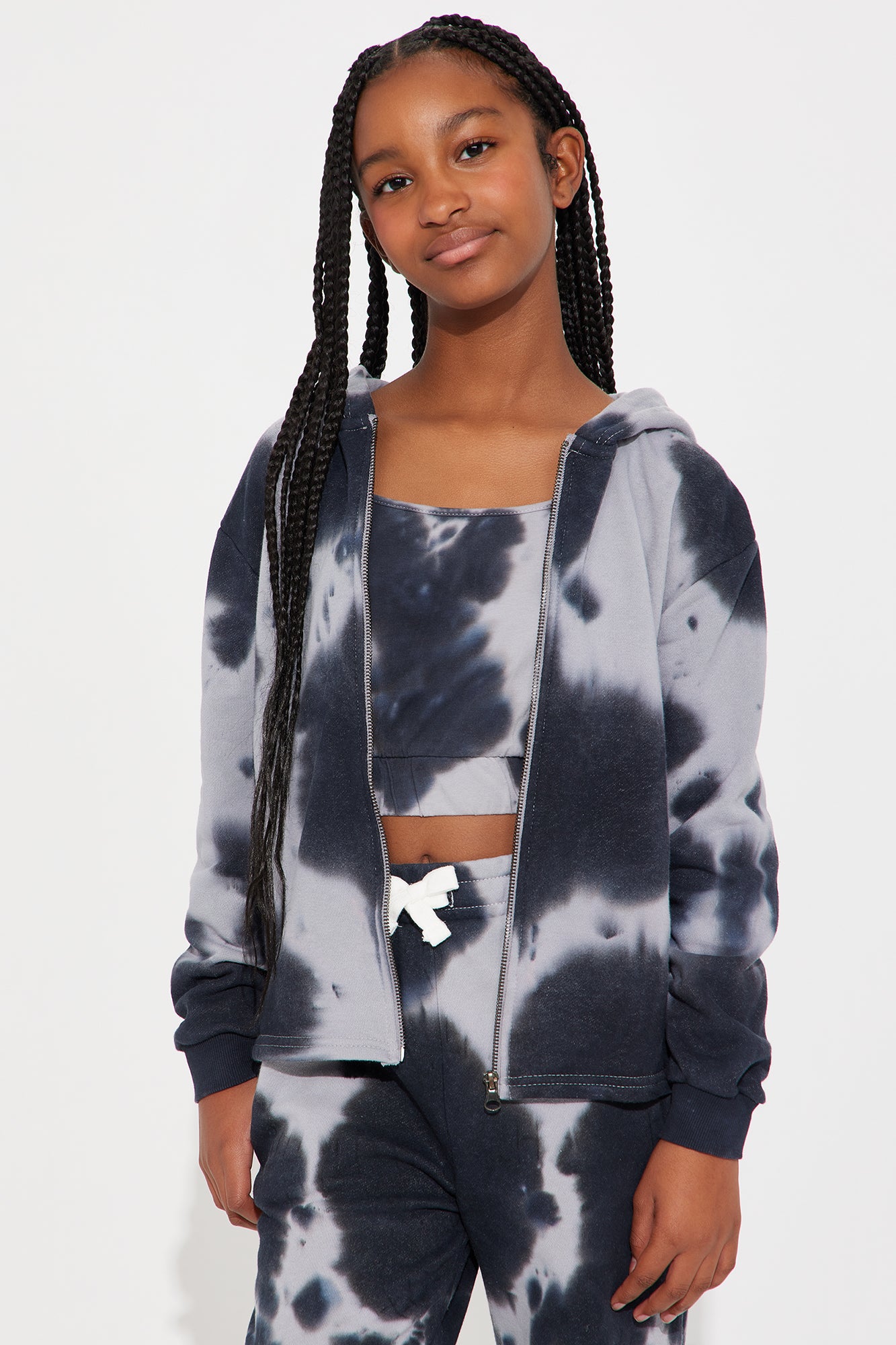 Available In Black/combo. 3 Piece Pant Set Long Sleeve Zip Up Hoodie Cami Top Tie Dye Print Straight Leg Pant Elastic Waistband Foe Drawstring on Jogger Stretch 60% Cotton 40% Polyester Model Wears Size 10 Mommy & Me Takedown Of "Unforgiven Tie Dye 3-Piece Pant Set" Imported |