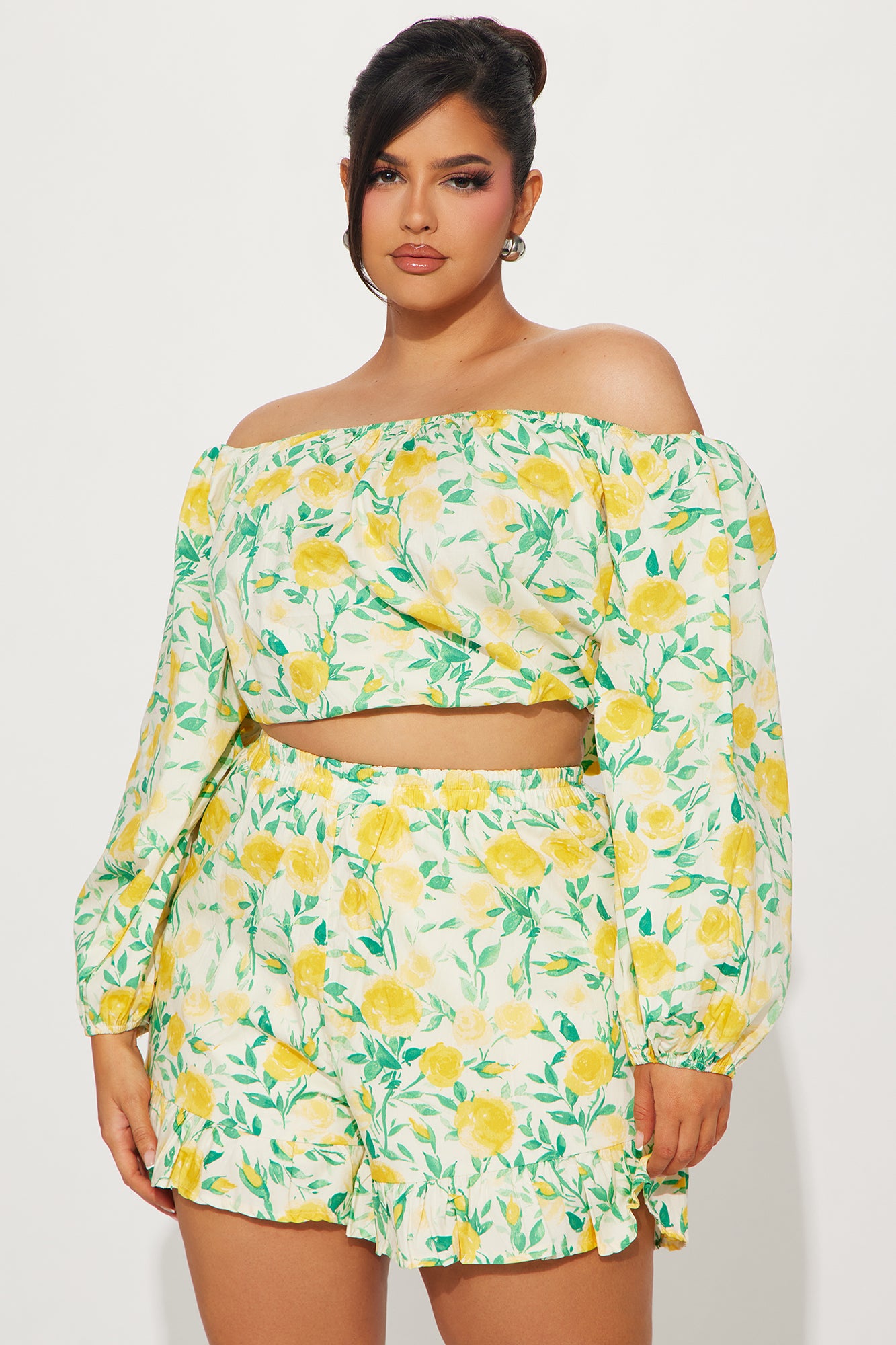 Available In Pink/combo And Yellow/combo. Short Set Off Shoulder Top Long Sleeve High Waist Short Ruffle Hem Elastic Waistband Disclaimer: Pattern Placement May Vary. Self: 100% Cotton? Lining: 100% Rayon Imported |
