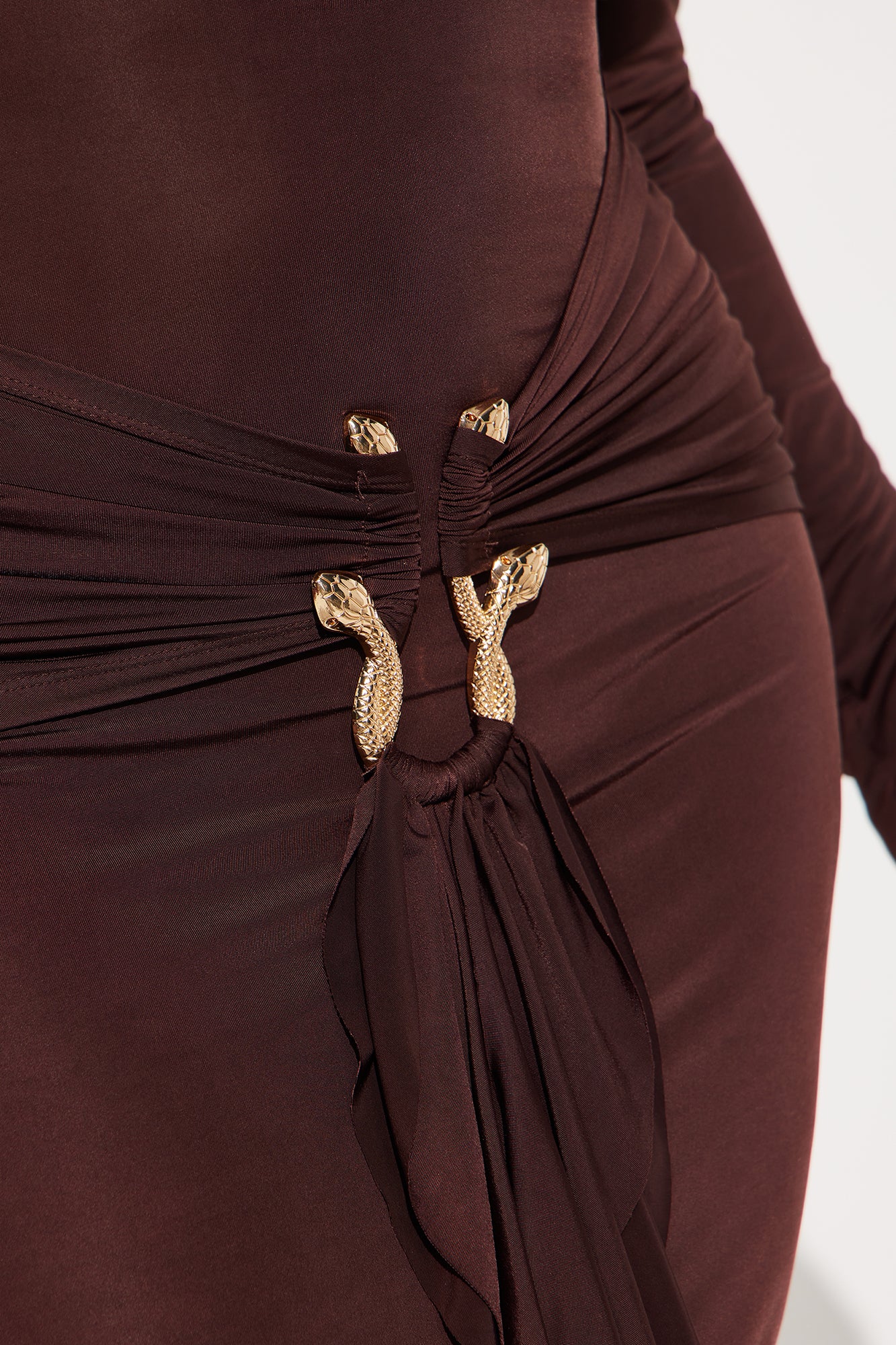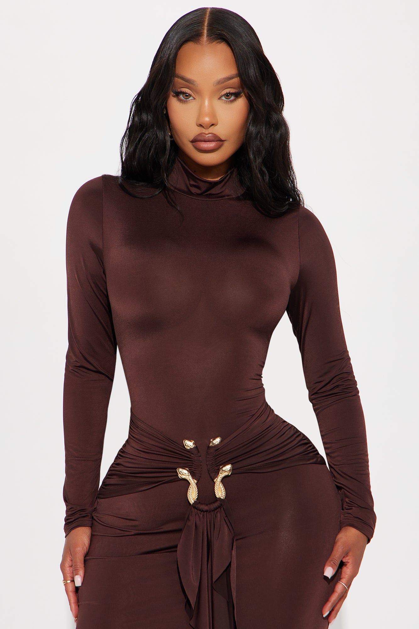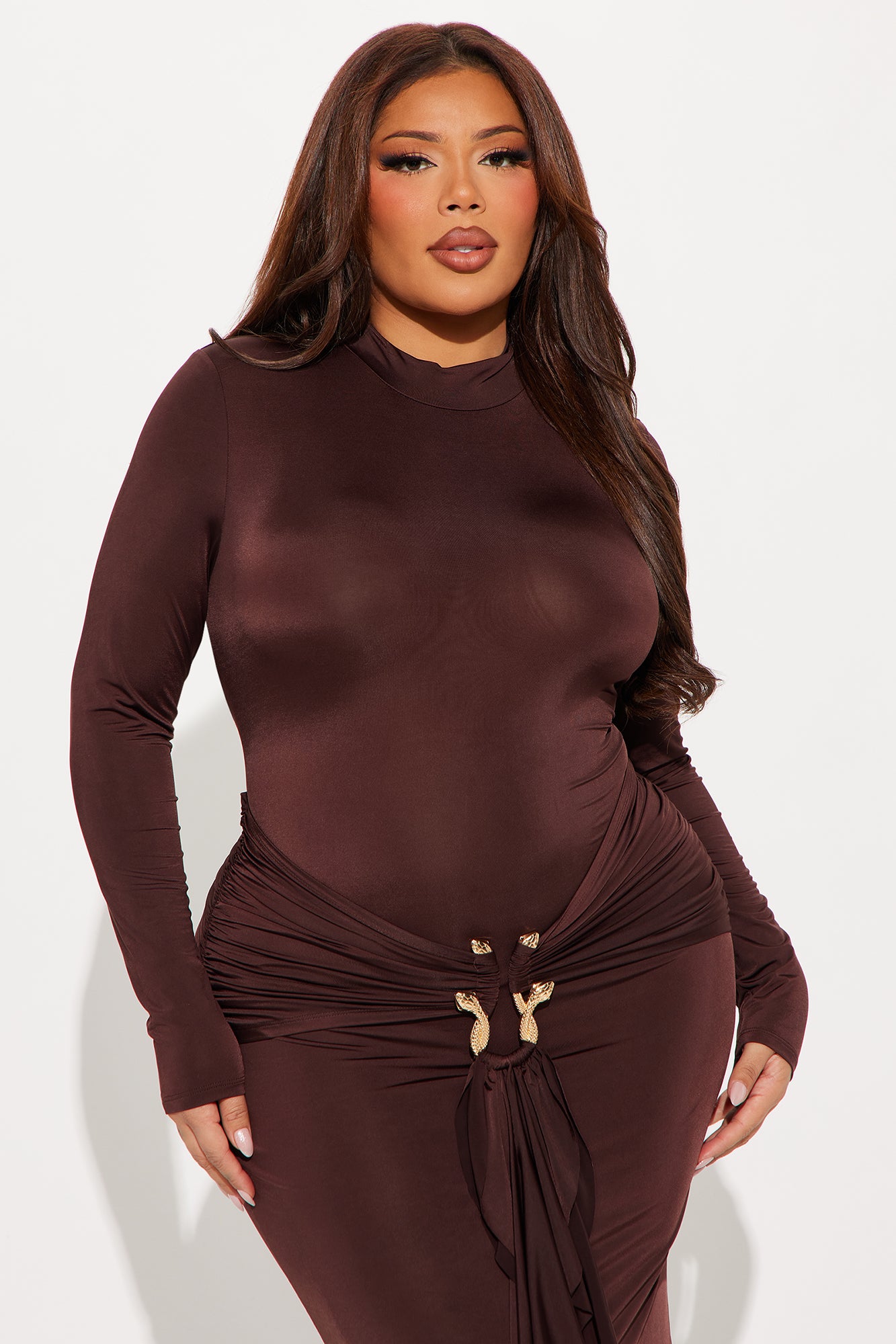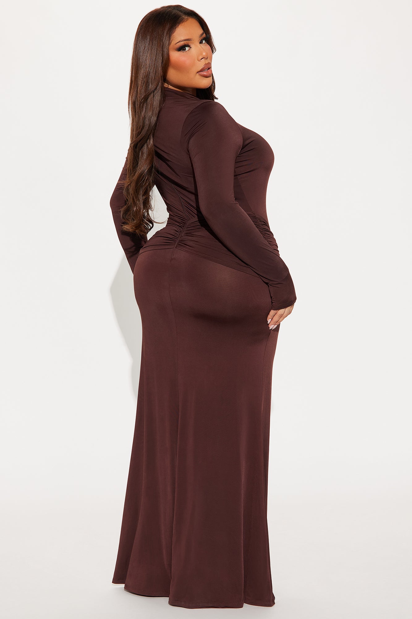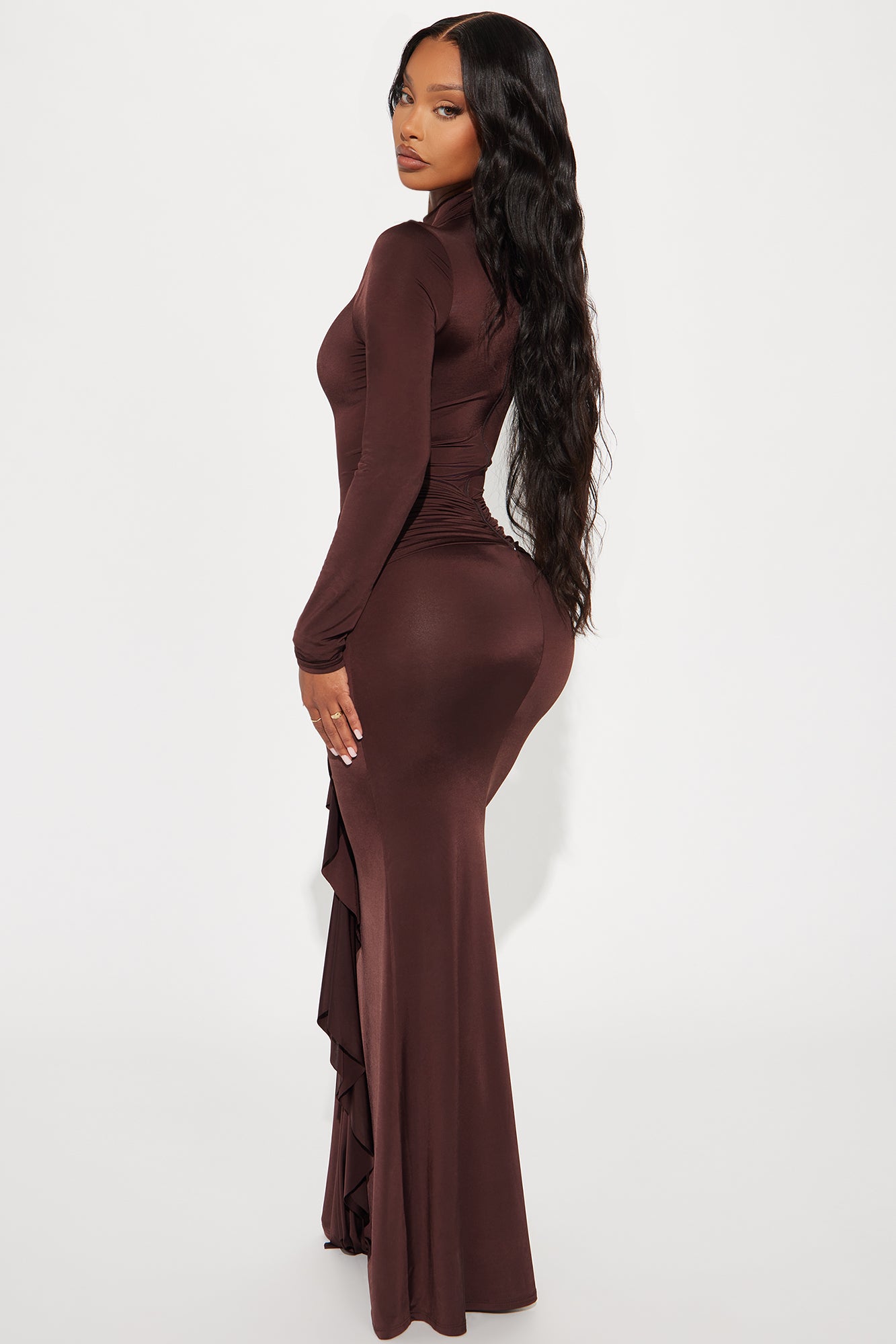 Available In Chocolate And Hunter. Maxi Dress Mock Neck Long Sleeve Hardware Ruched Ruffle Detail Back Zipper Closure Stretch 95% Polyester 5% Spandex Imported |