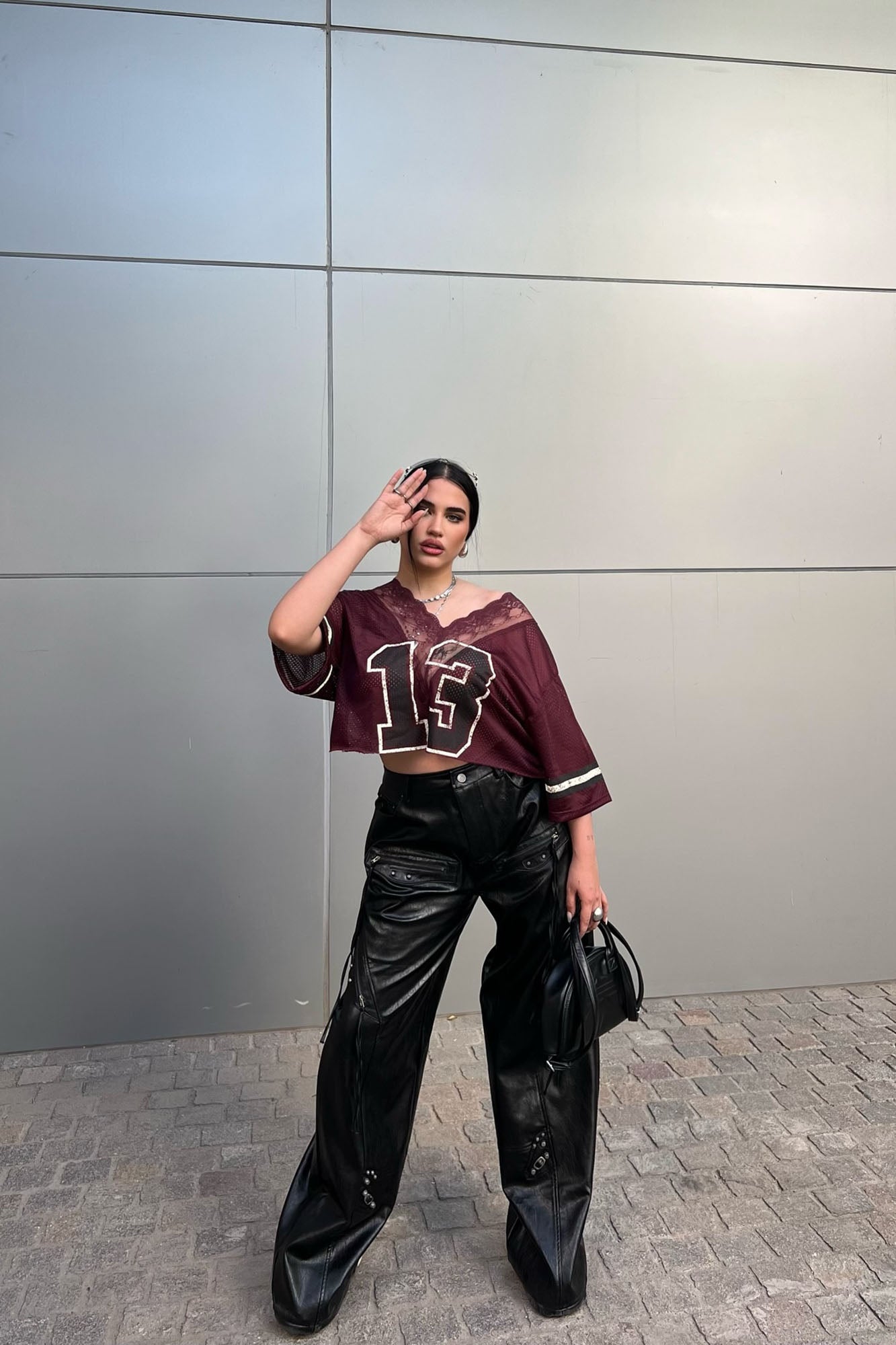 Available In Burgundy. V-Neck Short Sleeve Front Screen Lace Trim Jersey Mesh Cropped Stretch Disclaimer: Due To The Printing Process A Difference In Saturation May Occur. Each Garment Is Unique. 100% Polyester Imported |