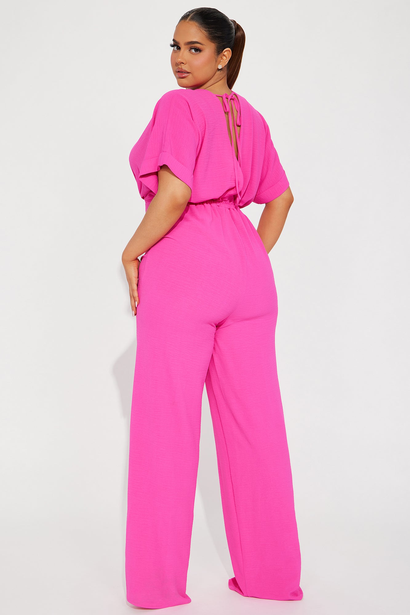 Available In Royal, Hot Pink, And Mocha. Jumpsuit Short Sleeve V Neck Elastic Waistband Wide Leg Inseam= 34" Slight Stretch 100% Polyester Imported |