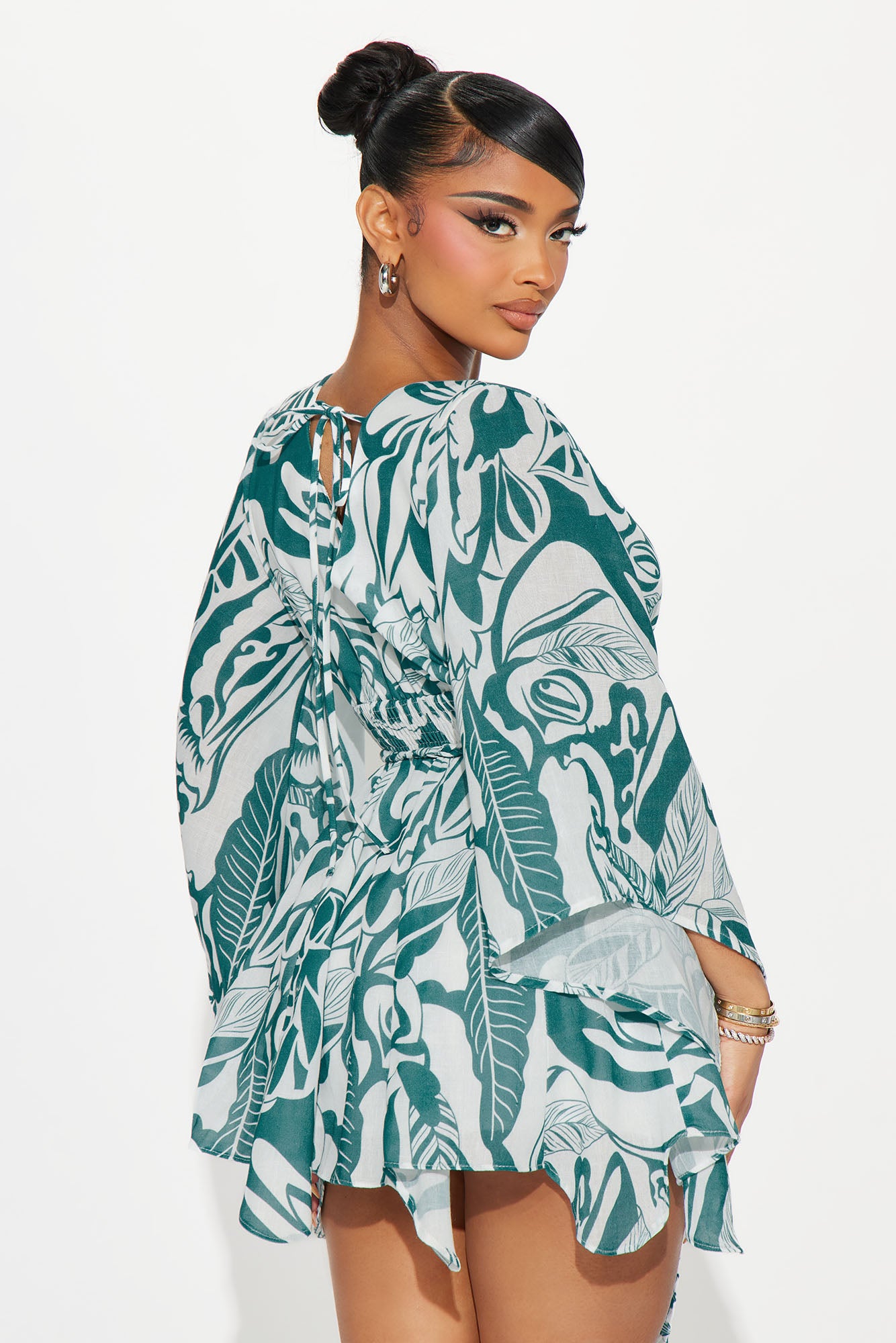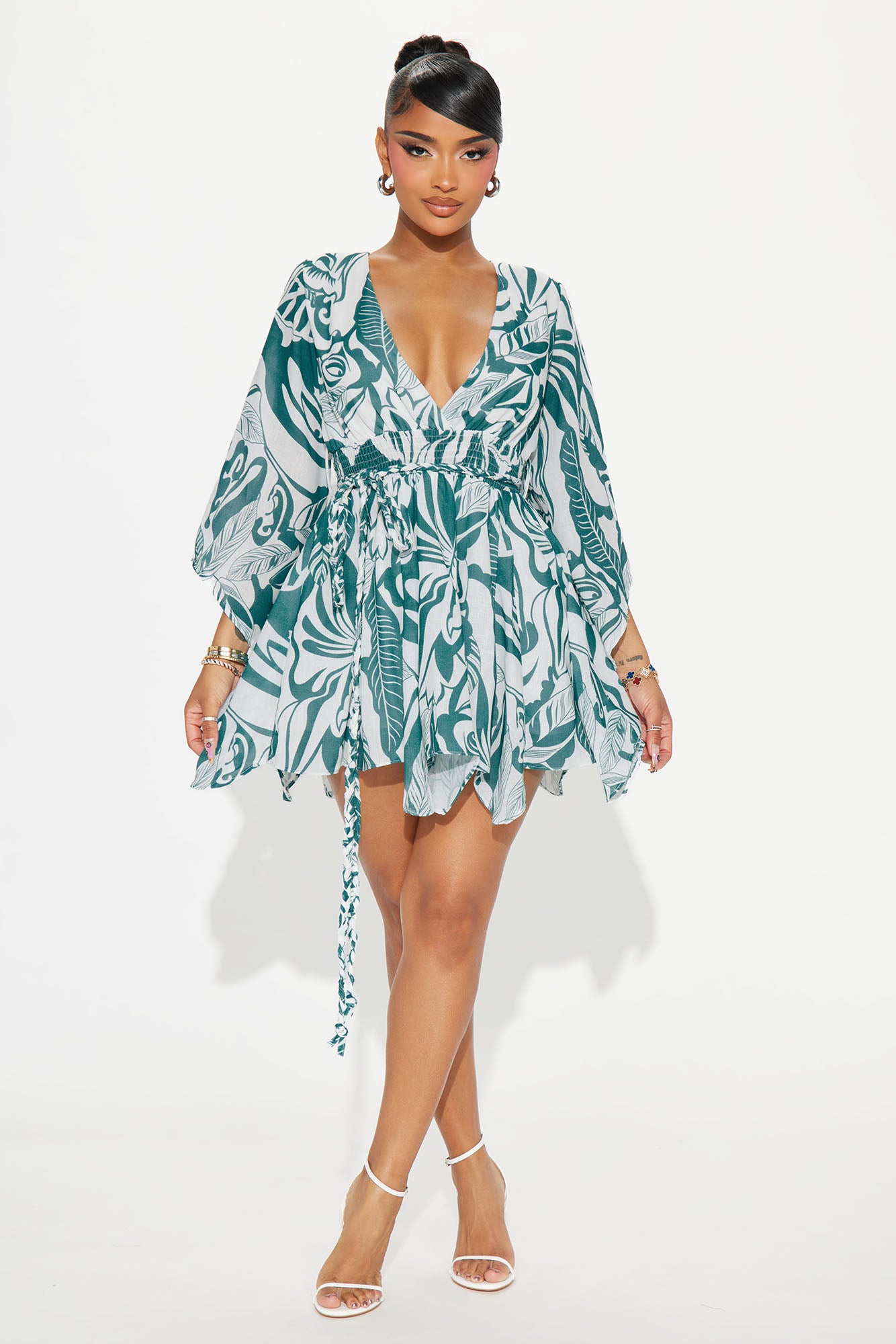 Available In Teal/combo. Mini Dress Surplice Neckline Draped 3/4 Sleeve Smocked Waist Braided Tie Belt Lined Length = 32" Disclaimer Pattern Placement May Vary Self: 100% Polyester Lining: 100% Polyester Imported |