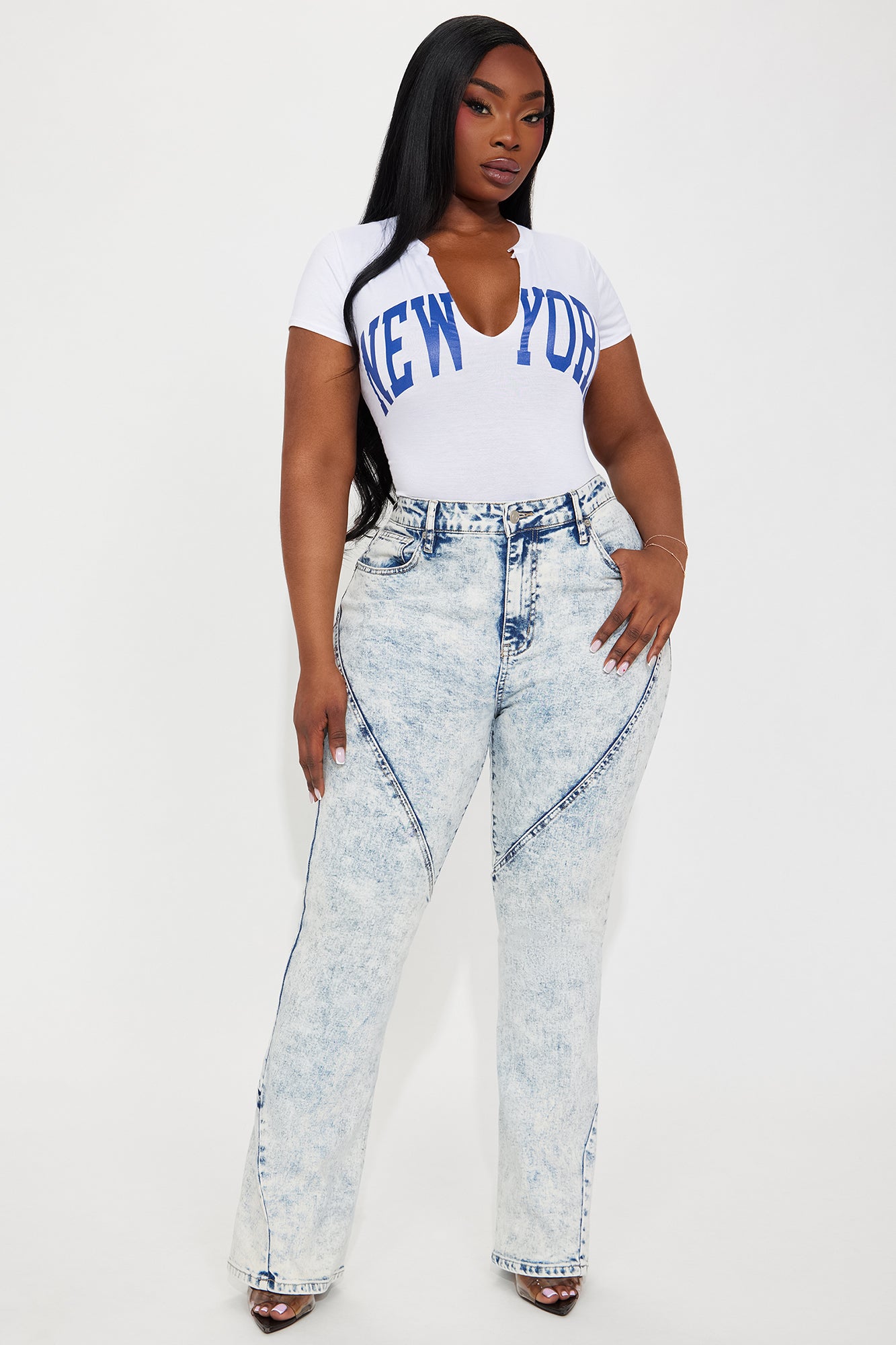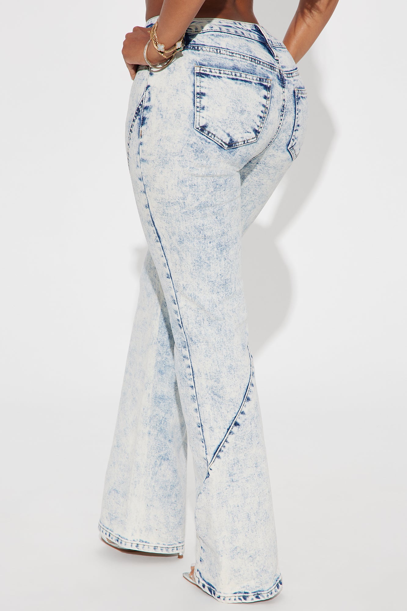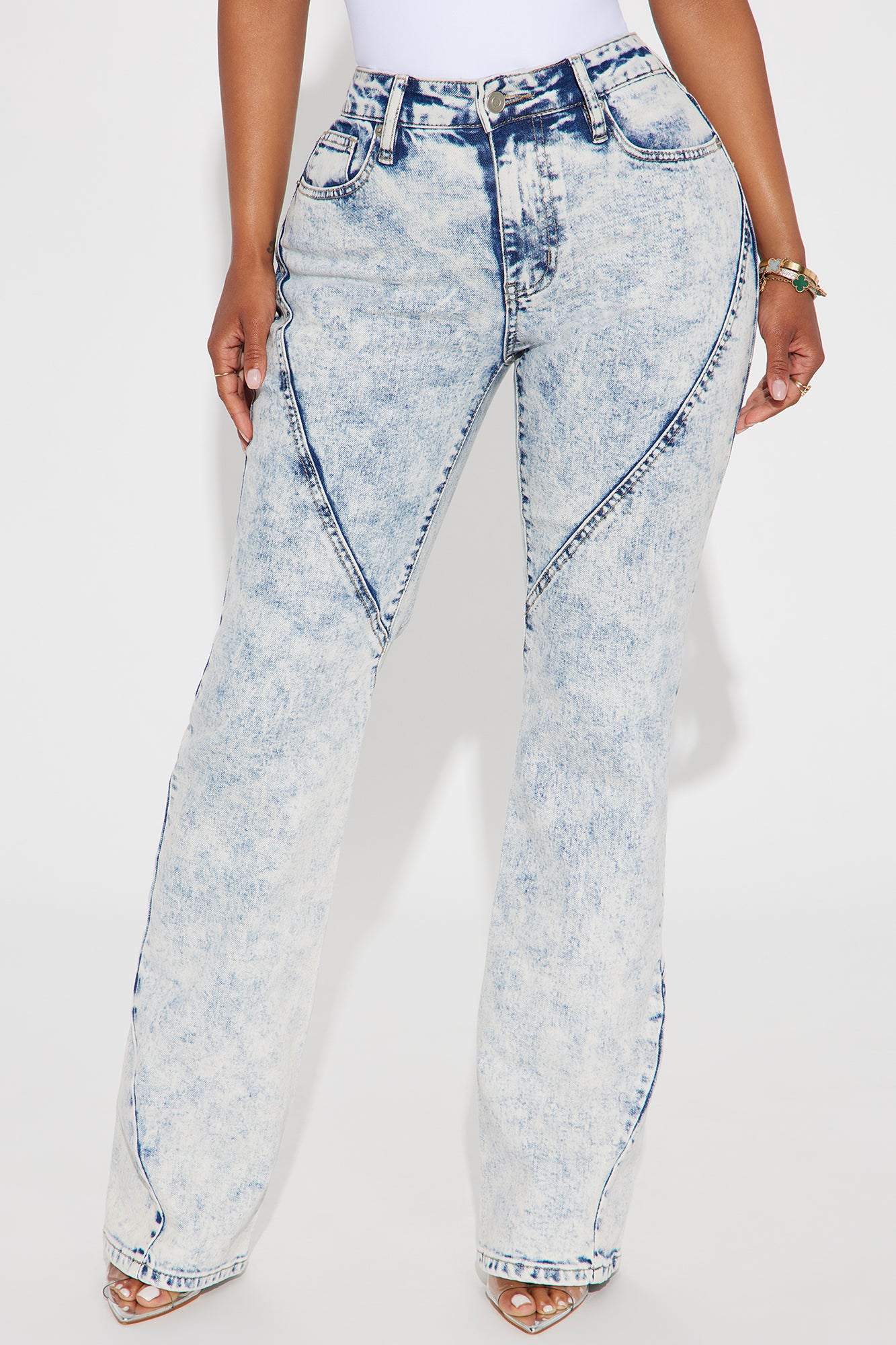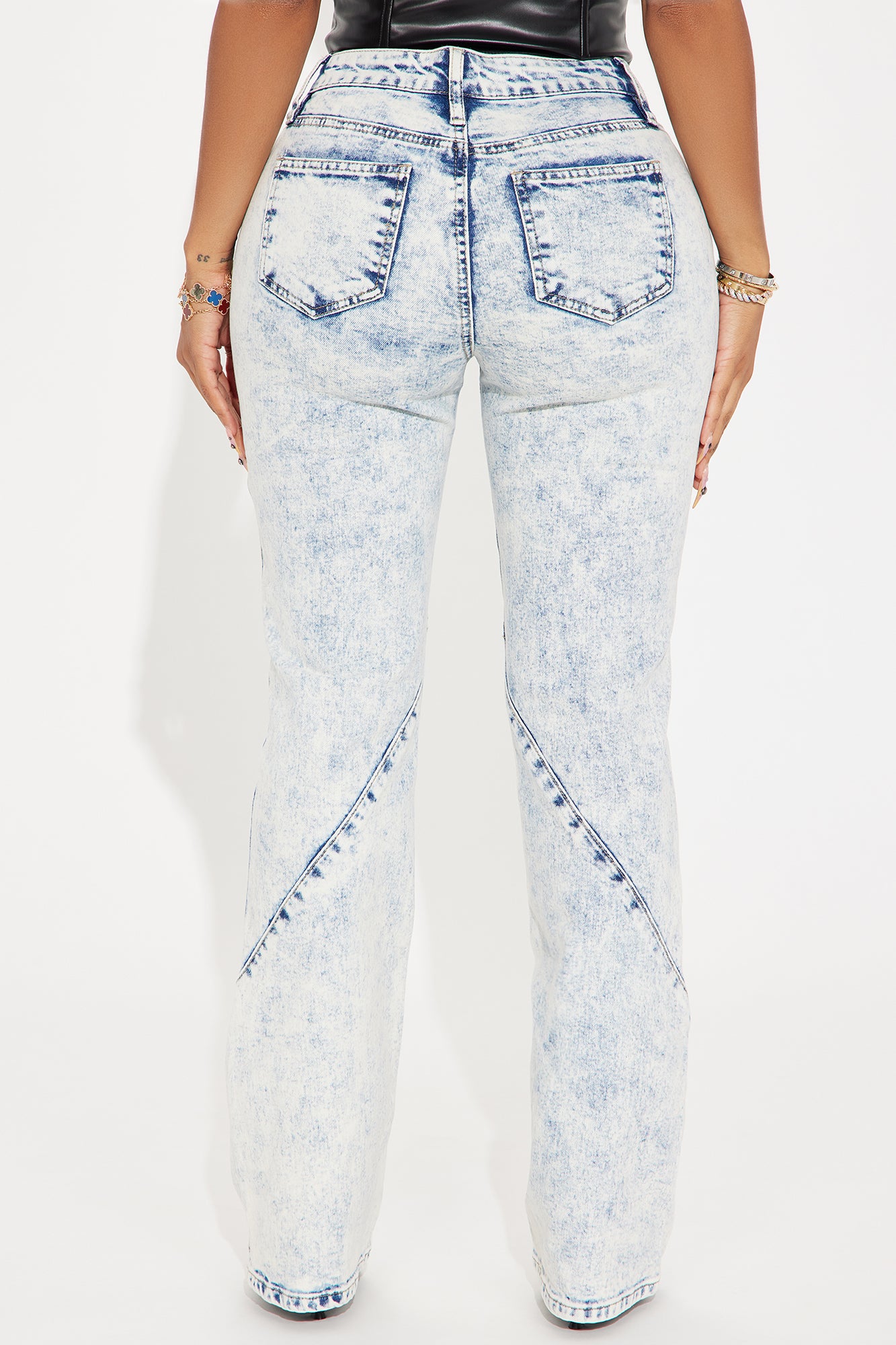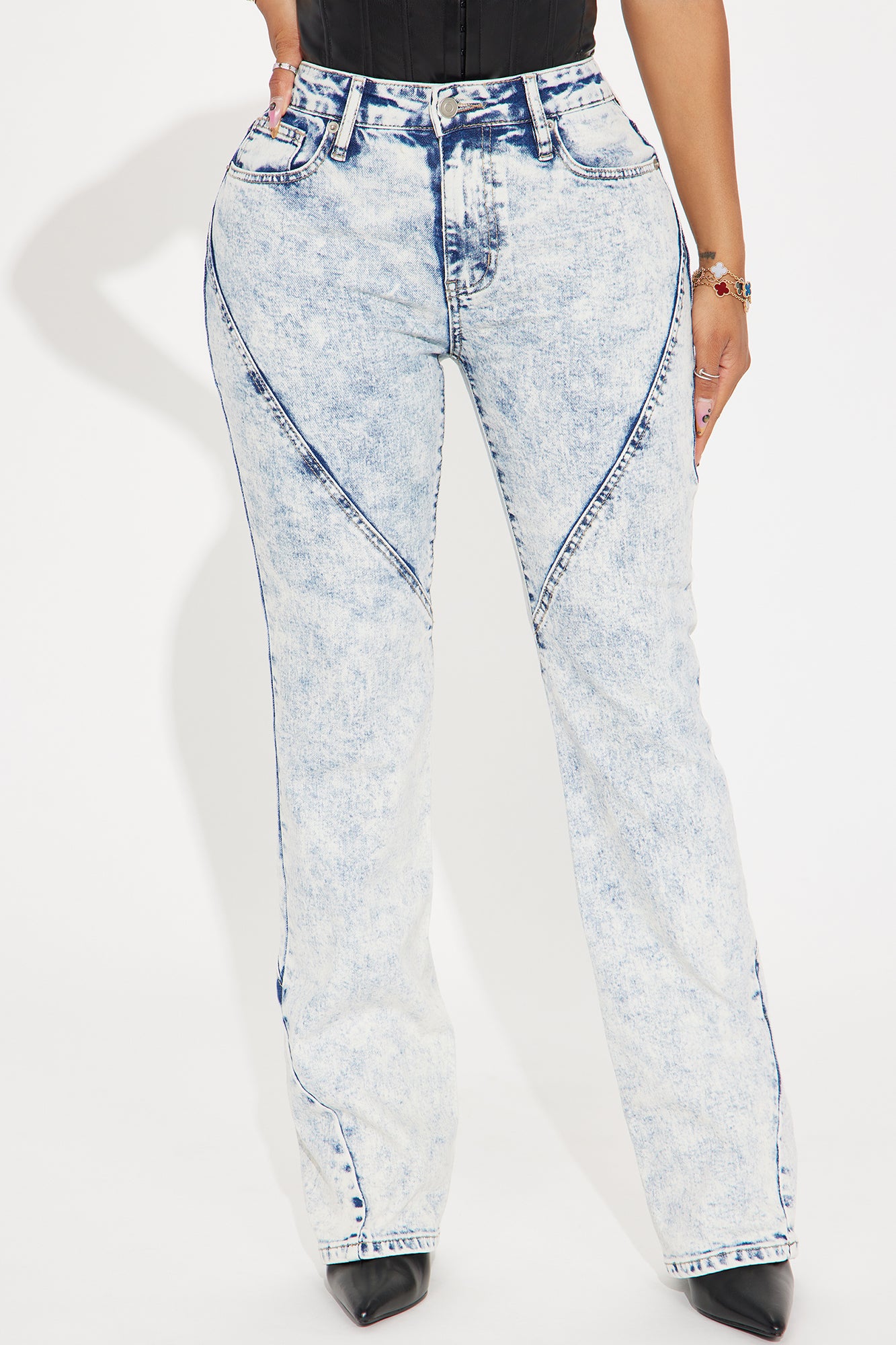 Available In Light Wash. Bootcut Jean 5 Pocket Acid Wash Seaming 10" Mid Rise 32" Inseam Disclaimer:Due To The Specialized Wash Process, Each Piece Is Unique. 99% Cotton 1% Spandex Medium Stretch Imported |