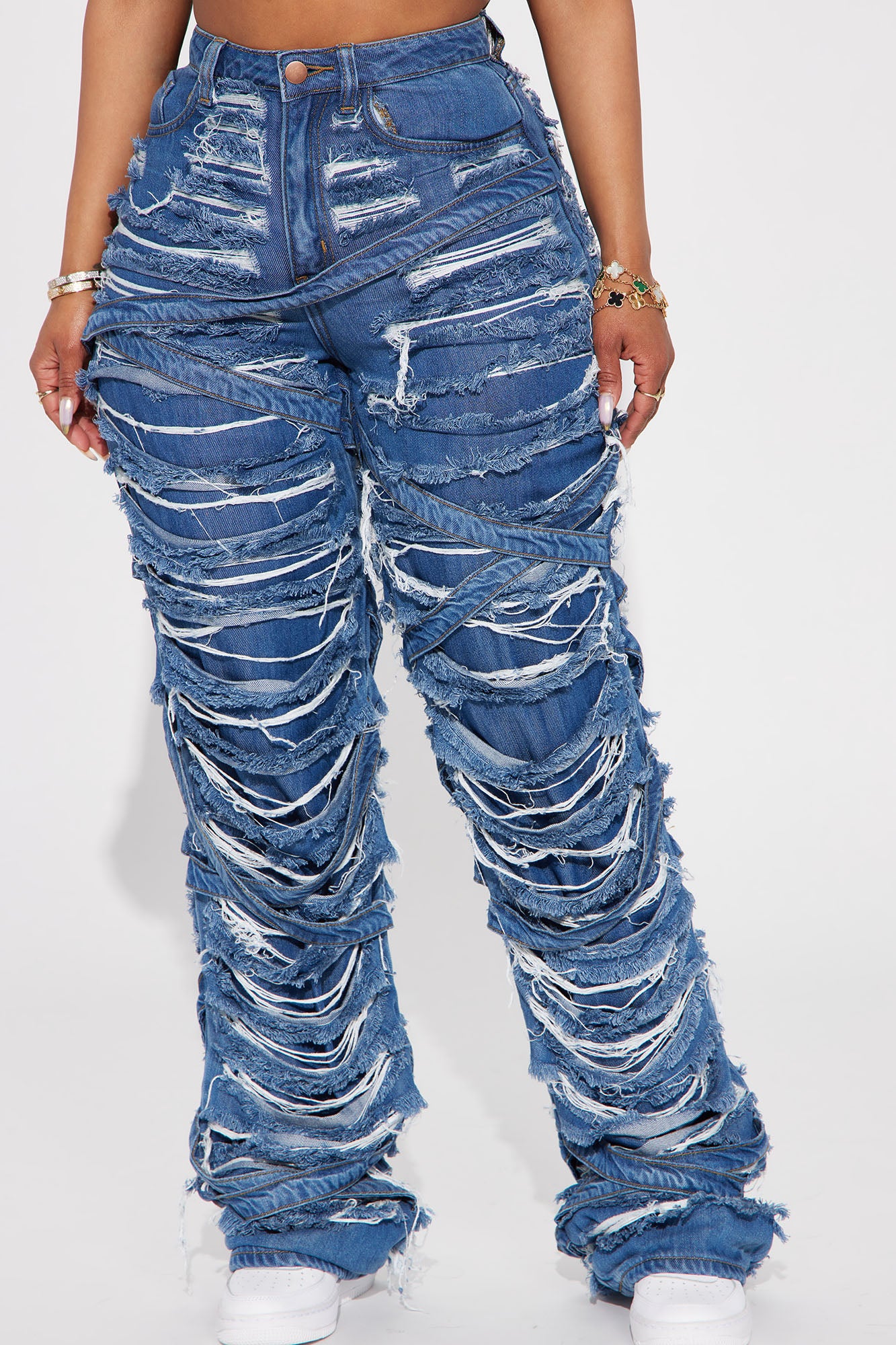 Available In Dark Wash. Straight Leg Jean Shredded Straps 35" Inseam 11" High Rise Non Stretch Disclaimer: Due To The Specialized Wash & Distressing Process, Each Garment Is Unique. 100% Cotton Imported |