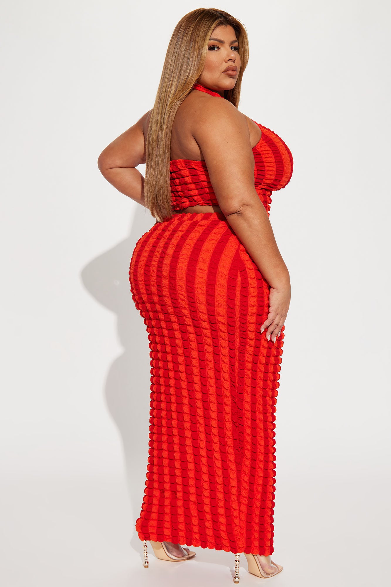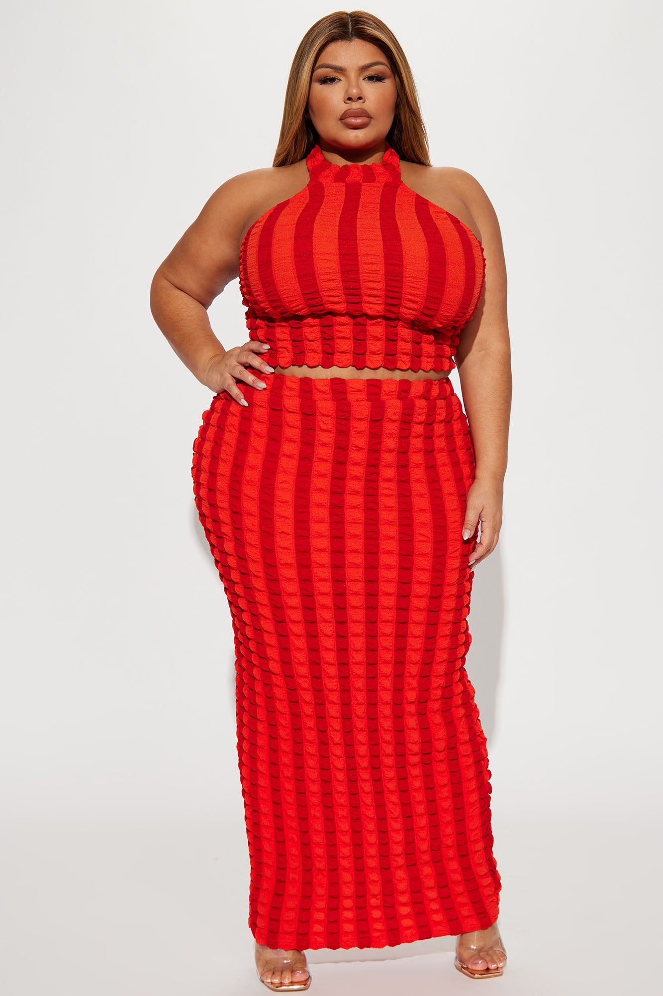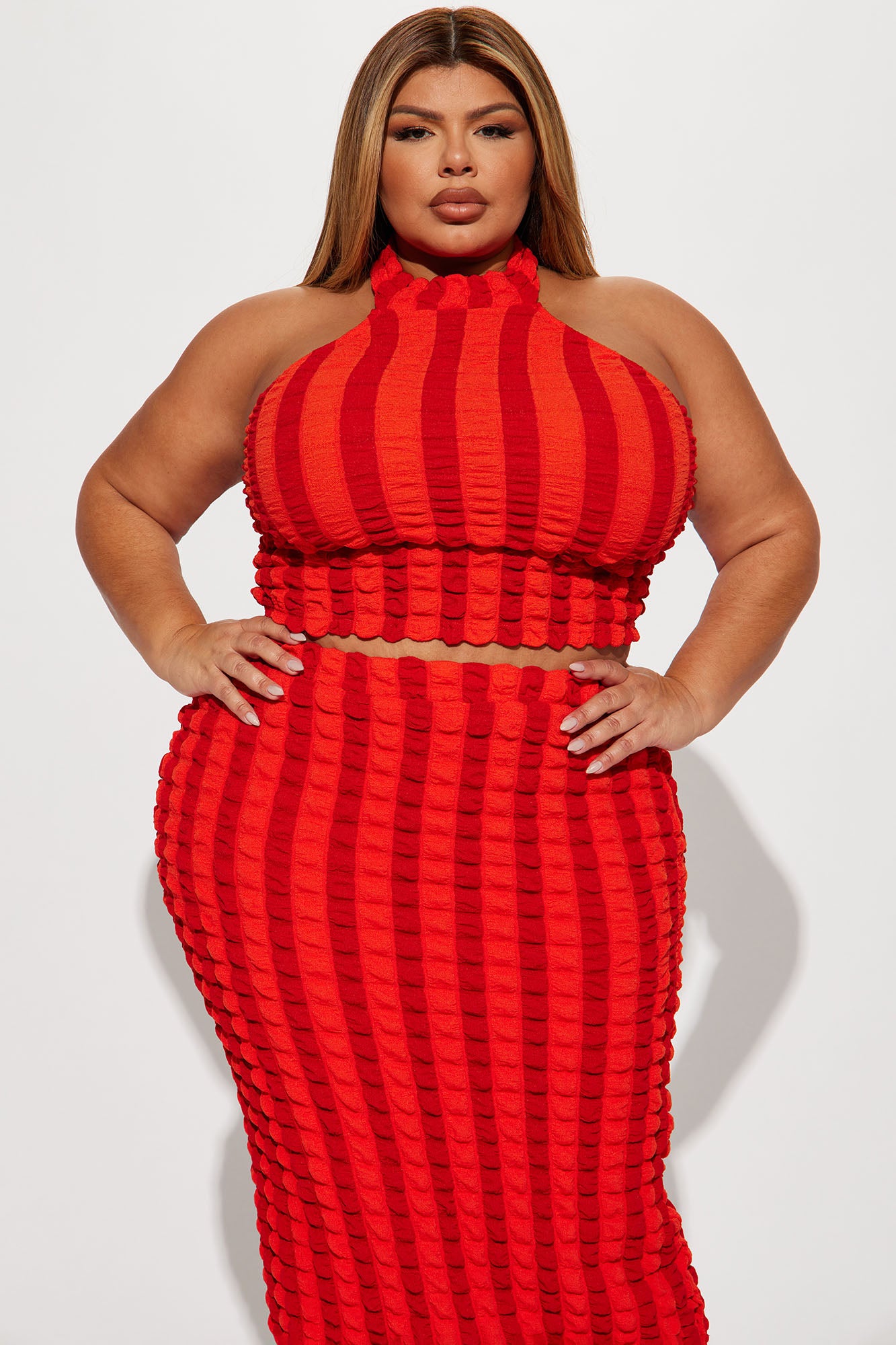 Available In Red/combo And Chartreuse. Bubble Skirt Set Halter Top Mock Neck Back Neck Closure Maxi Skirt Stretch Disclaimer: Stripe Placement May Vary. Self: 95% Polyester 5% Spandex Lining: 100% Polyester Imported |