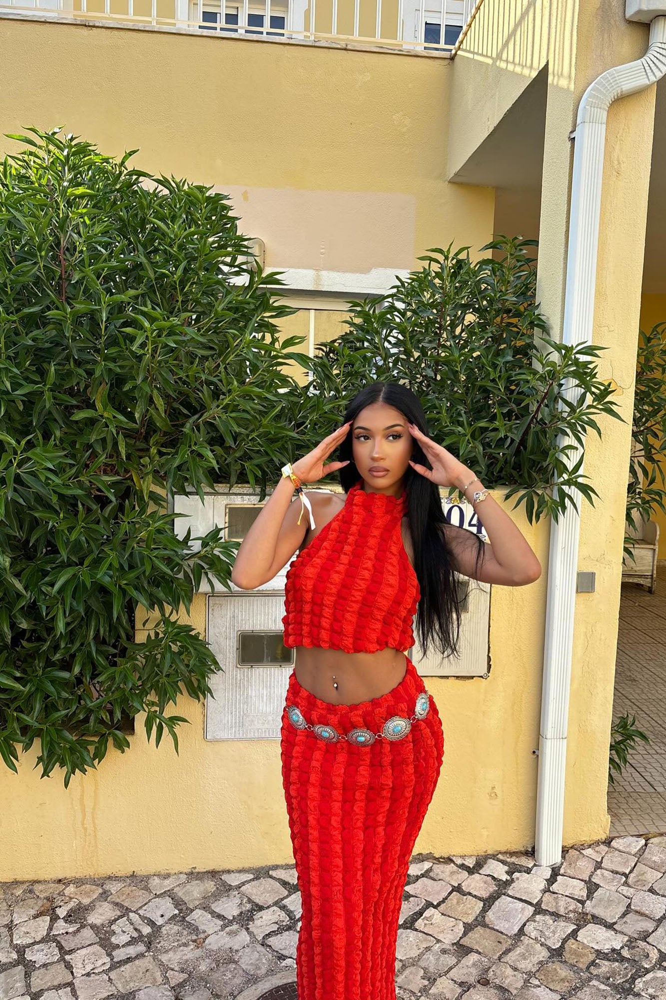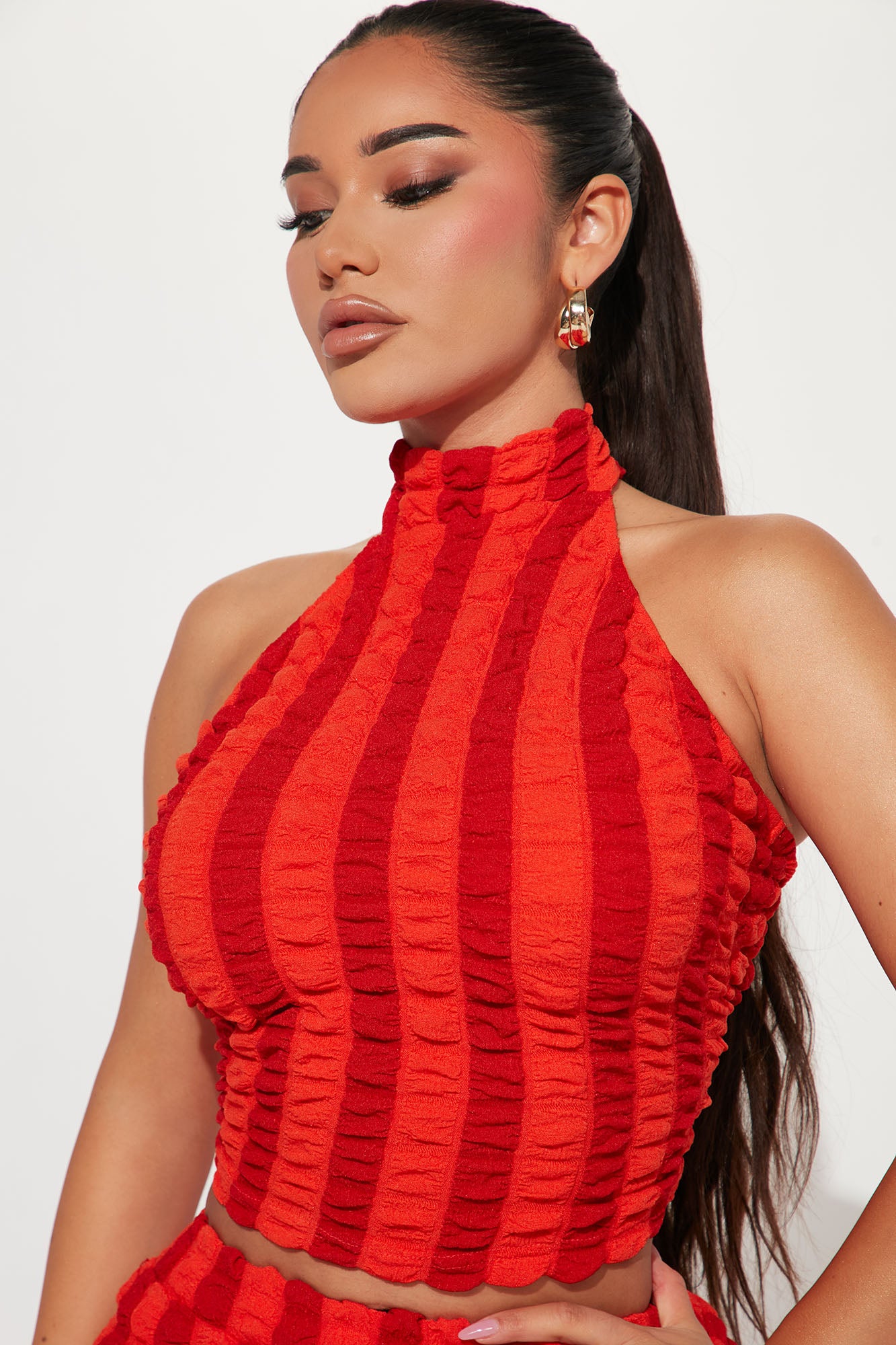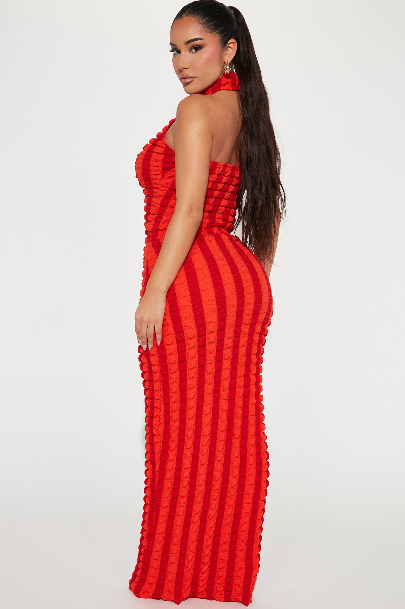 Available In Red/combo And Chartreuse. Bubble Skirt Set Halter Top Mock Neck Back Neck Closure Maxi Skirt Stretch Disclaimer: Stripe Placement May Vary. Self: 95% Polyester 5% Spandex Lining: 100% Polyester Imported |