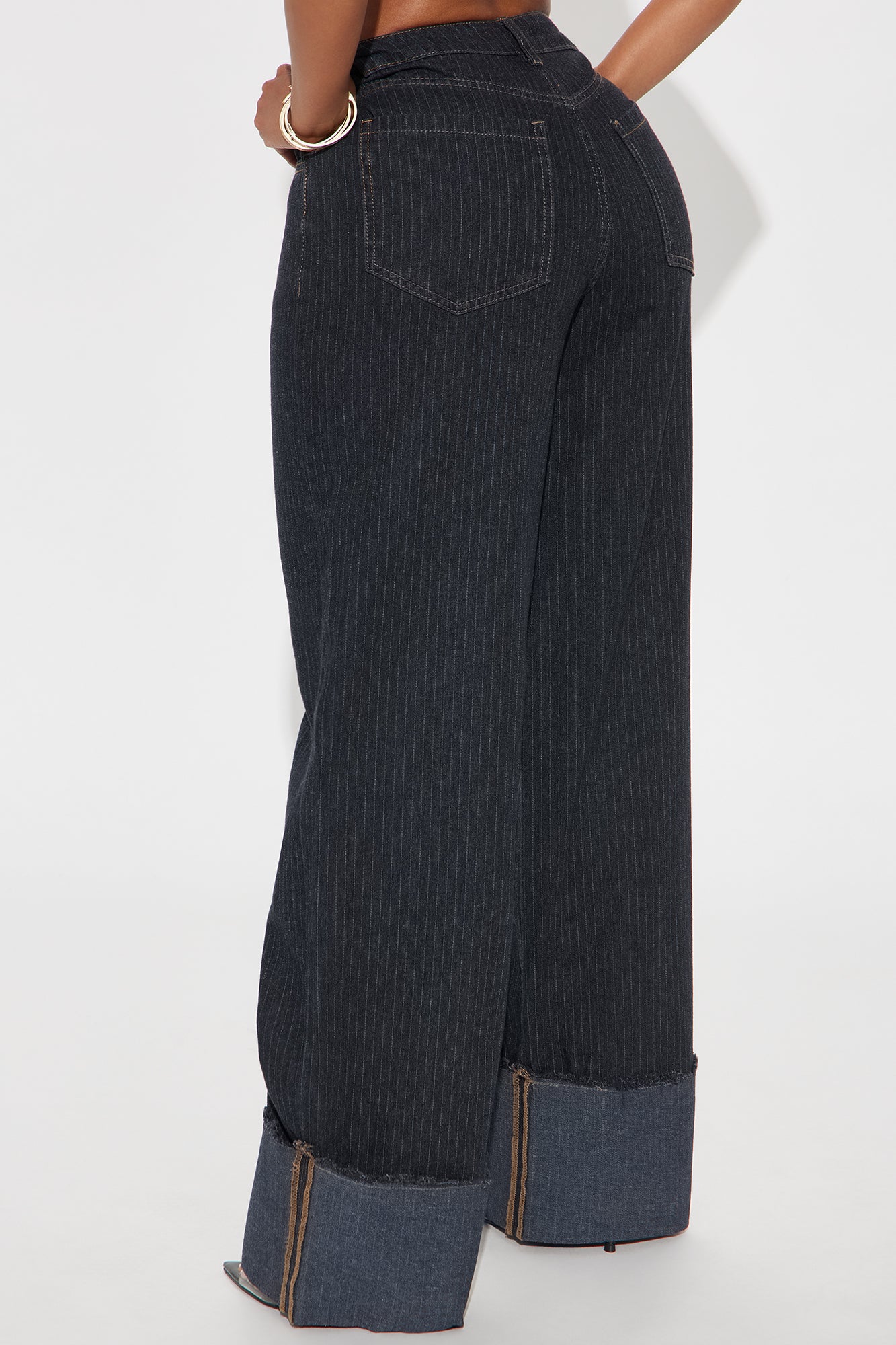 Available In Dark Wash. Wide Leg Jean 5 Pocket Cuffed Hem Pinstripe 11" High Rise 32" Inseam Non Stretch Disclaimer: Due To The Specialized Wash Process, Each Garment Is Unique. 53% Cotton 28% Polyester 19% Viscose Imported |