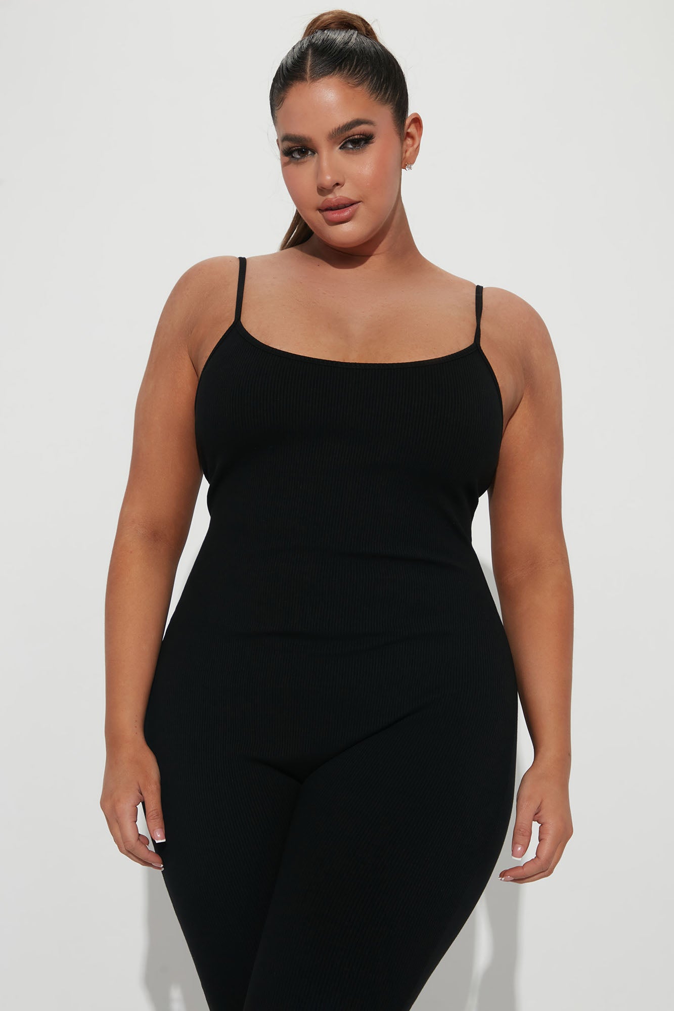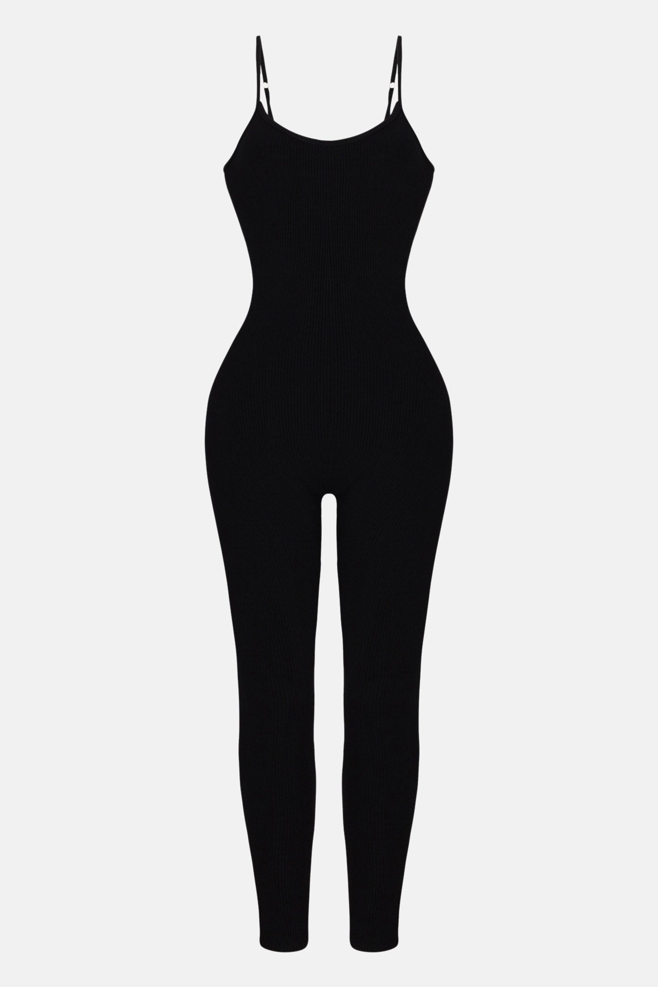 Available In Black, Heather Grey, And Chocolate. Jumpsuit Adjustable Spaghetti Straps Scoop neck Legging Stretch Compression Rib 82% Rayon 18% Spandex Imported |