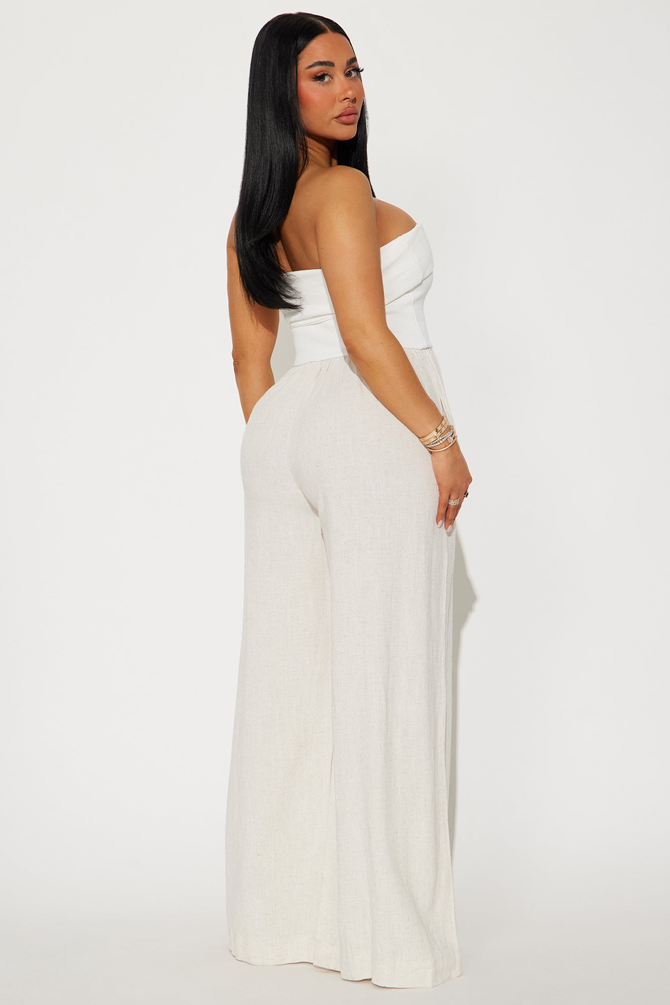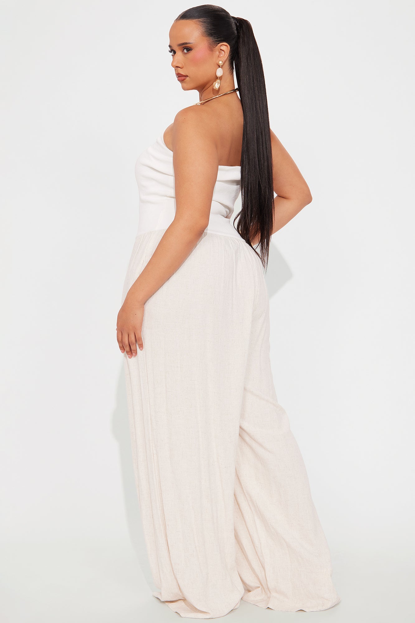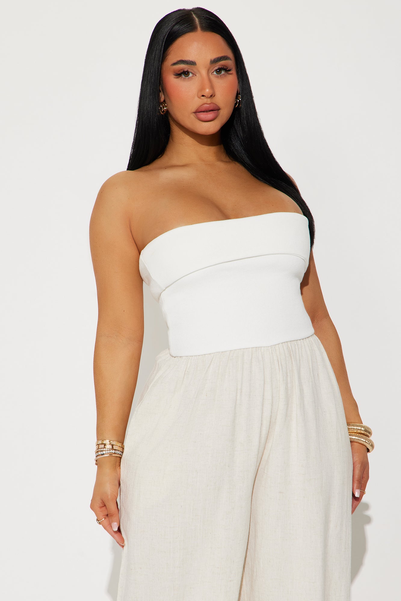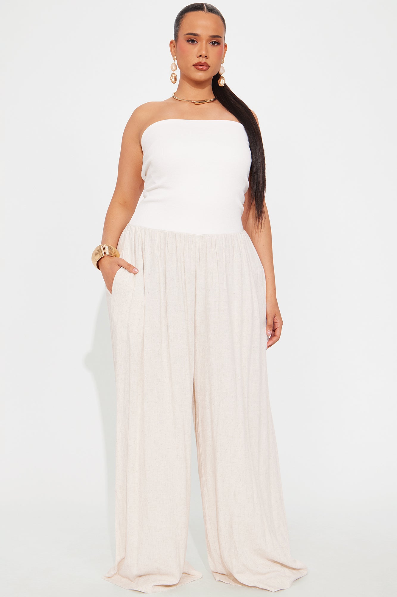 Available In White/Black And White/combo. Jumpsuit Ribbed Top Foldover Neckline Linen Bottom Wide Leg Pockets Non Stretch Self: 80% Viscose 20% Linen Contrast: 65% Cotton 30% Polyester 5% Spandex Imported |