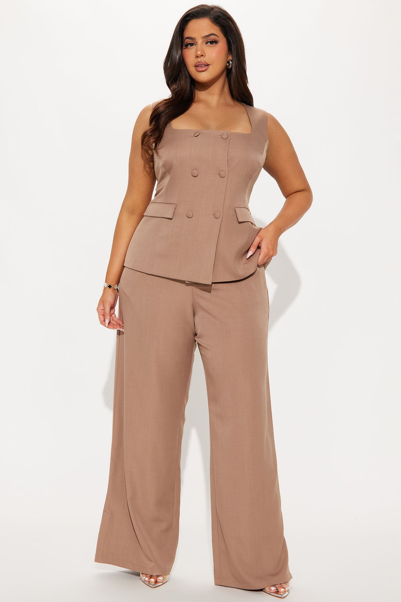 Available In Mocha And Black. Pant Set Non Stretch Vest Square Neck Double Breasted Faux Flap Pockets Wide Leg Pant Clasp And Zipper Closure Pockets 33" Inseam Self: 95% Polyester 5% Spandex Lining: 100% Polyester Imported |