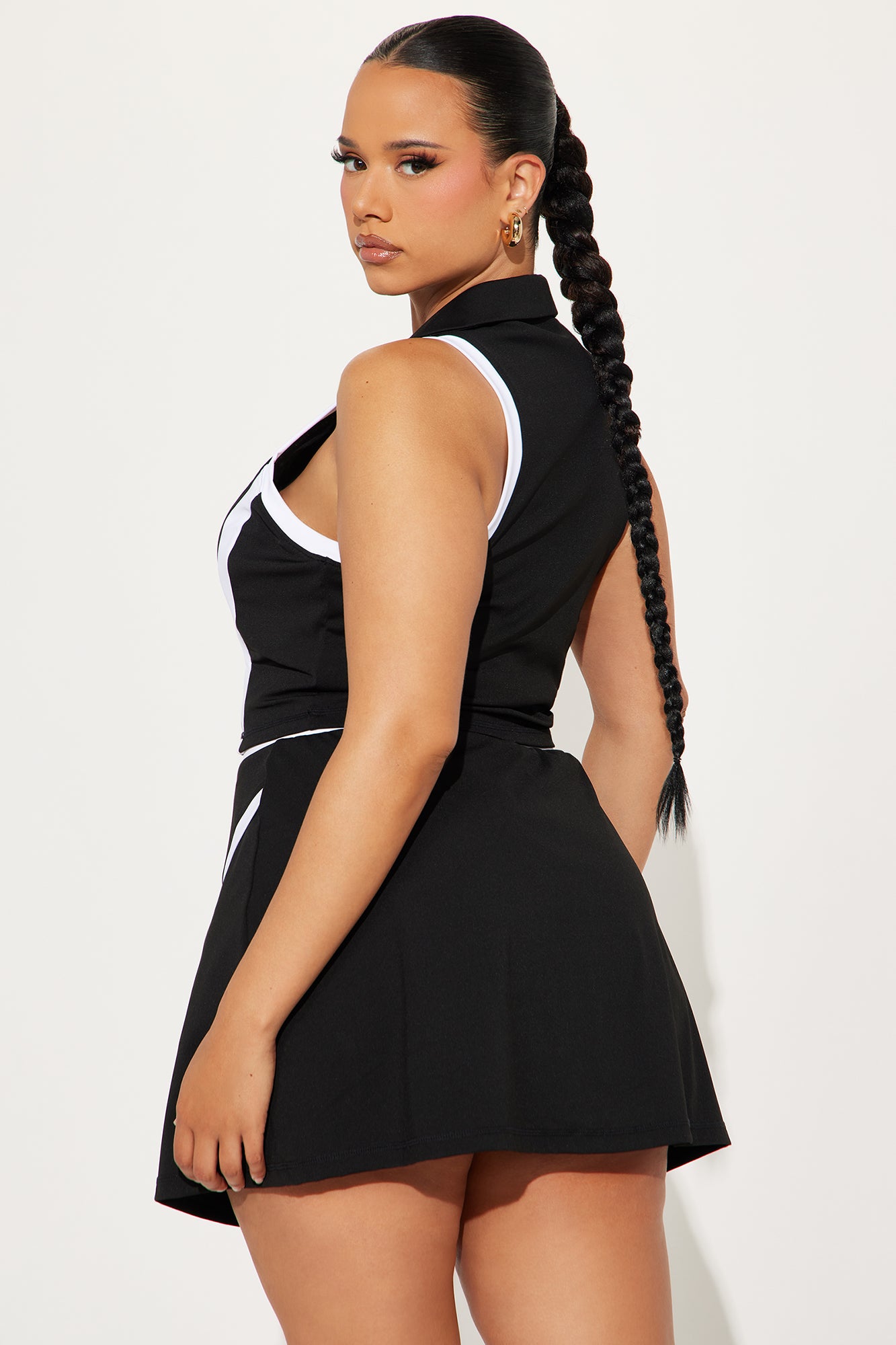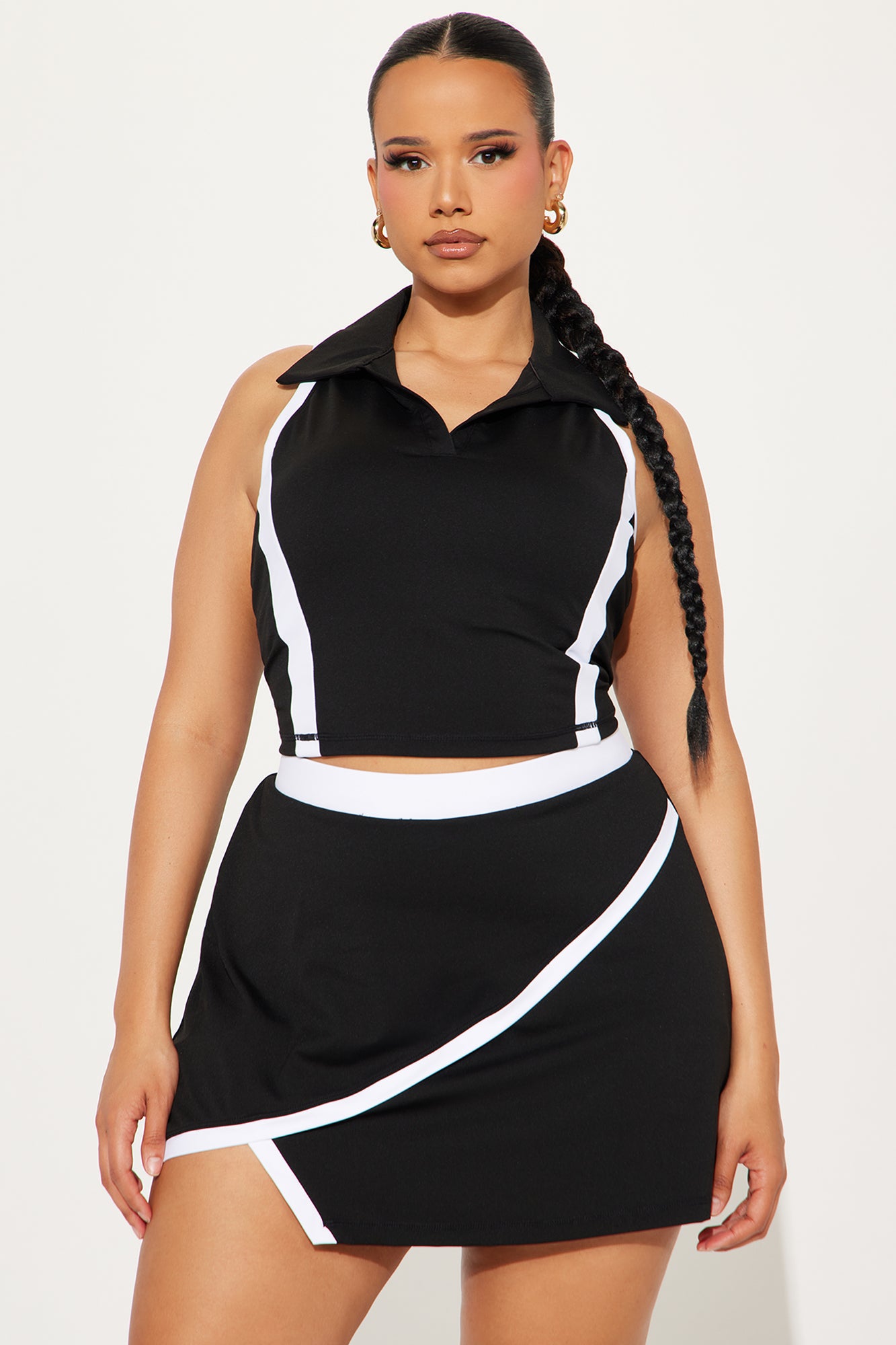 Available In Black. Stretch Active Set Active Top Collar Sleeveless High Waisted Active Skirt Elastic Waistband Contrast Trim Tricot Low Impact Top Shell: 75% Nylon25% Spandex Top Lining: 90%Nylon10% Spandex Short Shell:75% Nylon25% Spandex Imported |