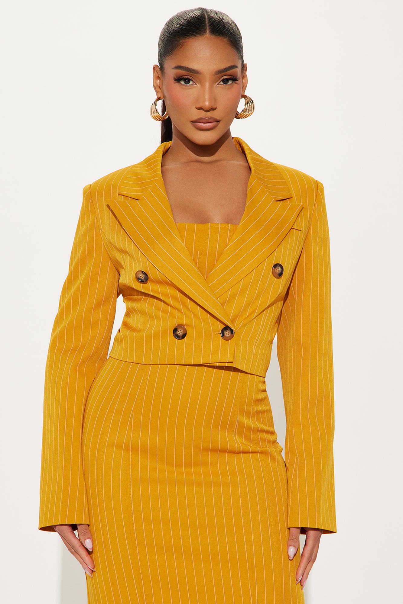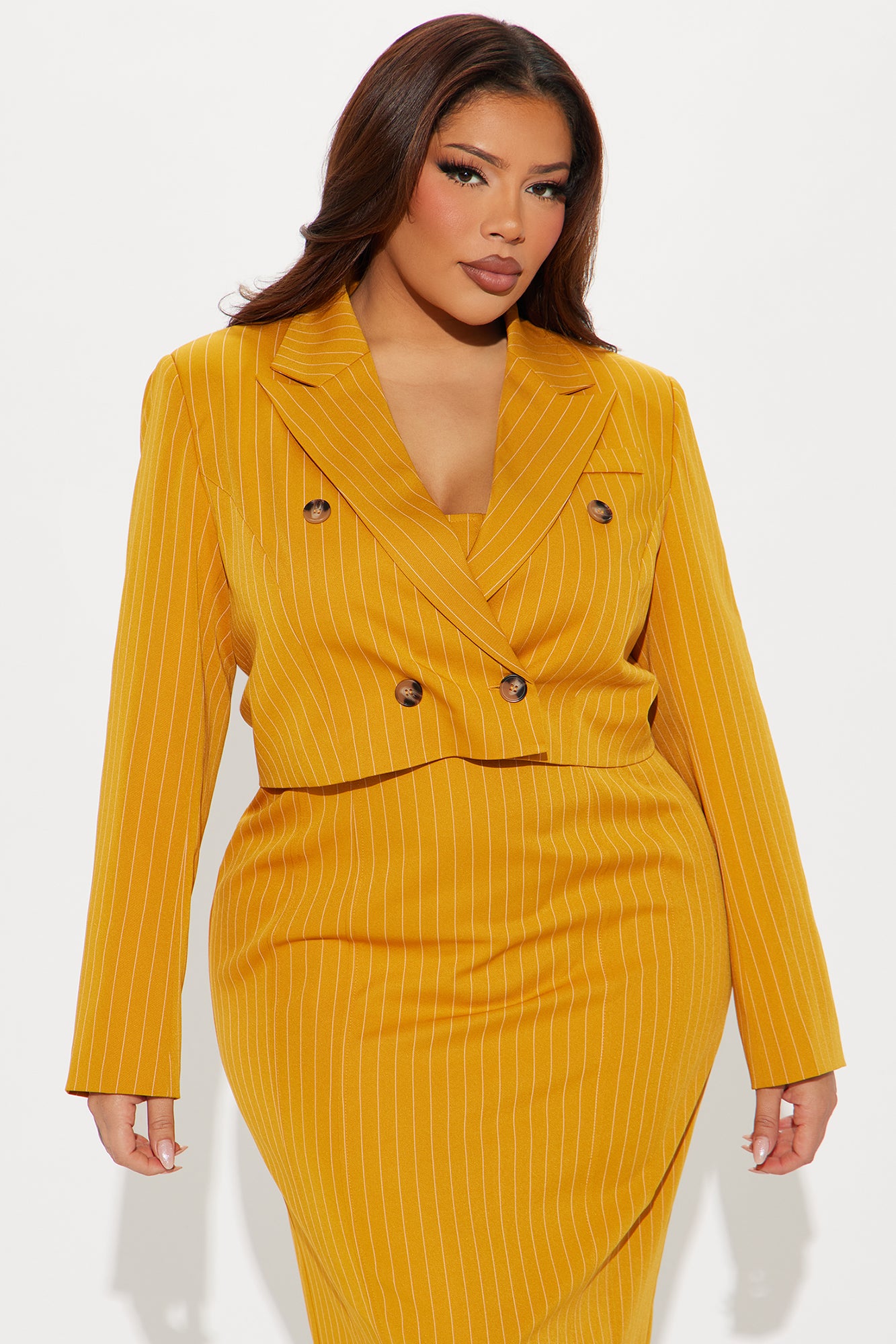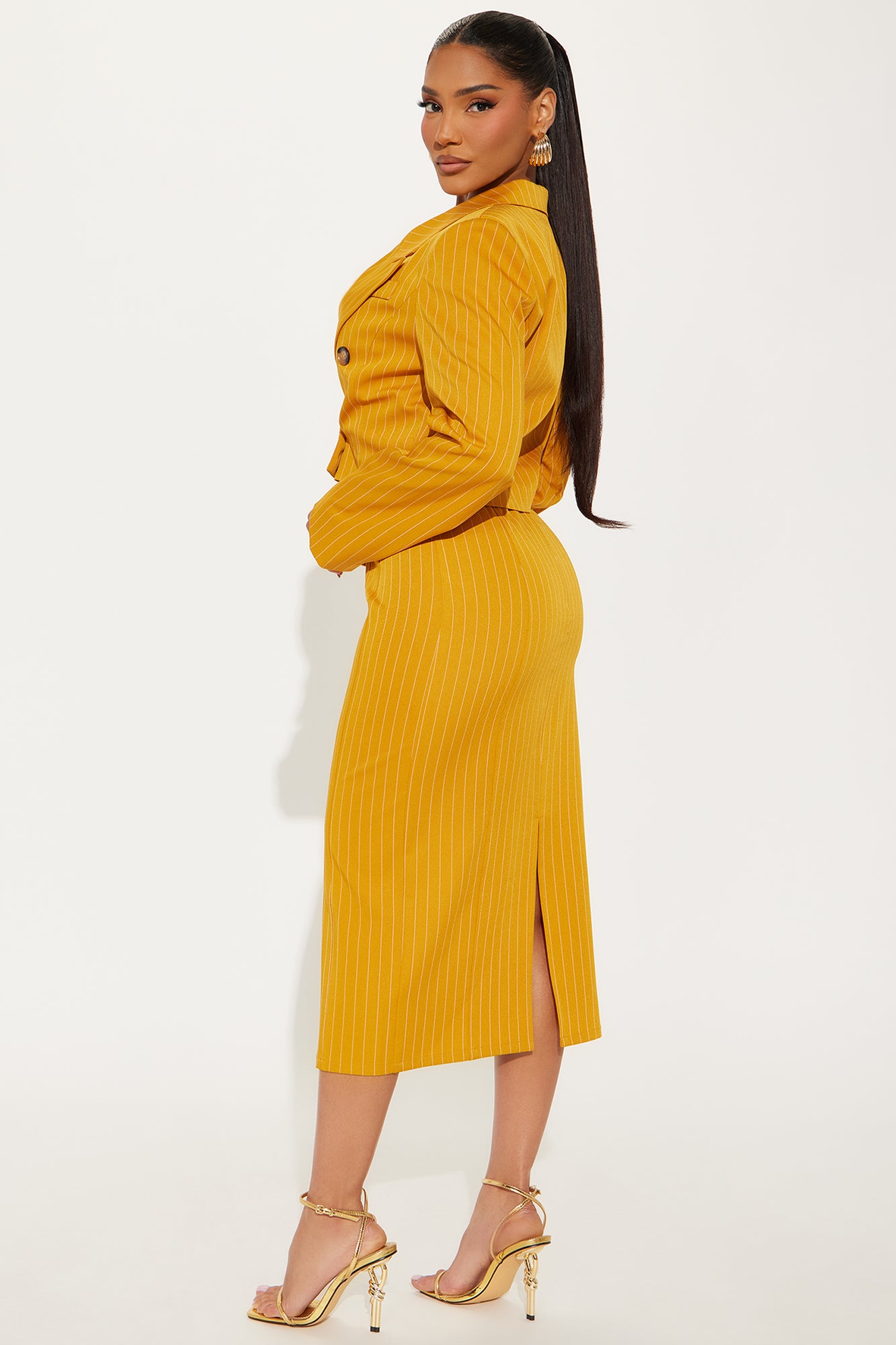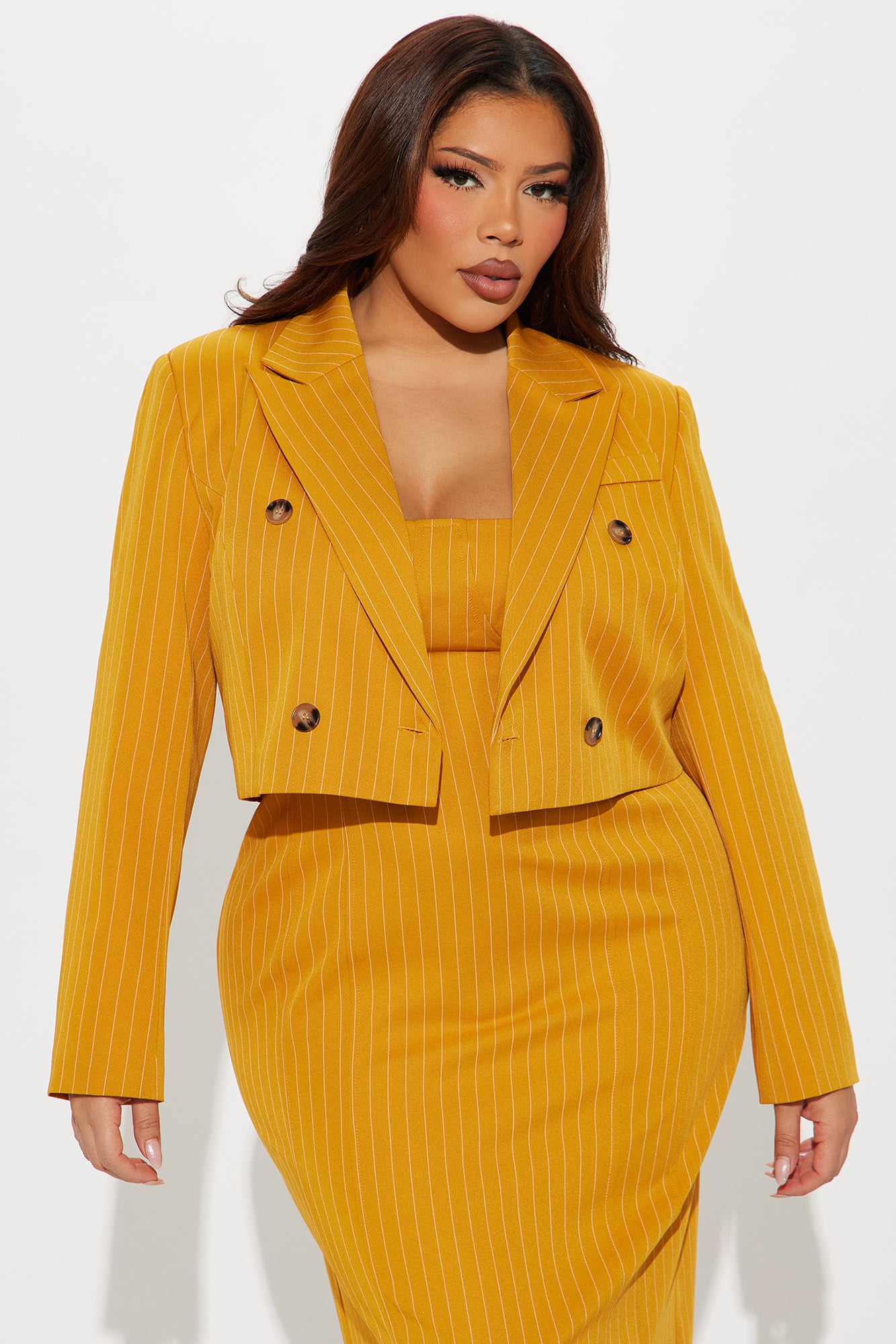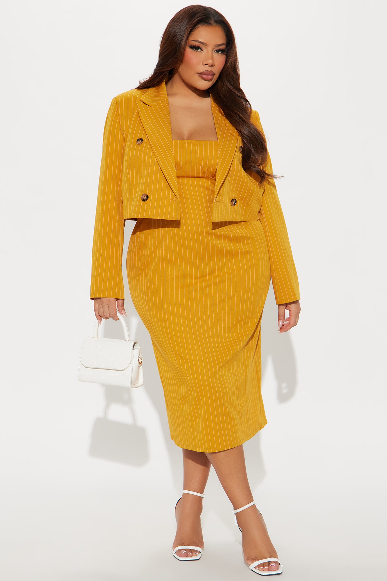 Available In Mustard And Blue. Pinstripe Midi Dress Square neckline Adjustable spaghetti straps Includes blazer Bra cups Back zipper Slit Slight stretch Self: 95% Polyester 5% Spandex Lining: 100% Polyester Imported |